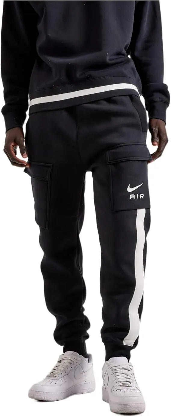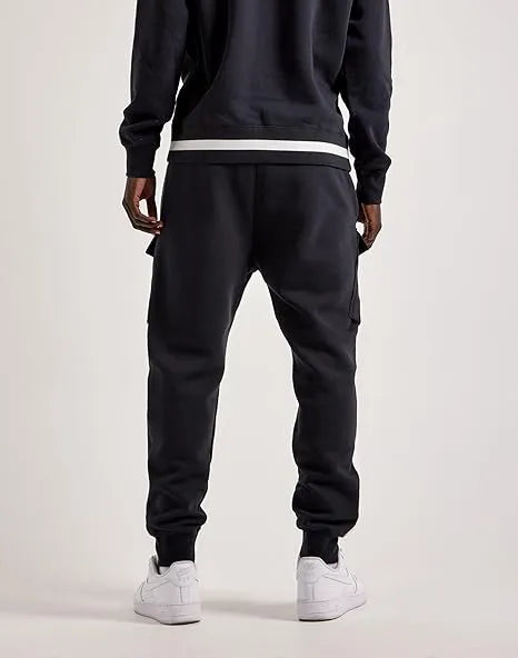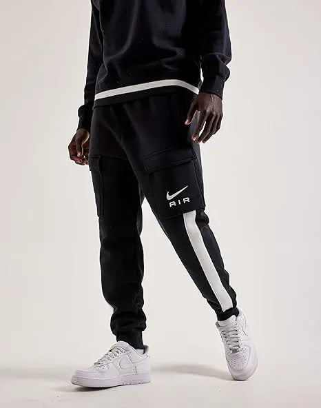 Step into maximum utility and iconic style with the Nike Air Men's Fleece Cargo Joggers in a sharp Black and White colorway. These joggers are the perfect blend of athletic performance and streetwear edge, featuring a striking white contrast panel along the sides that makes the classic Nike Air branding pop. Crafted from ultra-soft, brushed-back fleece, they provide a premium feel and reliable warmth for everyday wear. The addition of secure cargo pockets ensures you have plenty of room for your essentials while maintaining a sleek, tapered silhouette.