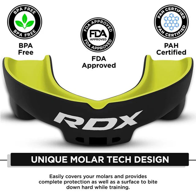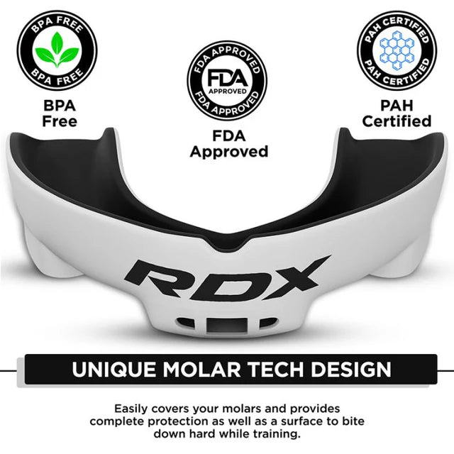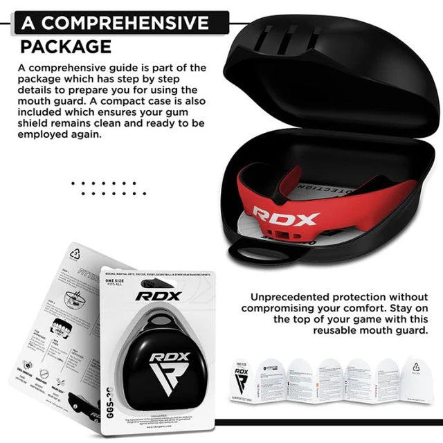 The RDX Adult Mouth Guard is designed to provide superior protection, comfort, and performance for athletes engaged in combat sports and high-impact activities. Made from premium, impact-resistant materials, this mouth guard effectively shields teeth, gums, and jaws from injury during boxing, MMA, karate, Muay Thai, and other martial arts. Its ergonomic design ensures a secure and comfortable fit, conforming to the shape of your teeth for maximum protection without causing discomfort or restricting breathing. The lightweight construction allows for easy speech and breathing during intense workouts or sparring sessions. Heat-moldable technology enables a custom fit, enhancing stability and reducing the risk of slippage during fast movements. Durable and long-lasting, the mouth guard maintains its shape even after repeated use and cleaning. Its smooth surface ensures easy hygiene and comfort for daily training. Ideal for both beginners and professional fighters, the RDX Adult Mouth Guard combines safety, reliability, and performance to give you confidence in every session.