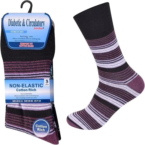 Finished with a classic striped design, these socks combine practical functionality with a clean, everyday look suitable for work, home, or casual wear. Durable stitching ensures long-lasting performance, even after repeated washing. Whether worn with formal shoes, work boots, or casual footwear, these diabetic-friendly socks offer reliable comfort, softness, and freedom of movement for daily use.