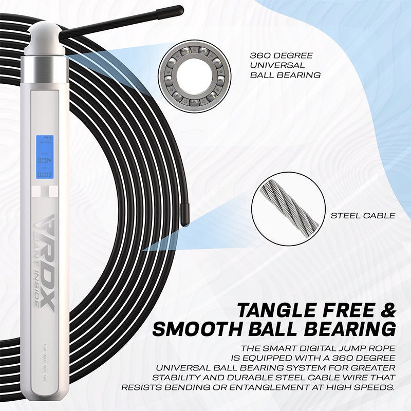 The data accumulated is shared through a cloud based data synchronization tool which connects with a collaborative health & fitness app on the users' smartphone. With our electronic smart skipping rope you get to enjoy 3 interactive skipping modes Free Jumping, Time Countdown Jumping and Numbers Countdown Jumping. Other features include a digital timer, calorie count, countdown timer, historical data, and collection of rich data. A 360° rotation inner ball bearing mechanism allows precision skipping with speed, stability and zero interruptions making it suitable as both, a beginner smart jumping rope for rookies or a high-tech interval training tool for pros. Great exercise tool for all age groups of men, women and kids for losing weight. Available in a striking contrast of black and white with antimicrobial pouch for easy carry and workout manual. Also includes extra 10.3 ft. rope for your convenience.