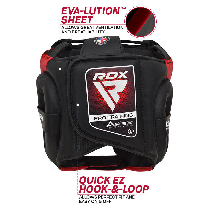 It's time to upgrade your training gear with the advanced taekwondo full-face head guard by RDX. Carefully designed to ensure obstruction-free visibility and keep the head stable during practice sessions. Super skin leather on the outside adds sturdiness and enhances durability. This head protector features a perfect duo of SpongeX padding and Polygonal Fusion Foam around the head and cheeks area to absorb high impact and prevent injuries during fight training at the home gym. Max-shock Equilibrium Foam and comfortable EVA-LUTION SHEET deliver protection to the ears and dissipates force equally without affecting your performance. Our head guard features LumeX padding for extra safety and a seamless training experience. Lightweight and easy to carry boxing headgear is highly durable and built to last. Quick E-Z hook-and-loop closure of the headgear allows easy and convenient fit. CE certified.