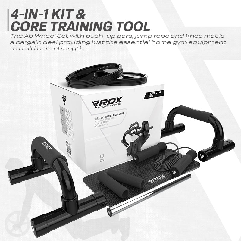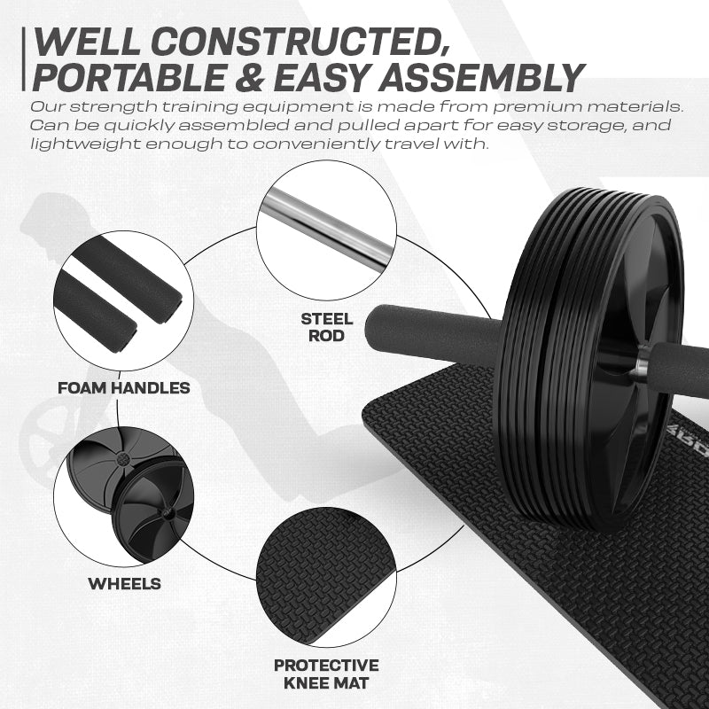 Ab roller wheel set is your all-in-one home fitness solution. Ultimate equipment for those with a tough schedule to develop upper body, lower body, ab and other core muscles at home. Burn calories, get stronger, leaner with ultra-wide exercise roller pro ab wheel set. Comes with thick knee pad for extra protection to your knees and added comfort with ultimate grip, can withstand more weight than other ab wheel roller kits. Slip-resistant pushup bars to support any weight and high intensity training. Handles of these bare are covered with foam to give an ultimate soft grip. Our exercise roller is perfect for home gym and can easily bear weight up to 660 lbs. Seam less workout routine with safe grip from anti-skid TPR rubber wheel. Long-lasting 10ft PVC cable with sweat absorbent EVA foam handles can be adjusted to athletes specific height and use. Each package includes an ab roller, a jump rope, a knee mat and a comprehensive workout guide. Achieve your fitness goals with ease anywhere anytime with easy to assemble ab wheel roller kit. Tailor-made for home gym and can be taken anywhere with you.