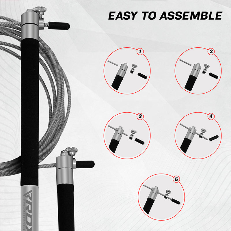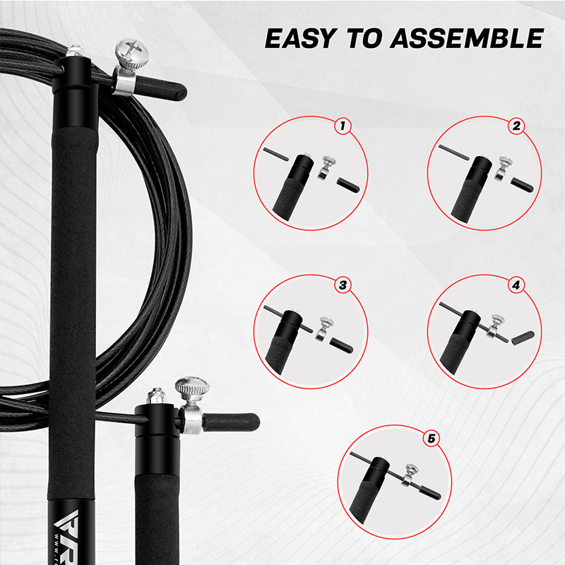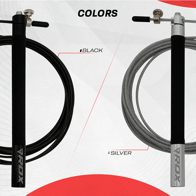 Increase your stamina, improve your footwork and hand to eye coordination skills by incorporating the best exercise equipment to your fitness routine, RDX Speed Jump Rope. Made from premium quality materials, this essential strength training equipment is built to last through your fitness journey and is a must-have for any home gym. PVC coated cable-wire is durable enough to withstand rigorous training sessions while the swivel mechanism allows you to create rhythmic swift jumps at high speeds. The protective PVC casing maintains the integrity of the inner steel cable on collision with abrasive outdoor surfaces. Non-slip polymer (PP) handles provide a firm grip for your hands even when they get sweaty. This gives you better control to build momentum, which makes this fitness skipping rope equally effective for pros training for long hours and fitness enthusiasts working out from their home gyms. Our Speed Jump Rope is a versatile equipment that you can use whether you're a beginner trying to develop agility, a boxer aspiring to better your balance, or an XFit enthusiast wanting to test your endurance. The 10.3 ft. extra cable wire is completely adjustable so you can set it to your required size instead of cutting off excess wire. The ergonomic design of this sleek jump rope ensures comfortable use and high performance. A lightweight portable built allows you to conveniently carry the speed rope with the workout guide in its antimicrobial pouch outdoors for a quick session in fresh air. Black and silver colours complement the simple aesthetics of this speed skipping rope.