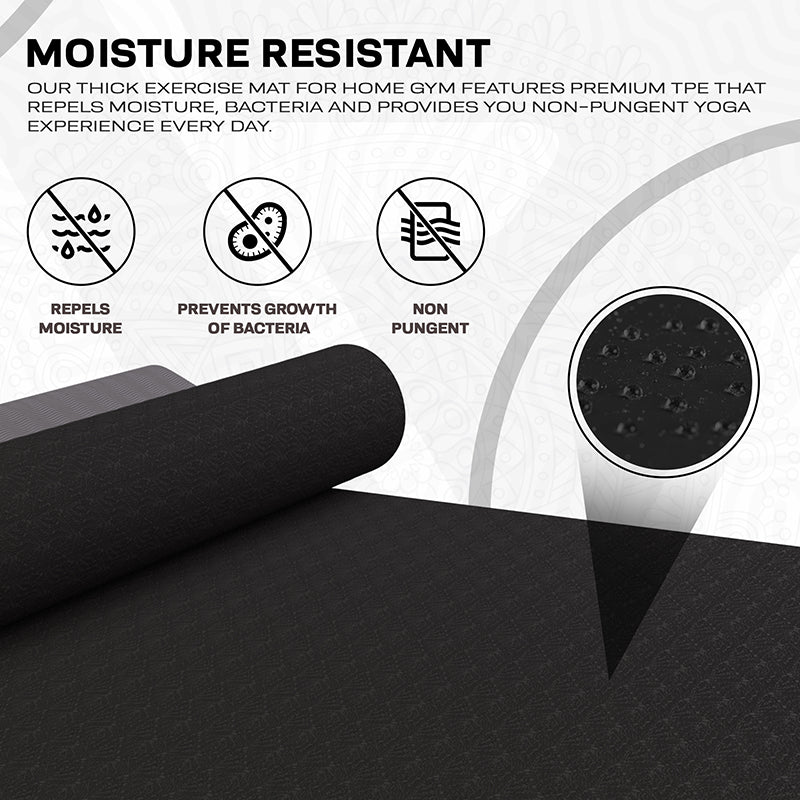 Manufactured from premium TPE, our mat surface is non-absorbent, water-resistant and prevents odour build-up and accumulation of dust and sweat. Double layered, tear-proof construction in 183x61x0.6cm dimensions ensure the exercise mat is durable enough for home gyms and built to accommodate users of all sizes. The anti-skid/anti-slip surface prevents slippage and offers a firmer grip during intense poses ensuring fluid movement.