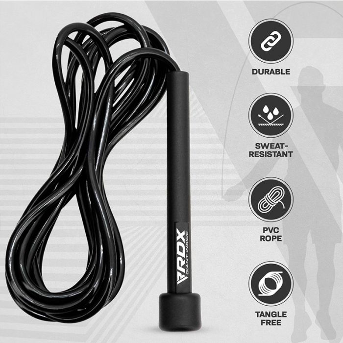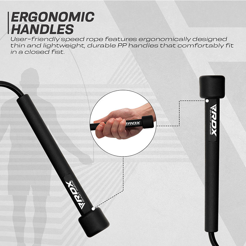 Improve your speed, coordination and endurance in absolutely no time with the RDX Skipping Rope. Made with a PVC-coated 5mm wire, the rope is 9 feet long with thin handles that have been designed to distribute weight evenly. Blister plugs at the end of each handle helps with friction.