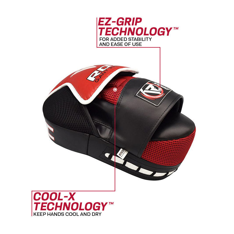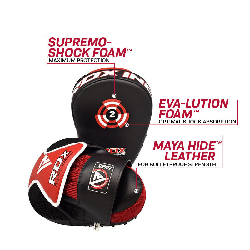 These pro level boxing pads are designed to help you perfect your hook and jab technique, boosting both accuracy and speed for boxing, cage fighting or Muay Thai. The tough Maya Hide leather construction makes these focus mitts virtually unbreakable, the shock resistant double foam padding helps '' to protect your hands, temperature management technology keeps you cool and dry under pressure, and the superb grip gives you the stability you need to excel with your strike practice. These hook and jab pads can take all manners of punishment and will last for years to come.