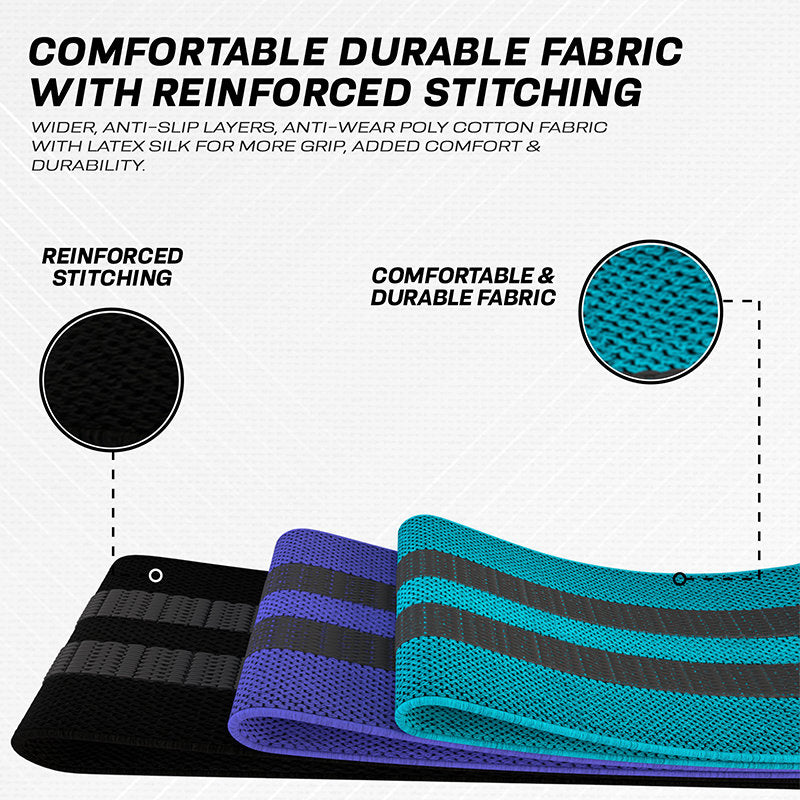 • COMFORTABLE DURABLE FABRIC WITH REINFORCED STITCHING- our fabric resistance bands features wider design and anti-slip layers for extra durability and comfort. Anti-wear premium poly-cotton fabric of strength bands with latex silk for more grip. These bands are highly elastic and can withstand the most grueling workouts. Our fabric resistance bands are not easy to break because of reinforced stitching. The neat edges ensures that the resistance band will not roll up or down during workouts.