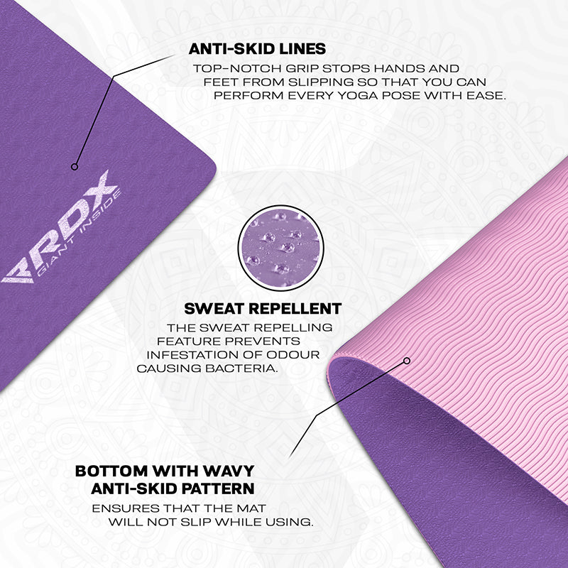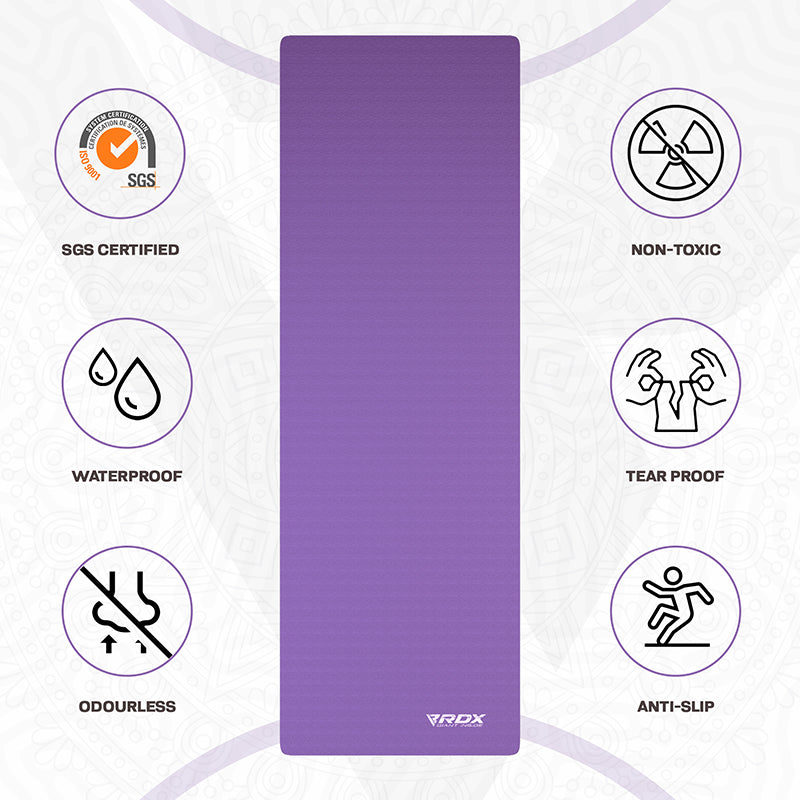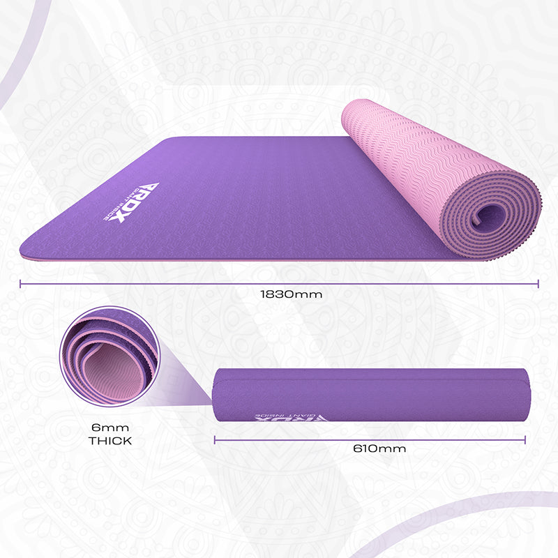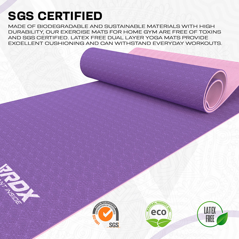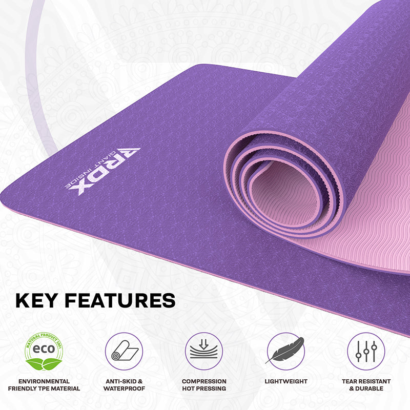 Begin your yogic journey by developing a sense of abundance and aligning your divine energy to discover perfect balance of mind, soul and body. RDX's extremely soft, non-slip texture, biodegradable TPE yoga mats offer comfort and security at an affordable, budget price. Our TPE Yoga Mats are SGS certified and free of toxins. High density, fine-textured foam top surface of 6mm thickness provides higher rebound resilience to these mats to protect joints and facilitate all types of workouts yoga, Pilates, physio or toning exercises.