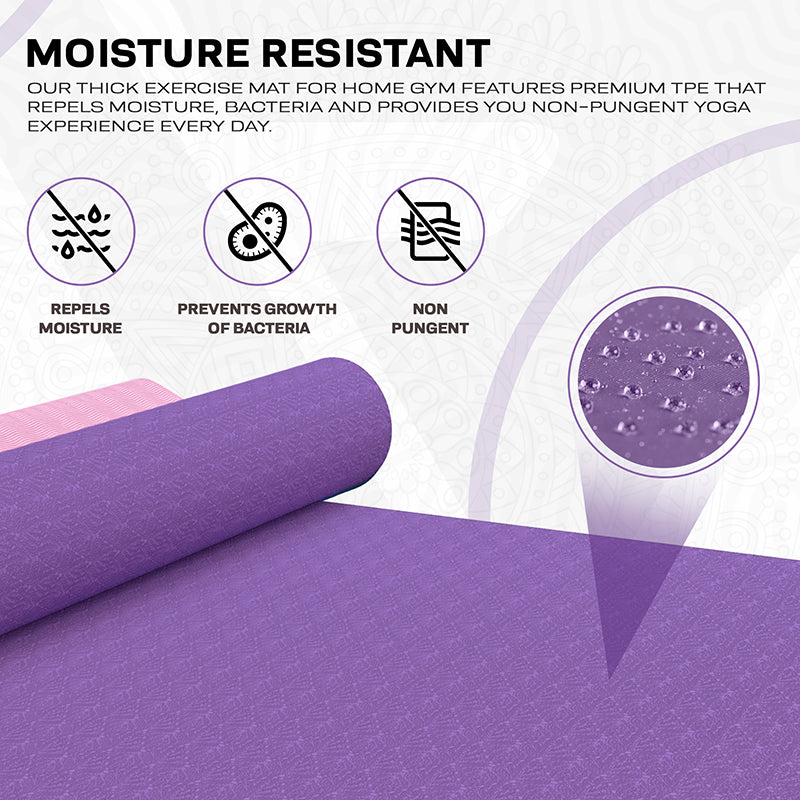 • MOISTURE RESISTANT- Our thick exercise mat for home gym features premium TPE that repels moisture, bacteria and provides you non-pungent yoga experience every day.