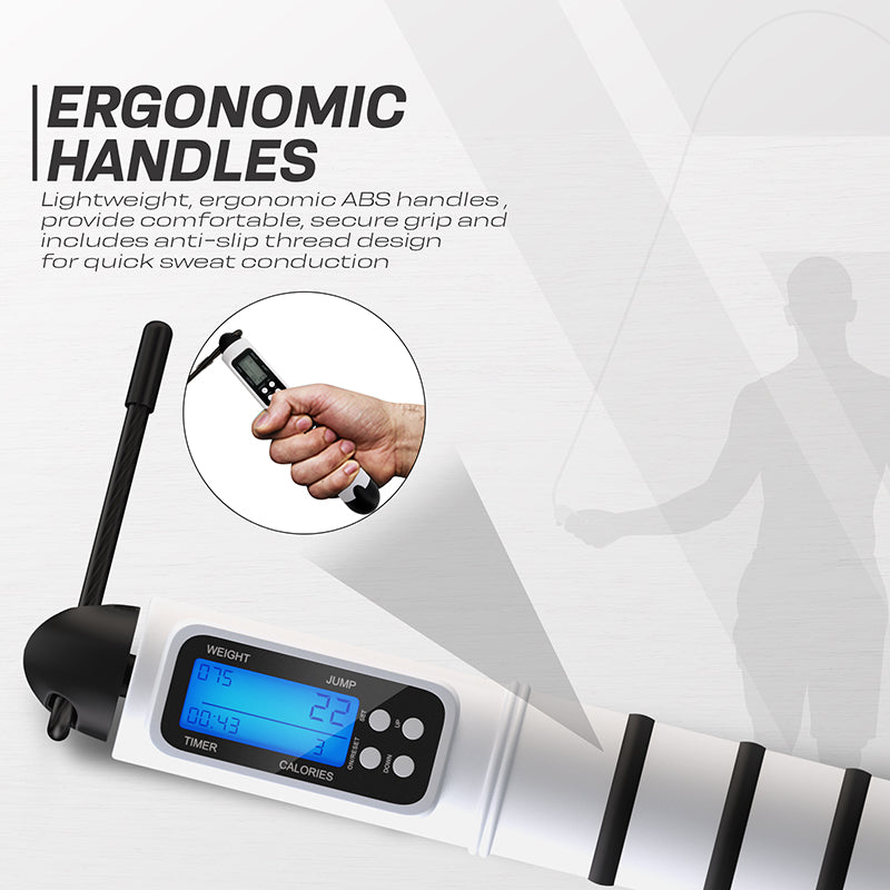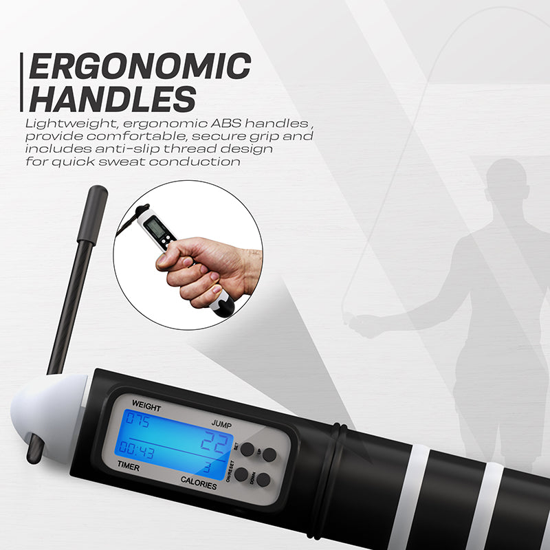The RDX multifunction jump rope combines old-school workouts with technology to deliver a more fun and immersive training experience. Our jump ropes with fitness counters are suitable for a variety of exercises to improve stamina and mobility. Equipped with non-slip ergonomic ABS handles, RDX's digital jump ropes provide a comfortable and firm grip so you can keep pushing yourself during workouts. Integrated HD LED display timer and calorie & jump counter functionalities offers precise summary of your workouts to keep you motivated. The steel cable is fully adjustable to match the height of the user and PVC coated to prevent accidental injuries during skipping. Our calorie counting skipping ropes are equipped with a unique swivel mechanism that provides a complete 360-degree rotation for a smooth workout without breaking rhythm. The digital display is powered by a long-lasting rechargeable battery which enables working out at home or away with convenience of use - making it the perfect choice for light cardio in between HIIT or weight lifting training at the gym or at home. Indulge in cardio endurance, stamina building, muscle toning as well as boxing, MMA and improving footwork and hand to eye coordination with our revolutionary multifunctional skipping rope. Available in black and white colours that are in sync with the modern aesthetics of this digital jump rope. Comes in its own antimicrobial pouch for easy carry with complete workout guide.
