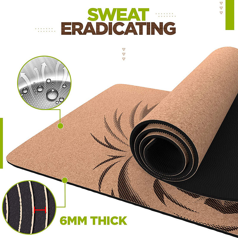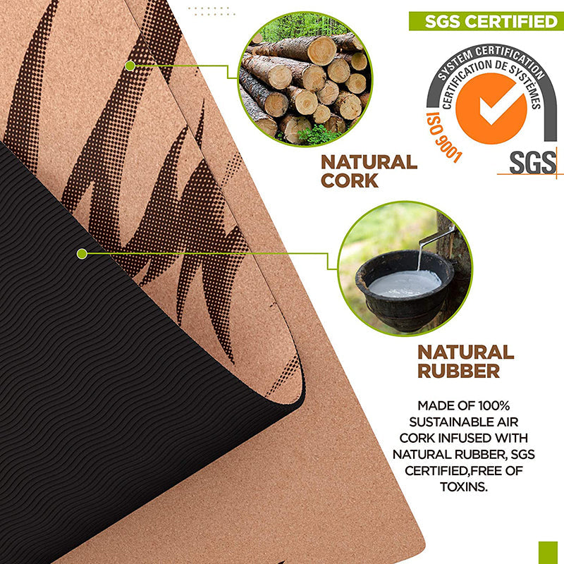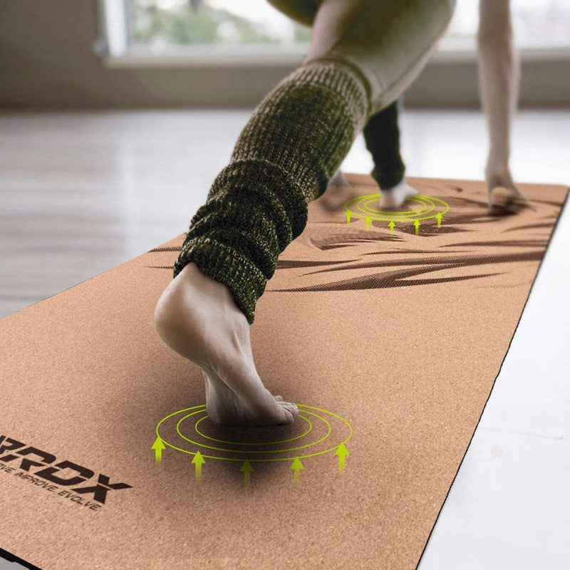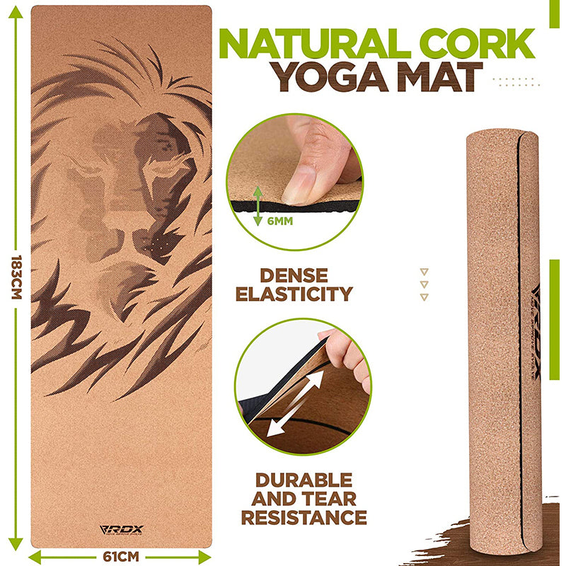 Improve your health and wellbeing while giving back to the environment with RDX's air cork yoga mat. Derived from sustainable sources, these eco-friendly yoga mats are made from premium quality air cork infused with recyclable rubber for professionals and environmentally conscious yogis.Completely non-toxic and SGS certified, our premium organic air cork yoga mats are free of odour and toxins. 100% natural air cork material provides warm hand feel for greater comfort, excellent rebound and insulations against cold and dampness, coupled with our standard 6mm thickness to protect joints from impact. Easy to clean with a wet wipe down, our dual-layer, tear-proof and high resilience gymnastics mats naturally displace moisture for extraordinary gripping power during sweaty workout sessions at home gym. Non-slip smooth rubber bottom prevents slipping during stretches, floor exercises and advanced movements at-home gym.Beautifully minimalistic design and optimal weight in 183x61x0.6cm dimensions makes these earthy-toned natural air cork exercise mats an essential for yogis of any shape or size. Our high-end thick yoga mats are sweat and dust resistant, absorb sound as well as counter surface wrinkles and creasing. Included bag and strap in our thick natural cork exercise mat allows greater freedom to pack up and continue practice at-home gym, studio, beach or on the go. Our aerobics mats are made of biodegradable materials that are lightweight, portable and easy to carry. Choose from our favourite cork mat designs.We understand your need for a wholesome yoga experience to explore deep connectivity with the earth. In honour of those beliefs, on every purchase of our cork yoga mat, RDX donates a percentage of the sale amount towards plantation of new cork trees, which means 10 new organic cork trees get planted every time you buy our KAYA Air Cork Yoga Mats.