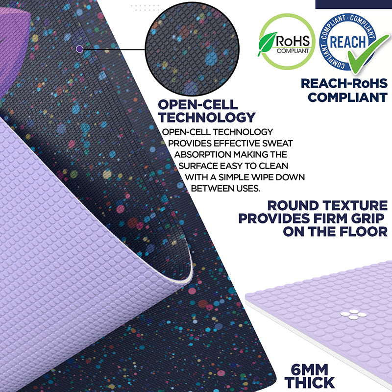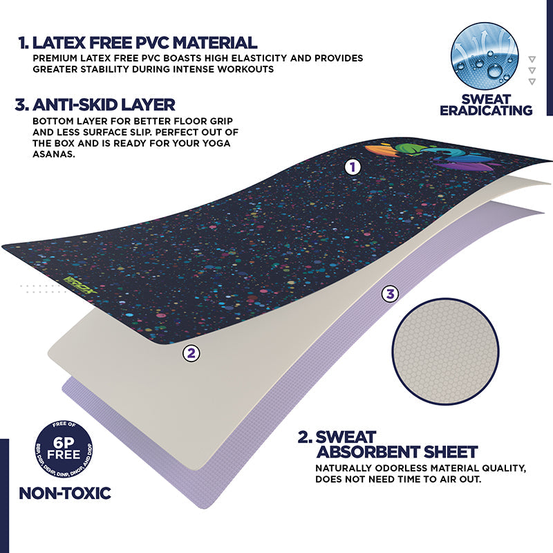 Submerge yourself into the wholesomeness of yoga with 6mm of cushioning to protect your joints and keep you warm as you weave through the session at home. If you are interested in standing exercises like the Ashtanga yoga then you need a mat that gives you a steady base with a firm grip on the floor. Our studio standard, 6mm thick PVC Yoga mats offers your joints the protection they need. Whether you are a seasoned yogi searching for the perfect cardio workout mat, a pilates enthusiast looking for a suitable pilates mat for home or would like a pro fitness mat for other floor based routine, this mat is for you.Our budget friendly exercise mats are 6P & latex-free for a non-toxic, wholesome yoga experience. Open cell technology not only manages sweat but prevents the buildup of germs and pungent odor.The dual-layered, tear-proof, esthetically designed mat is easy to clean and maintain. Including a lightweight carry strap and bag.