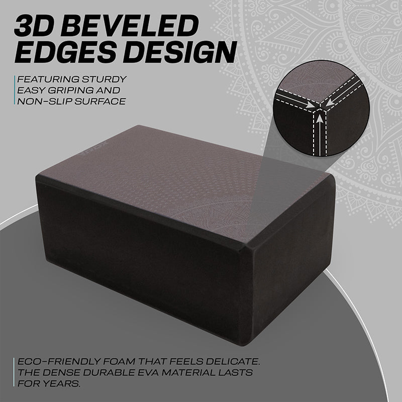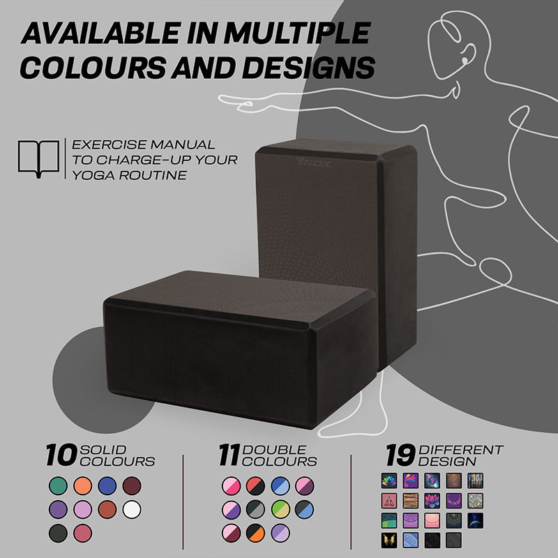 Cultivate healthy energy flow by bringing balance and alignment in your form and everyday life with the RDX EVA Foam yoga blocks. Made for beginner and intermediate yogis alike, this sturdy foam yoga block provides strong support for your bridge poses, and comfortable lift to perfect your alignment in the crescent moon stance. Add this optimally sized yoga block (23*15*9.8cm) to your home gym essential and yoga accessories for increased versatility in your practice.Lightweight and compact design facilitates block-assisted yoga practice anywhere whether it's in your room or under the shade of a giant oak tree. It also retains shape after all sorts of compressions for long-lasting durability. Eva foam material offers a non-abrasive surface that increases comfort while you flex and stretch out during practice, or ease-into restorative poses. Use the yoga brick under your hands and feet to deepen stretches, improve flexibility and modify poses to match your difficulty level. It also serves as meditation cushion under your head and torso to relax and ensure proper alignment. The soft block is gentler on the joints and muscles during arm balances and backbends, which reduces the strain on muscles and the chances of injury. Non-slip textured surface offers superior traction for the stability and balance needed in your practice to maintain control of movement and improve alignment. Slightly bevelled edges provide a firm and easy-grip surface so you can confidently conquer even the more advanced yoga poses. Get additional help by looking up poses from the included exercise manual. Sturdy, high-density foam yoga block delivers exceptional strength to help prolong your poses and holds its position even under considerable weight.Choose the yoga brick design that matches your aesthetics to energize your routine and turn functional yoga into art.
