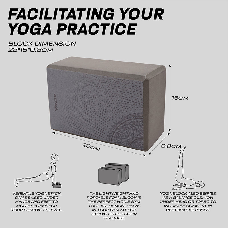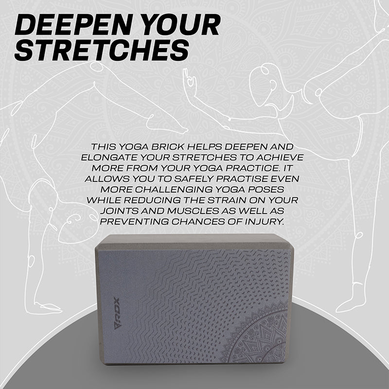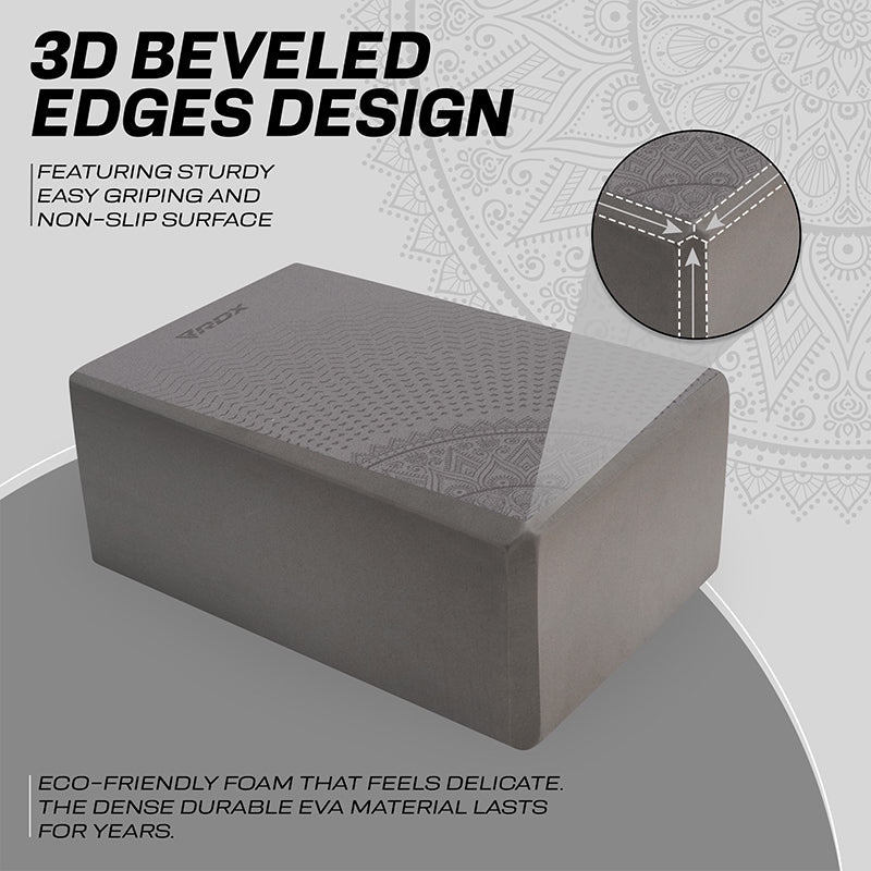 Made for beginner and intermediate yogis alike, this sturdy foam yoga block provides strong support for your bridge poses, and comfortable lift to perfect your alignment in the crescent moon stance. Cultivate healthy energy flow by bringing balance and alignment in your form and everyday life with the RDX EVA Foam yoga blocks. Add this optimally sized yoga block (23*15*9.8cm) to your home gym essential and yoga accessories for increased versatility in your practice.Lightweight and compact design facilitates block-assisted yoga practice anywhere whether it's in your room or under the shade of a giant oak tree. Sturdy, high-density foam yoga block delivers exceptional strength to help prolong your poses and holds its position even under considerable weight. It also retains shape after all sorts of compressions for long-lasting durability. Eva foam material offers a non-abrasive surface that increases comfort while you flex and stretch out during practice, or ease-into restorative poses. Use the yoga brick under your hands and feet to deepen stretches, improve flexibility and modify poses to match your difficulty level. It also serves as meditation cushion under your head and torso to relax and ensure proper alignment. The soft block is gentler on the joints and muscles during arm balances and backbends, which reduces the strain on muscles and the chances of injury. Non-slip textured surface offers superior traction for the stability and balance needed in your practice to maintain control of movement and improve alignment. Slightly bevelled edges provide a firm and easy-grip surface so you can confidently conquer even the more advanced yoga poses. Get additional help by looking up poses from the included exercise manual.Choose the yoga brick design that matches your aesthetics to energize your routine and turn functional yoga into art.