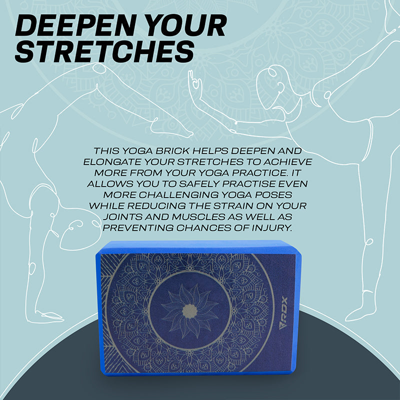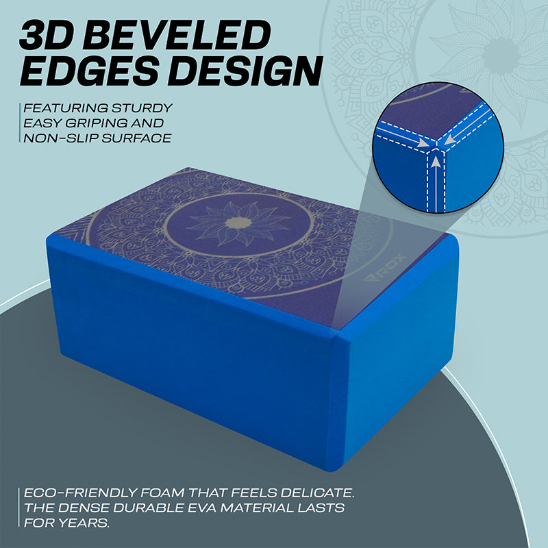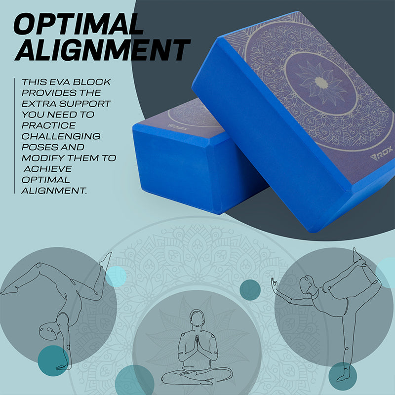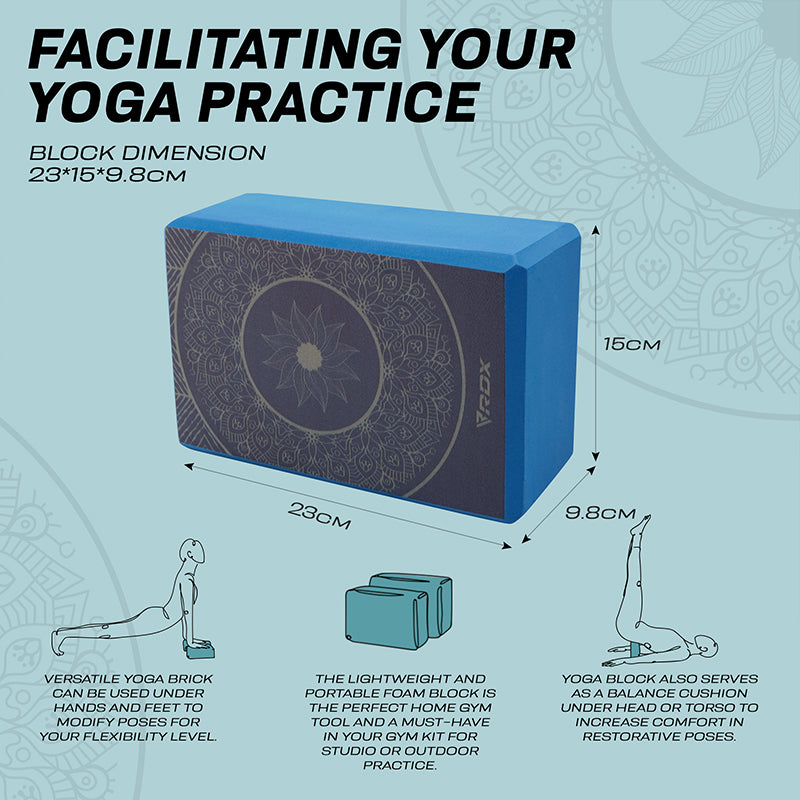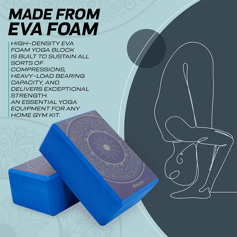 Made for beginner and intermediate yogis alike, this sturdy foam yoga block provides strong support for your bridge poses, and comfortable lift to perfect your alignment in the crescent moon stance. Add this optimally sized yoga block (23*15*9.8cm) to your home gym essential and yoga accessories for increased versatility in your practice. Cultivate healthy energy flow by bringing balance and alignment in your form and everyday life with the RDX EVA Foam yoga blocks.Sturdy, high-density foam yoga block delivers exceptional strength to help prolong your poses and holds its position even under considerable weight. It also retains shape after all sorts of compressions for long-lasting durability. Eva foam material offers a non-abrasive surface that increases comfort while you flex and stretch out during practice, or ease-into restorative poses. Use the yoga brick under your hands and feet to deepen stretches, improve flexibility and modify poses to match your difficulty level. It also serves as meditation cushion under your head and torso to relax and ensure proper alignment. The soft block is gentler on the joints and muscles during arm balances and backbends, which reduces the strain on muscles and the chances of injury. Non-slip textured surface offers superior traction for the stability and balance needed in your practice to maintain control of movement and improve alignment. Slightly bevelled edges provide a firm and easy-grip surface so you can confidently conquer even the more advanced yoga poses. Get additional help by looking up poses from the included exercise manual. Lightweight and compact design facilitates block-assisted yoga practice anywhere whether it's in your room or under the shade of a giant oak tree.Choose the yoga brick design that matches your aesthetics to energize your routine and turn functional yoga into art.