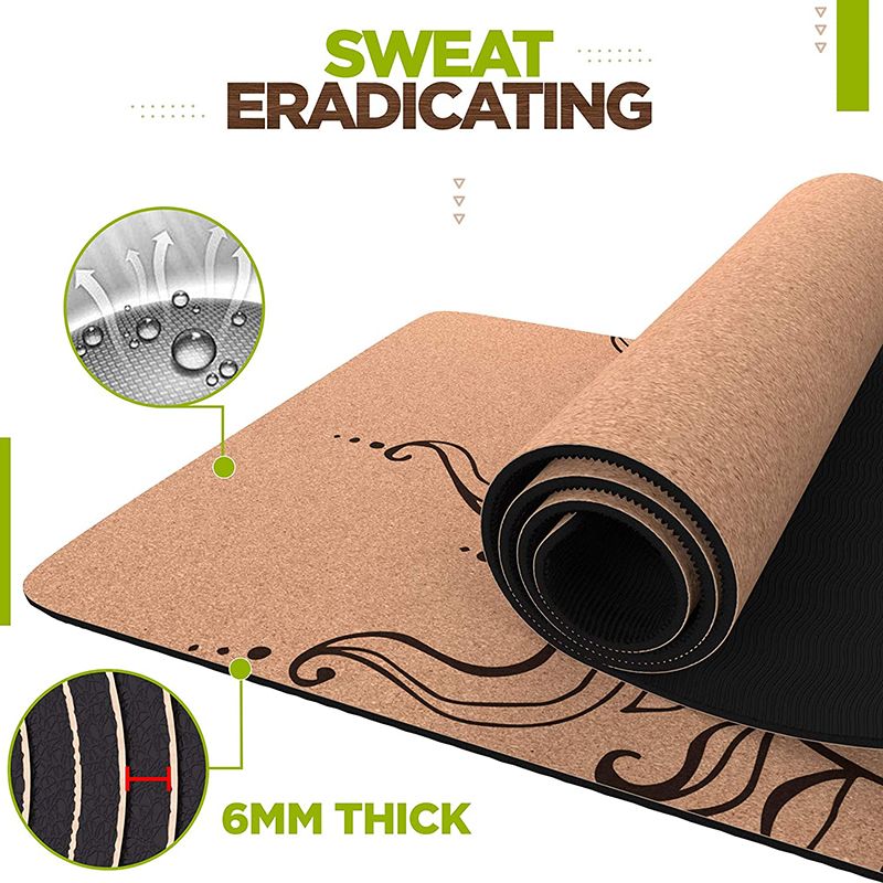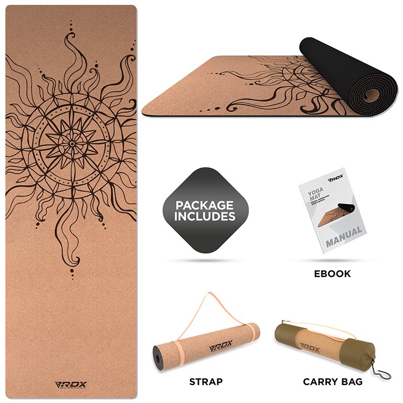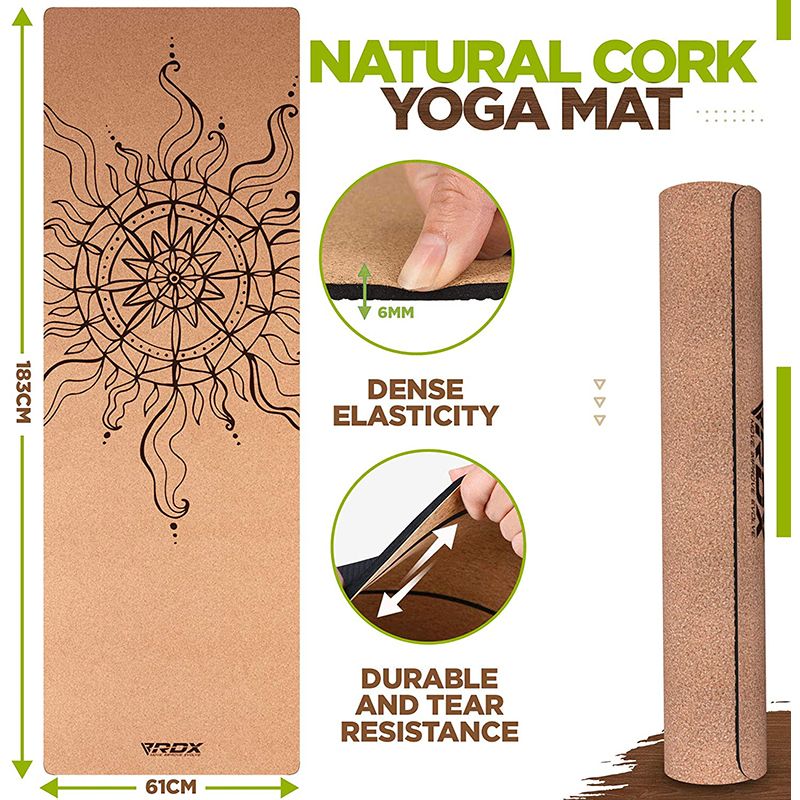 Improve your health and wellbeing while giving back to the environment with RDX's air cork yoga mat. Derived from sustainable sources, these eco-friendly yoga mats are made from premium quality air cork infused with recyclable rubber for professionals and environmentally conscious yogis.Completely non-toxic and SGS certified, our premium organic air cork yoga mats are free of odour and toxins. 100% natural air cork material provides warm hand feel for greater comfort, excellent rebound and insulations against cold and dampness, coupled with our standard 6mm thickness to protect joints from impact. Easy to clean with a wet wipe down, our dual-layer, tear-proof and high resilience gymnastics mats naturally displace moisture for extraordinary gripping power during sweaty workout sessions at home gym. Non-slip smooth rubber bottom prevents slipping during stretches, floor exercises and advanced movements at-home gym. Beautifully minimalistic design and optimal weight in 183x61x0.6cm dimensions makes these earthy-toned natural air cork exercise mats an essential for yogis of any shape or size. Our high-end thick yoga mats are sweat and dust resistant, absorb sound as well as counter surface wrinkles and creasing. Included bag and strap in our thick natural cork exercise mat allows greater freedom to pack up and continue practice at-home gym, studio, beach or on the go. Our aerobics mats are made of biodegradable materials that are lightweight, portable and easy to carry. Choose from our favourite cork mat designs.We understand your need for a wholesome yoga experience to explore deep connectivity with the earth. In honour of those beliefs, on every purchase of our cork yoga mat, RDX donates a percentage of the sale amount towards plantation of new cork trees, which means 10 new organic cork trees get planted every time you buy our KAYA Air Cork Yoga Mats.