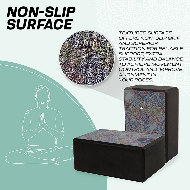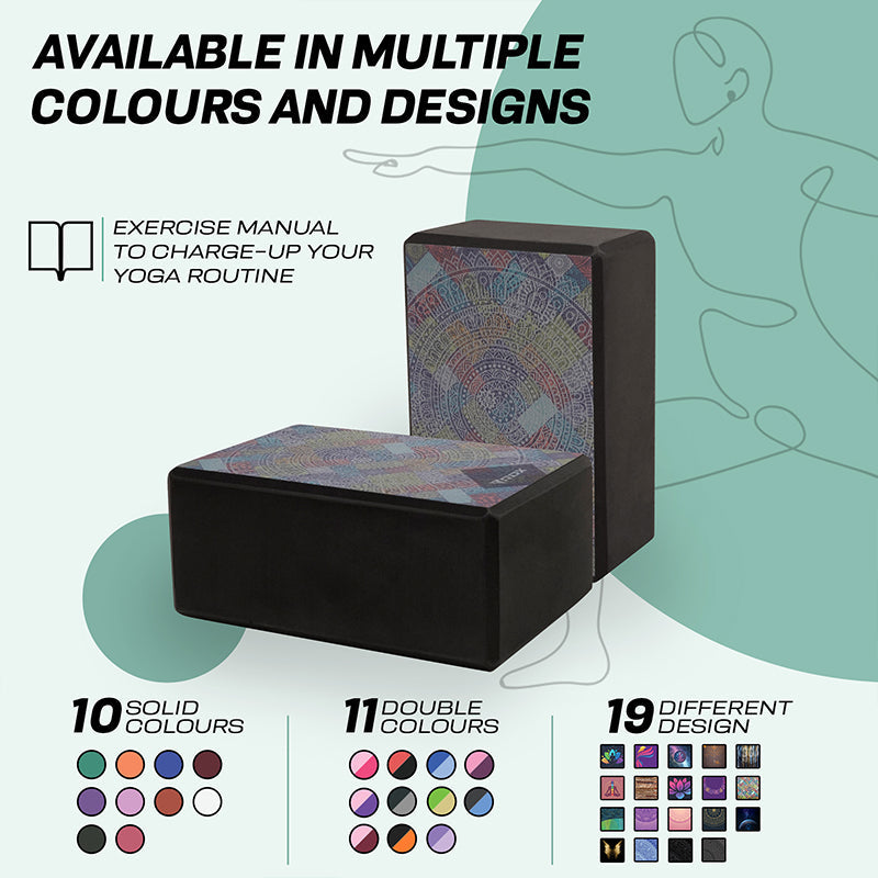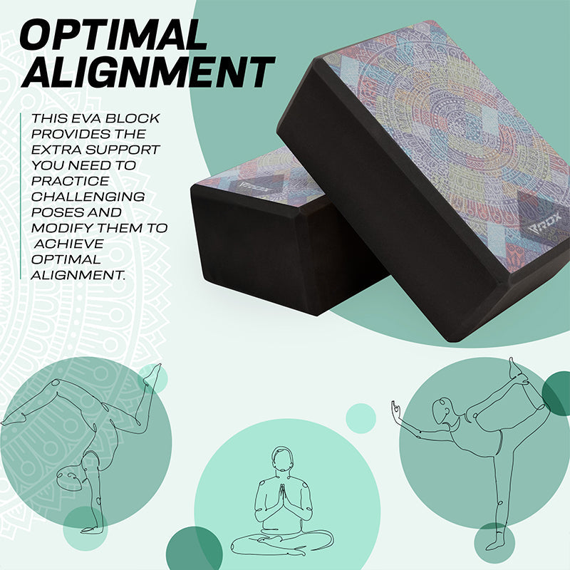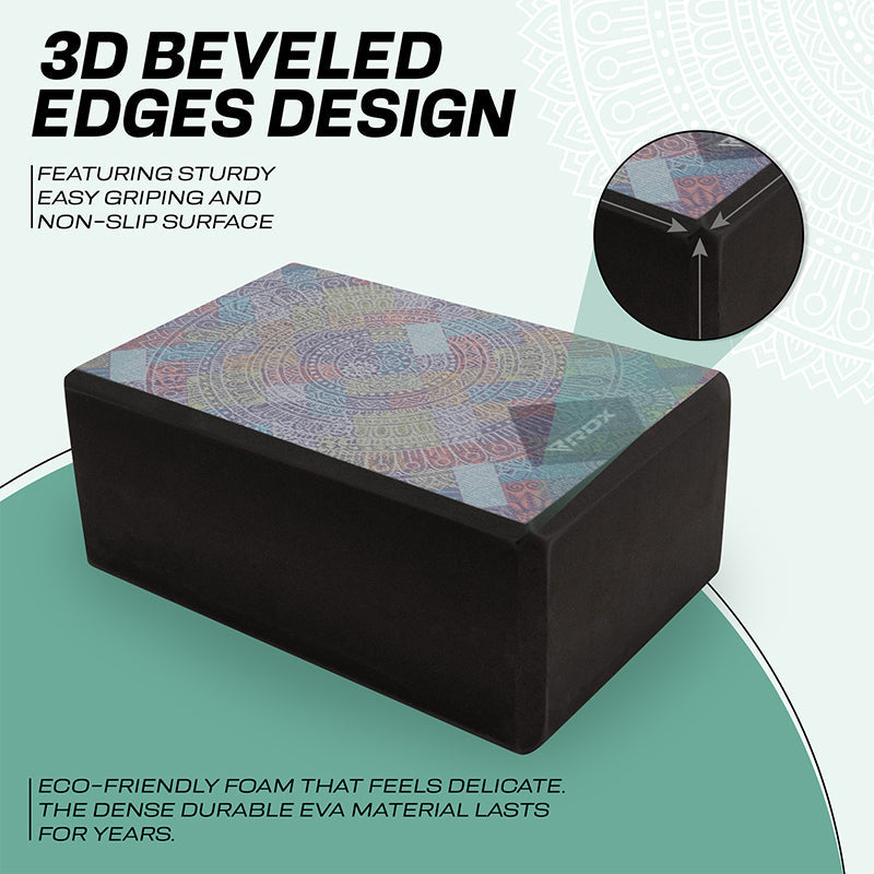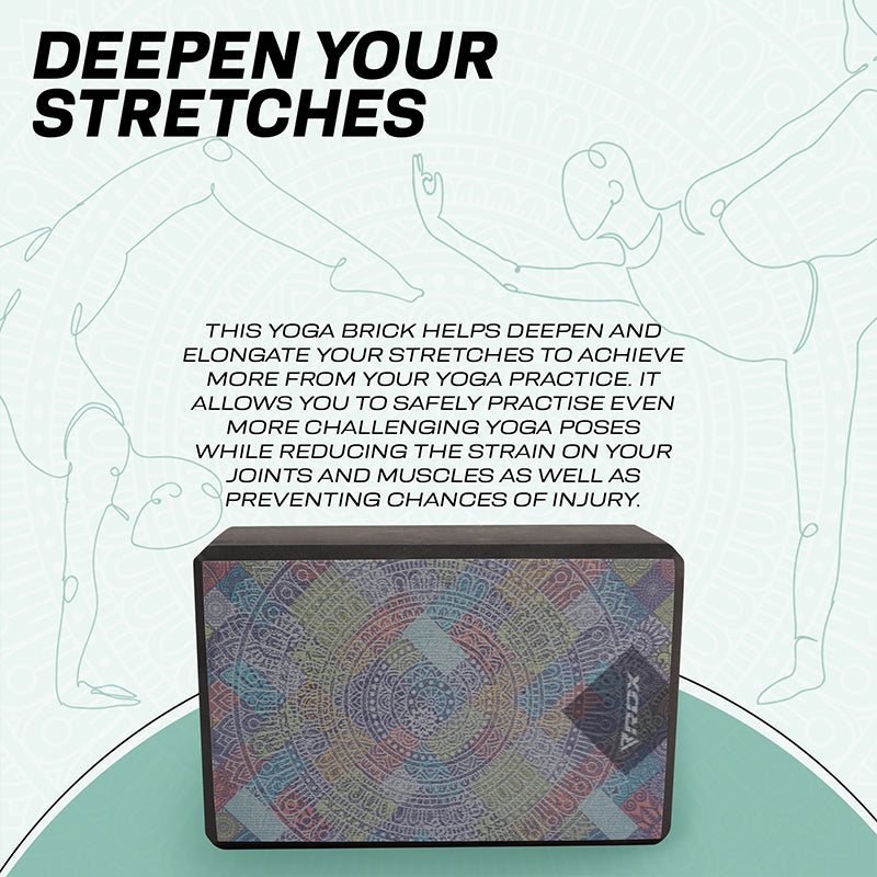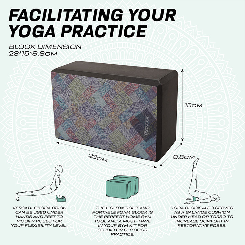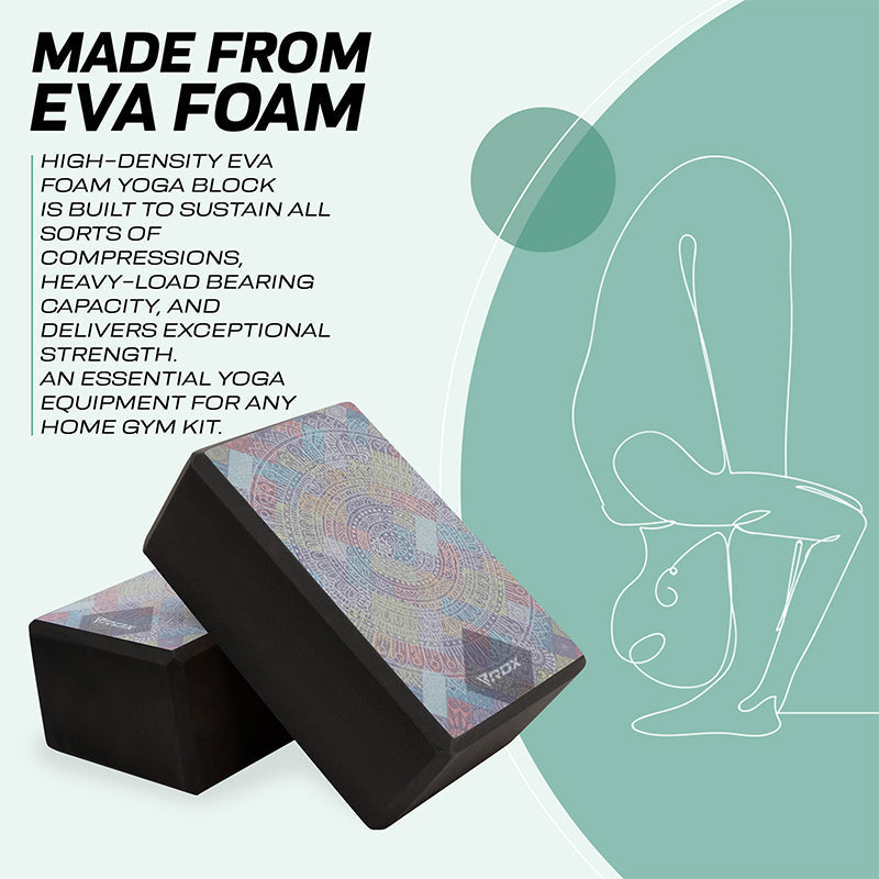Add this optimally sized yoga block (23*15*9.8cm) to your home gym essential and yoga accessories for increased versatility in your practice. Made for beginner and intermediate yogis alike, this sturdy foam yoga block provides strong support for your bridge poses, and comfortable lift to perfect your alignment in the crescent moon stance. Cultivate healthy energy flow by bringing balance and alignment in your form and everyday life with the RDX EVA Foam yoga blocks.Sturdy, high-density foam yoga block delivers exceptional strength to help prolong your poses and holds its position even under considerable weight. The soft block is gentler on the joints and muscles during arm balances and backbends, which reduces the strain on muscles and the chances of injury. Non-slip textured surface offers superior traction for the stability and balance needed in your practice to maintain control of movement and improve alignment. Slightly bevelled edges provide a firm and easy-grip surface so you can confidently conquer even the more advanced yoga poses. Get additional help by looking up poses from the included exercise manual. Lightweight and compact design facilitates block-assisted yoga practice anywhere whether it's in your room or under the shade of a giant oak tree. It also retains shape after all sorts of compressions for long-lasting durability. Eva foam material offers a non-abrasive surface that increases comfort while you flex and stretch out during practice, or ease-into restorative poses. Use the yoga brick under your hands and feet to deepen stretches, improve flexibility and modify poses to match your difficulty level. It also serves as meditation cushion under your head and torso to relax and ensure proper alignment. Choose the yoga brick design that matches your aesthetics to energize your routine and turn functional yoga into art.