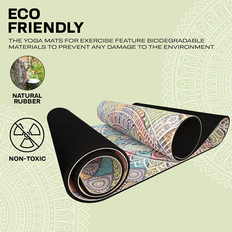 Our natural rubber, eco-friendly, non-slip workout mats are the perfect choice for yogis who want to embrace healthy practices in life. Fill your yoga routine with tranquillity and mindfulness by thoughtfully choosing the right yoga mats for exercise. Enhance your fitness routine at home gym by practising yoga, Pilates or stretching on our 6mm thick, dual-layered mats to cushion joints, reduce fatigue, prevent injury and get excellent rebound during intense workouts.Our high-density material with a non-skid surface on both sides offers enhanced grip so the mats don't roll up or slip during practice. Made to perfection, our yoga mats for home gym are durable, tear-proof design and SGS certified for being an eco-friendly and 100% natural product.Easy to clean with just a quick wipe of soapy water, our non-toxic, non-pungent, lightweight and portable yoga mats for home gym have a portable design for easy storage and transportation. Our biodegradable knee mat for exercise is made of premium natural rubber with perfect dimensions of 183 x 61 x 0.6 cm. Choose the design to match your aesthetics with complimentary strap and bag for easy carry. Includes exercise manual so you can get right to your workout. Non-slip texture of mats offers a non-porous, moisture-proof surface to prevent sweat from seeping in. Just roll and wrap up the knee mat for exercise at home gym with strap (included in package) and sling over shoulder, or roll into its carry bag and take anywhere.