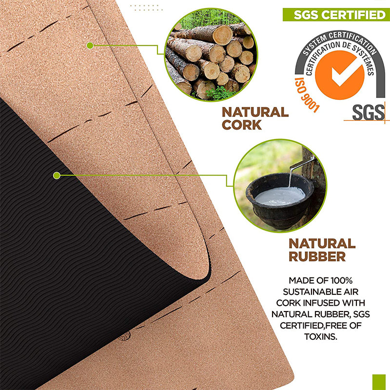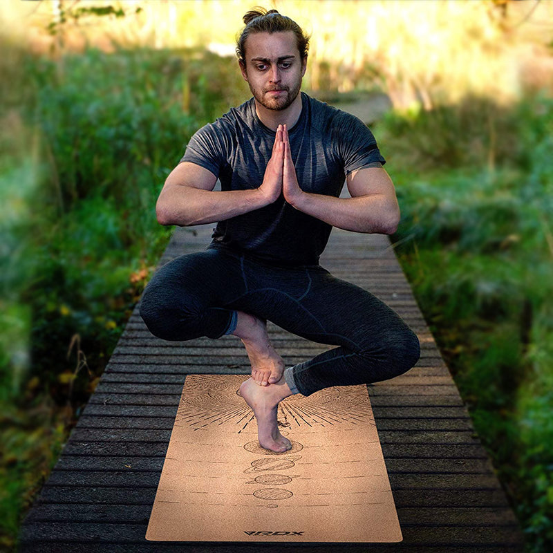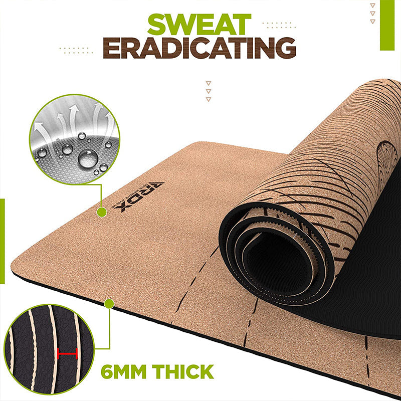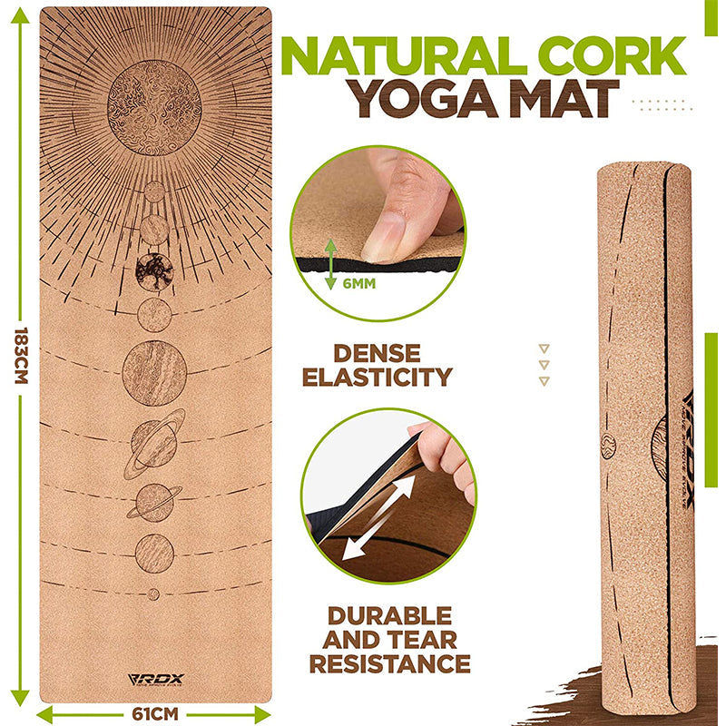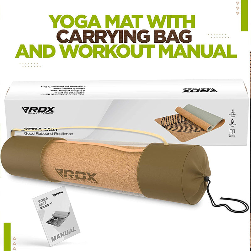 Derived from sustainable sources, these eco-friendly yoga mats are made from premium quality air cork infused with recyclable rubber for professionals and environmentally conscious yogis. So now you can improve your health and wellbeing while giving back to the environment with RDX's air cork yoga mat.Completely non-toxic and SGS certified, our premium organic air cork yoga mats are free of odour and toxins. Easy to clean with a wet wipe down, our dual-layer, tear-proof and high resilience gymnastics mats naturally displace moisture for extraordinary gripping power during sweaty workout sessions at home gym. 100% natural air cork material provides warm hand feel for greater comfort, excellent rebound and insulations against cold and dampness, coupled with our standard 6mm thickness to protect joints from impact. Non-slip smooth rubber bottom prevents slipping during stretches, floor exercises and advanced movements at home gym.Our high-end thick yoga mats are sweat and dust resistant, absorb sound as well as counter surface wrinkles and creasing. Beautifully minimalistic design and optimal weight in 183x61x0.6cm dimensions makes these earthy-toned natural air cork exercise mats an essential for yogis of any shape or size. Our aerobics mats are made of biodegradable materials that are lightweight, portable and easy to carry. Included bag and strap in our thick natural cork exercise mat allows greater freedom to pack up and continue practice at home gym, studio, beach or on the go. Choose from our favourite cork mat designs.We understand your need for a wholesome yoga experience to explore deep connectivity with the earth. In honour of those beliefs, on every purchase of our cork yoga mat, RDX donates a percentage of the sale amount towards plantation of new cork trees, which means 10 new organic cork trees get planted every time you buy our KAYA Air Cork Yoga Mats.
