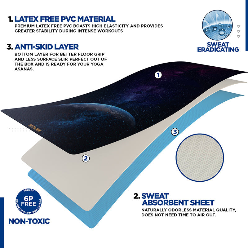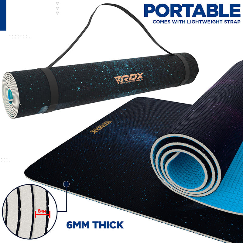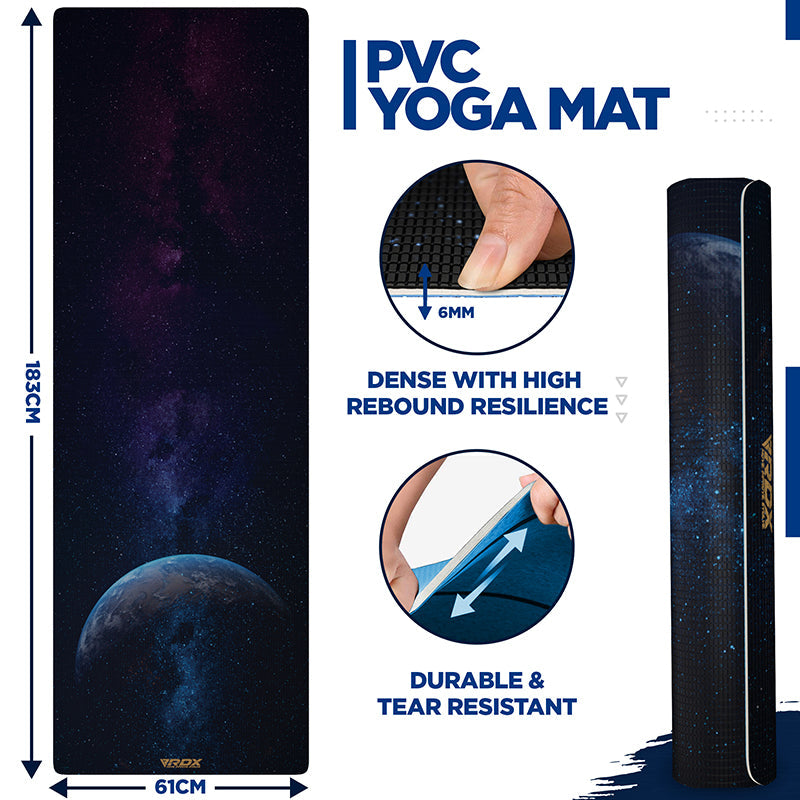 Our studio standard, 6mm thick yoga mat PVC offers your joints the protection they need. Whether you are a seasoned yogi searching for the perfect cardio workout mat, a pilates enthusiast looking for a suitable pilates mat for home or would like a pro fitness mat for other floor based routine, this mat is for you. Submerge yourself into the wholesomeness of yoga with 6mm of cushioning to protect your joints and keep you warm as you weave through the session at home. Our budget friendly exercise mats are 6P & latex-free for a non-toxic, wholesome yoga experience. If you are interested in standing exercises like the Ashtanga yoga then you need a mat that gives you a steady base with a firm grip on the floor. The dual-layered, tear-proof, aesthetically designed mat is easy to clean and maintain. Available in stunning designs, a lightweight carry strap and bag. Open cell technology not only manages sweat but prevents the build up of germs and pungent odour.