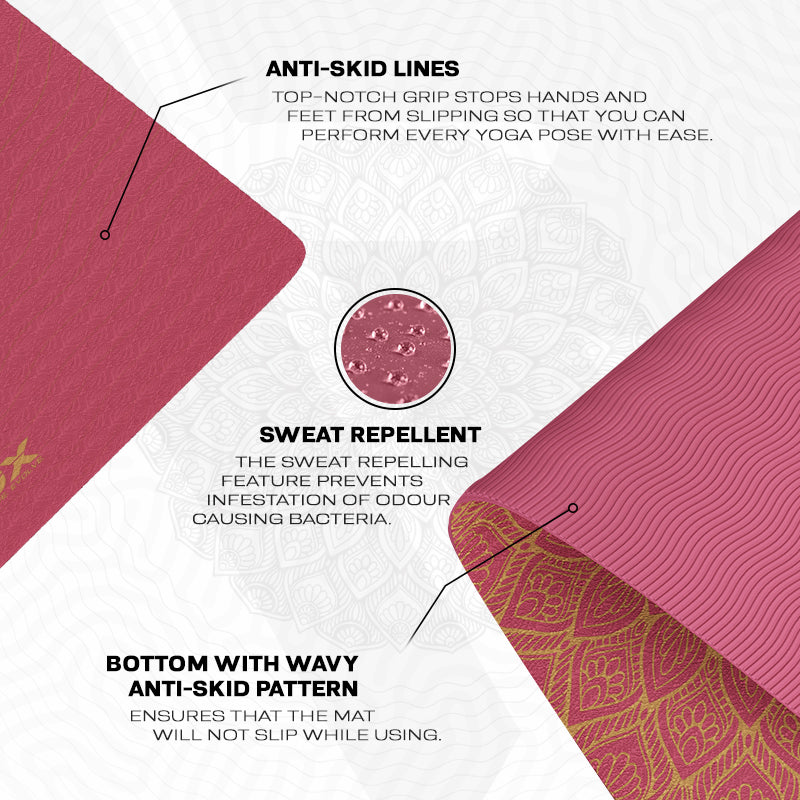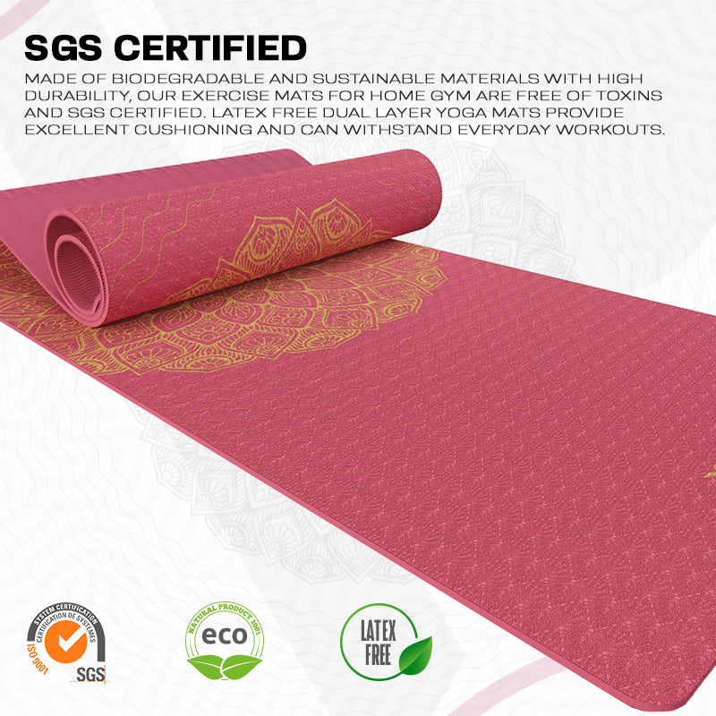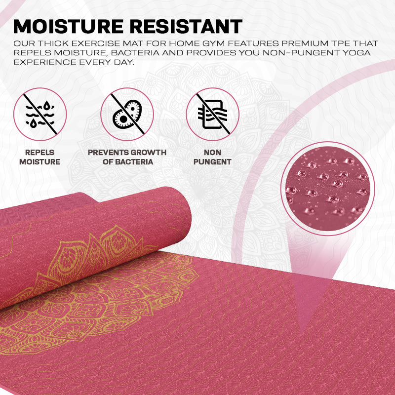 Our workout mats are made of premium TPE that is non-absorbent, water-resistant, and non-pungent and accumulation of dust and sweat. Exercise mats for home gym features double-layered, tear-proof construction in 183x61x0.6cm dimensions ensure the exercise mat is durable and built to accommodate users of all sizes. The anti-skid/anti-slip surface of dual-layer gym mat prevents slippage and offers a firmer grip during intense poses ensuring fluid movement.
