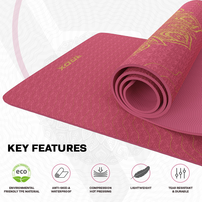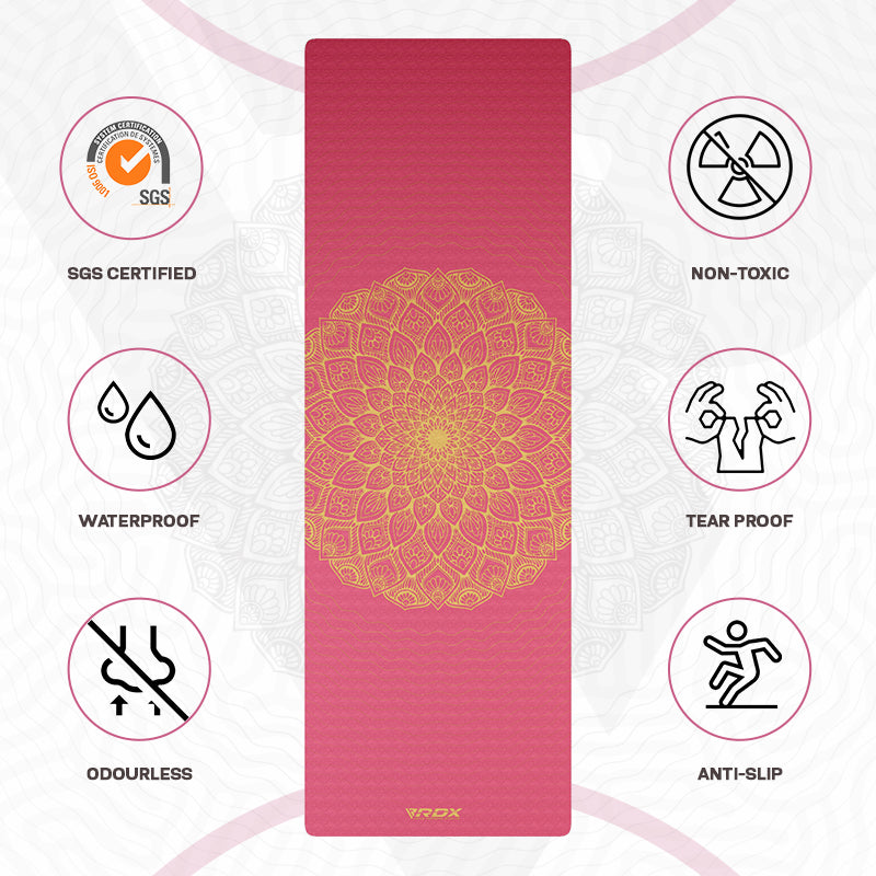 RDX's TPE Yoga Mats are SGS certified and free of toxins. Our extremely soft, non-slip texture, biodegradable TPE yoga mats offer comfort and security at an affordable, budget price. High density, fine-textured foam top surface of 6mm thickness provides higher rebound resilience to these mats to protect joints and facilitate all types of workouts yoga, Pilates, physio or toning exercises. Embark on your yogic journey with gratitude and fulfilment by aligning your energy to discover perfect balance of mind, soul and body.