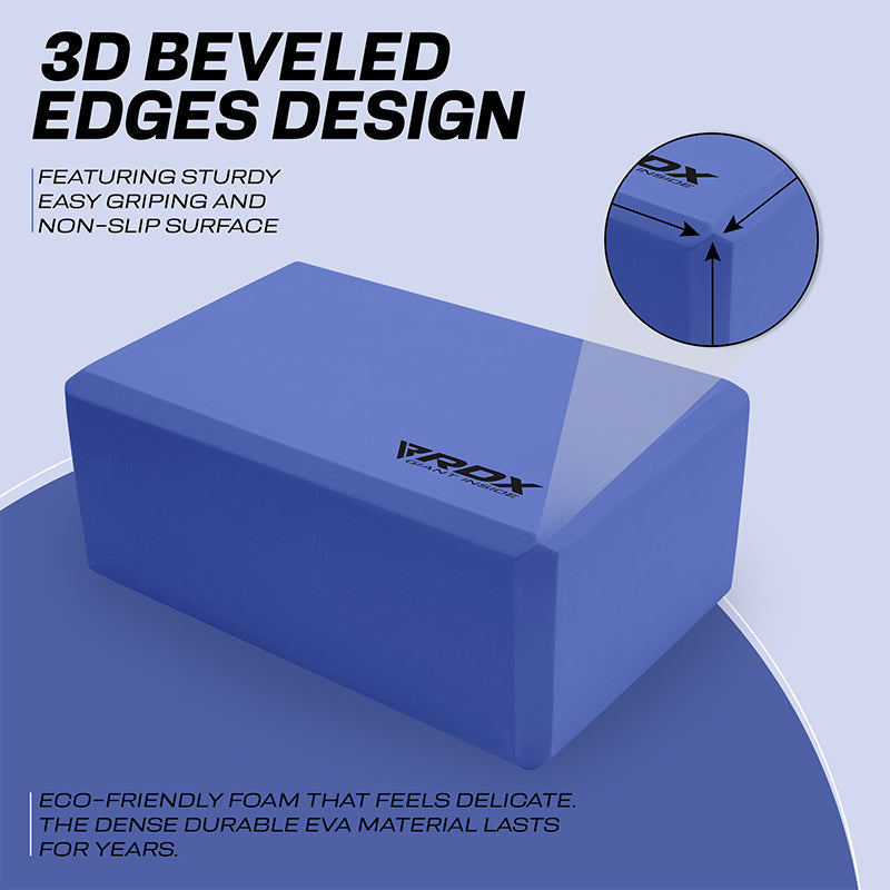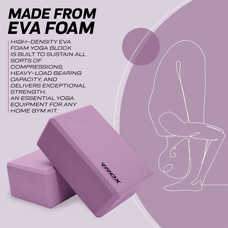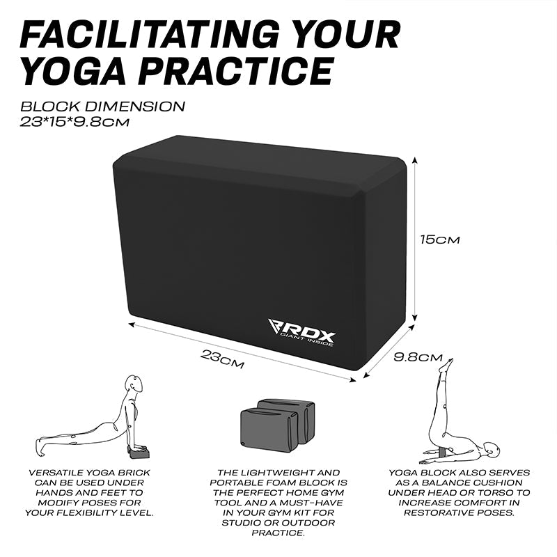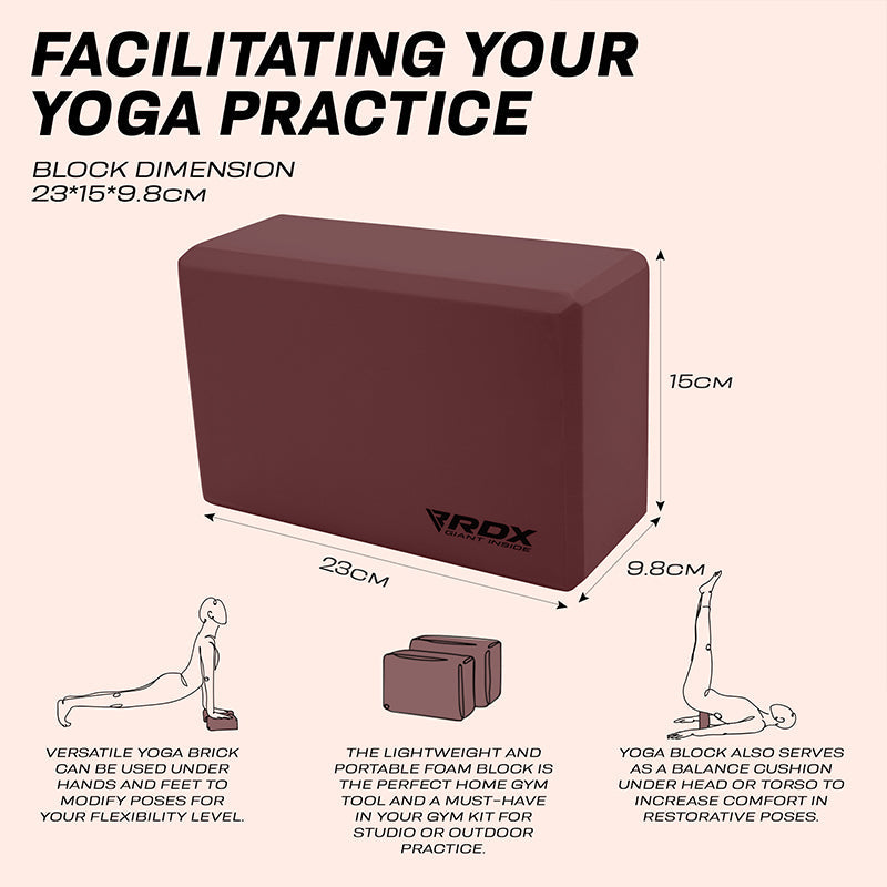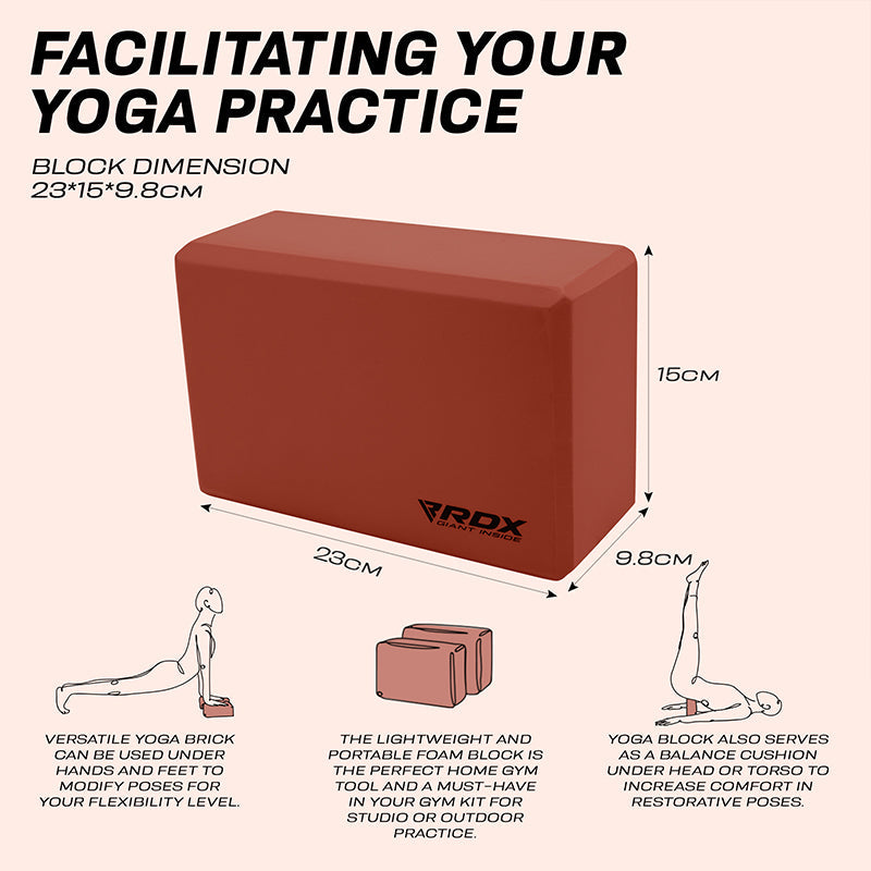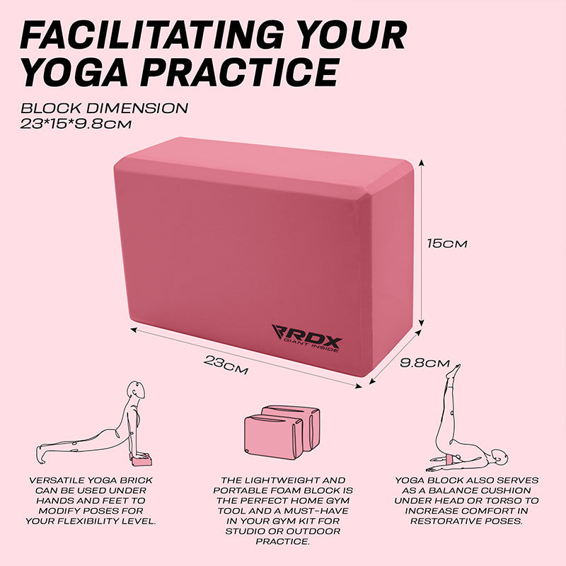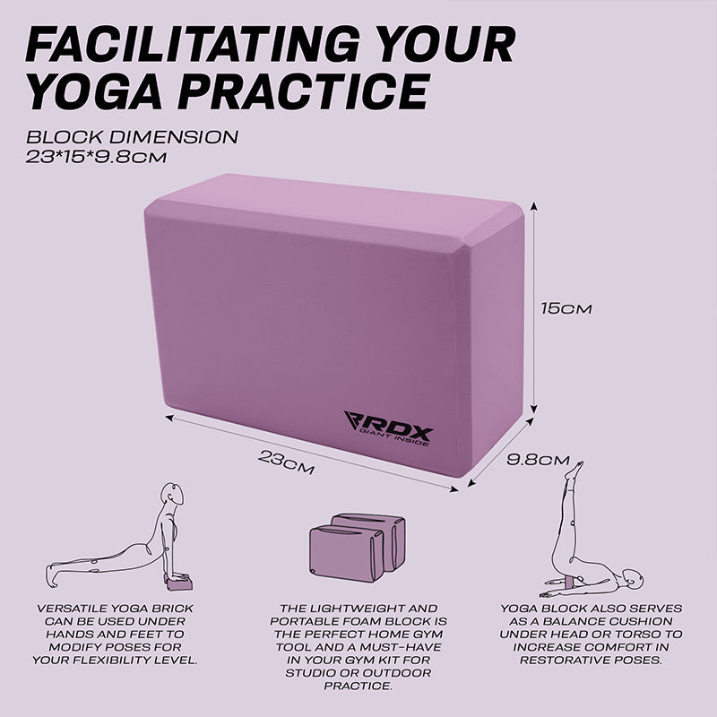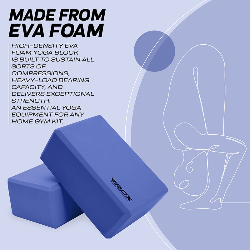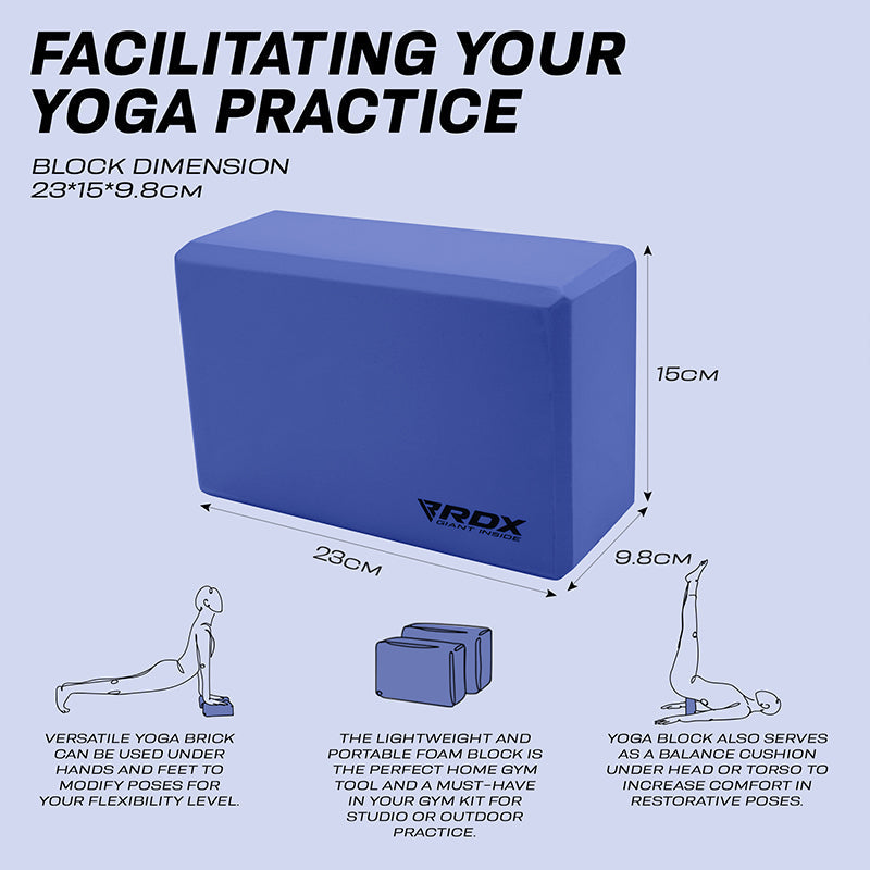 Cultivate healthy energy flow by bringing balance and alignment in your form and everyday life with the RDX EVA Foam yoga blocks. Add this optimally sized yoga block (23*15*9.8cm) to your home gym essential and yoga accessories for increased versatility in your practice. Made for beginner and intermediate yogis alike, this sturdy foam yoga block provides strong support for your bridge poses, and comfortable lift to perfect your alignment in the crescent moon stance.Lightweight and compact design facilitates block-assisted yoga practice anywhere whether it's in your room or under the shade of a giant oak tree. Sturdy, high-density foam yoga block delivers exceptional strength to help prolong your poses and holds its position even under considerable weight. It also retains shape after all sorts of compressions for long-lasting durability. Eva foam material offers a non-abrasive surface that increases comfort while you flex and stretch out during practice, or ease-into restorative poses. Use the yoga brick under your hands and feet to deepen stretches, improve flexibility and modify poses to match your difficulty level. It also serves as meditation cushion under your head and torso to relax and ensure proper alignment. The soft block is gentler on the joints and muscles during arm balances and backbends, which reduces the strain on muscles and the chances of injury. Non-slip textured surface offers superior traction for the stability and balance needed in your practice to maintain control of movement and improve alignment. Slightly bevelled edges provide a firm and easy-grip surface so you can confidently conquer even the more advanced yoga poses. Get additional help by looking up poses from the included exercise manual.Pick the colour that matches your style to energize your routine and turn functional yoga into art.