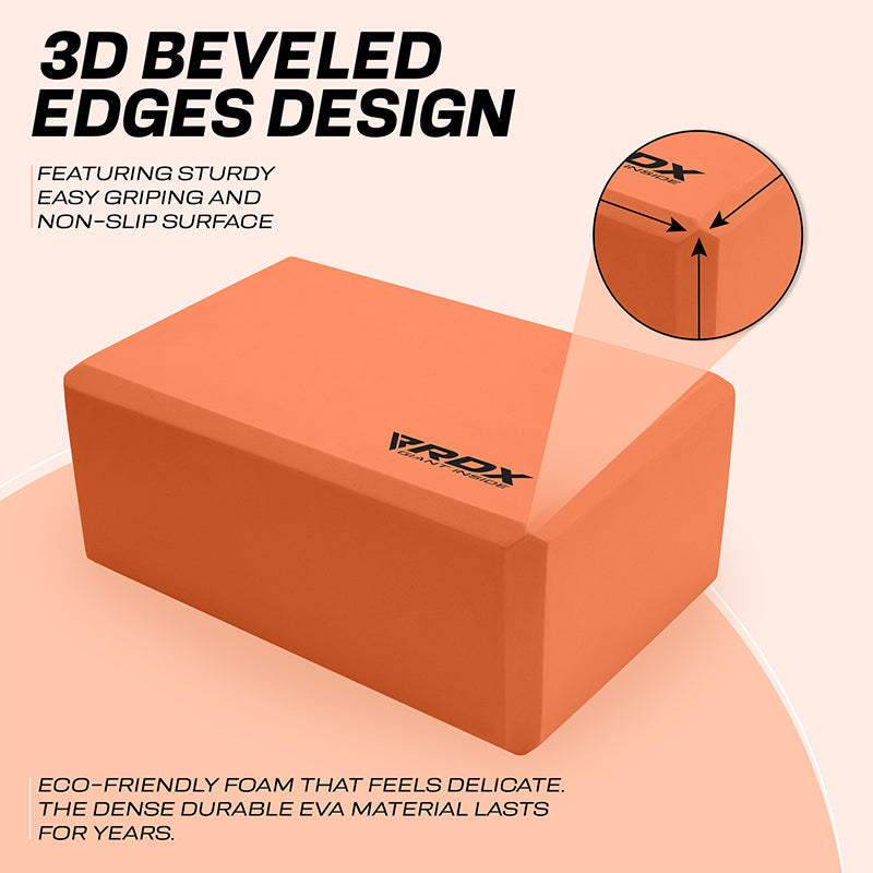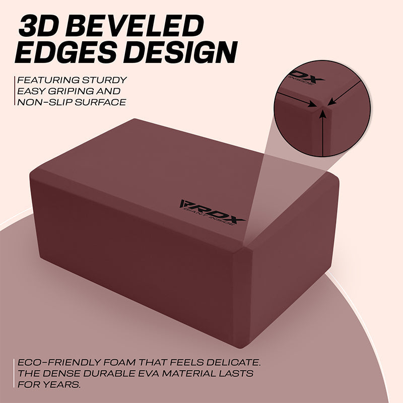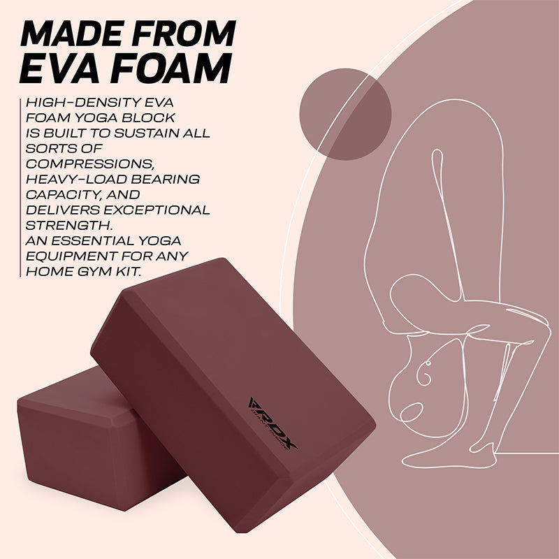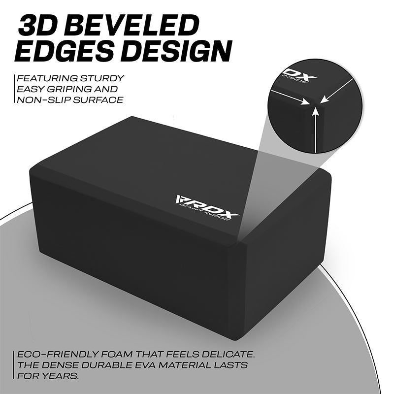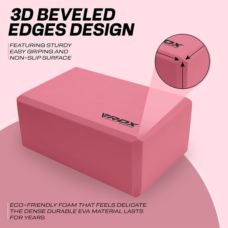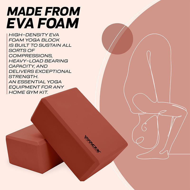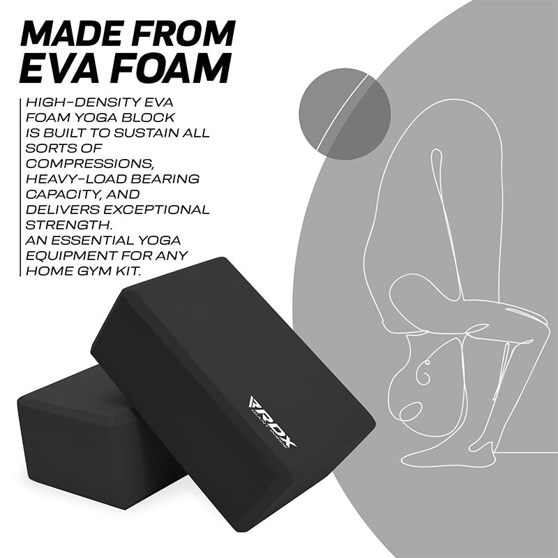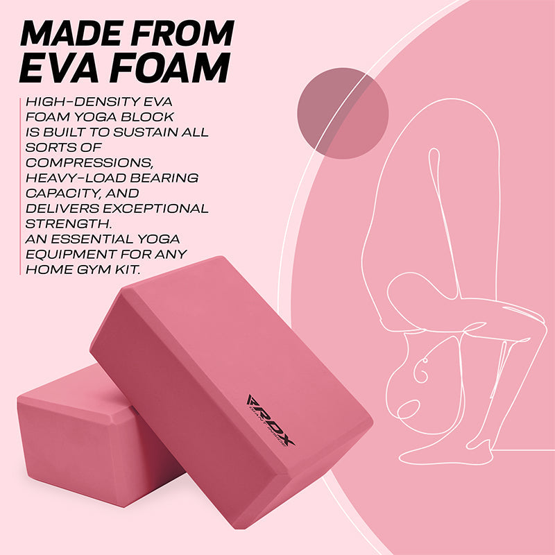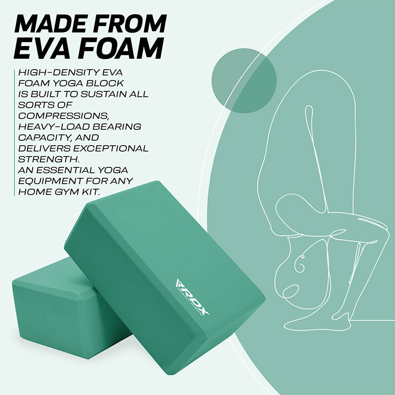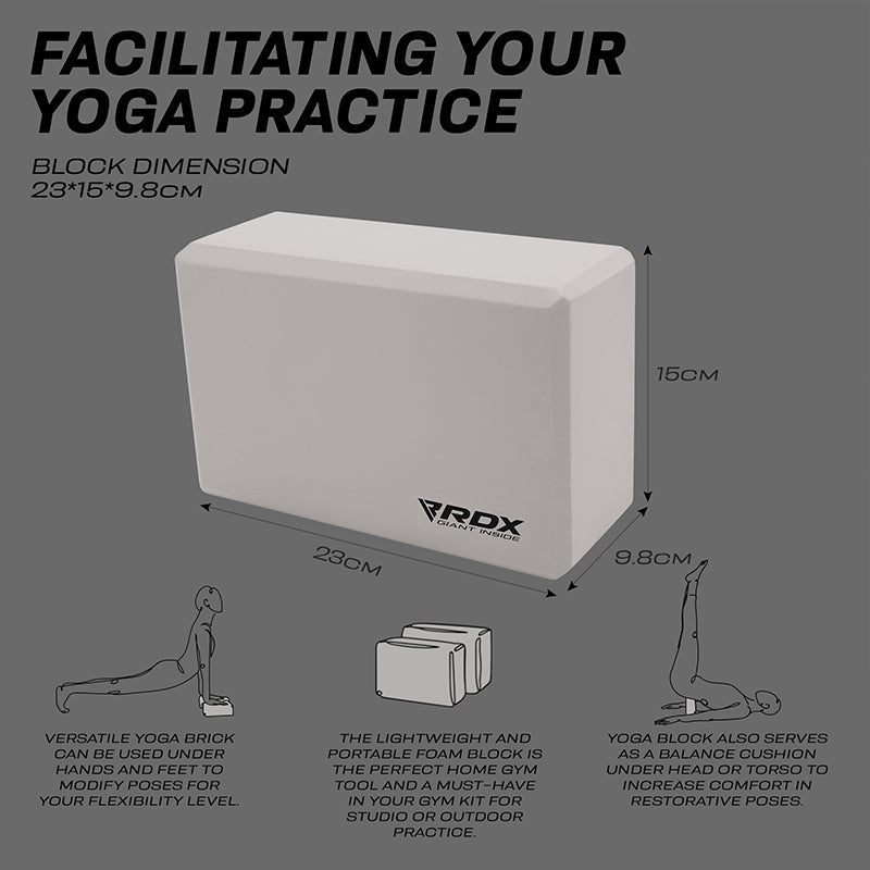 Cultivate healthy energy flow by bringing balance and alignment in your form and everyday life with the RDX EVA Foam yoga blocks. Add this optimally sized yoga block (23*15*9.8cm) to your home gym essential and yoga accessories for increased versatility in your practice. Made for beginner and intermediate yogis alike, this sturdy foam yoga block provides strong support for your bridge poses, and comfortable lift to perfect your alignment in the crescent moon stance.Lightweight and compact design facilitates block-assisted yoga practice anywhere whether it's in your room or under the shade of a giant oak tree. Sturdy, high-density foam yoga block delivers exceptional strength to help prolong your poses and holds its position even under considerable weight. It also retains shape after all sorts of compressions for long-lasting durability. Eva foam material offers a non-abrasive surface that increases comfort while you flex and stretch out during practice, or ease-into restorative poses. Use the yoga brick under your hands and feet to deepen stretches, improve flexibility and modify poses to match your difficulty level. It also serves as meditation cushion under your head and torso to relax and ensure proper alignment. The soft block is gentler on the joints and muscles during arm balances and backbends, which reduces the strain on muscles and the chances of injury. Non-slip textured surface offers superior traction for the stability and balance needed in your practice to maintain control of movement and improve alignment. Slightly bevelled edges provide a firm and easy-grip surface so you can confidently conquer even the more advanced yoga poses. Get additional help by looking up poses from the included exercise manual.Pick the colour that matches your style to energize your routine and turn functional yoga into art.