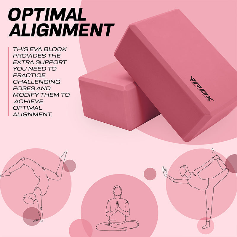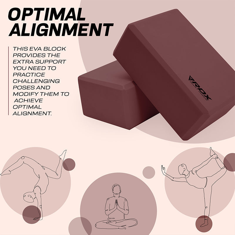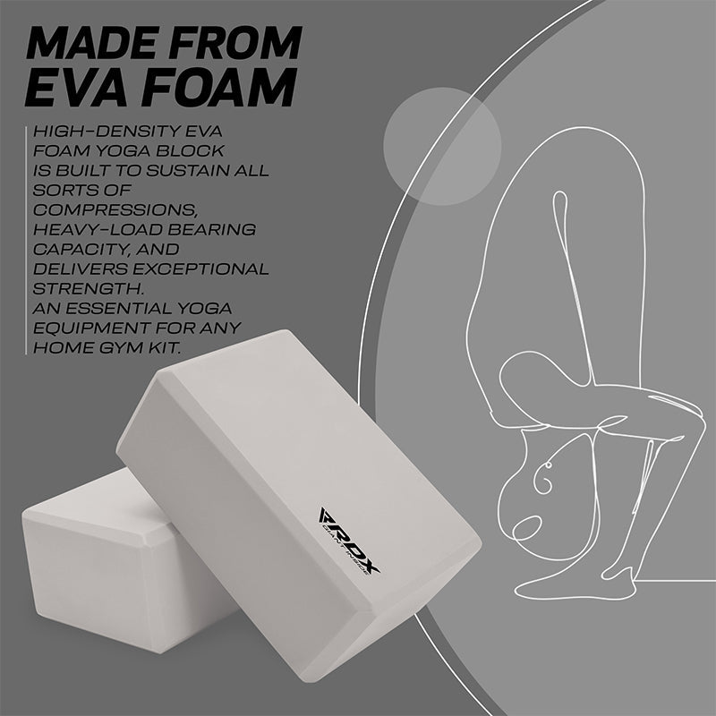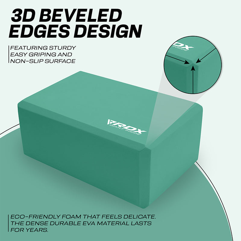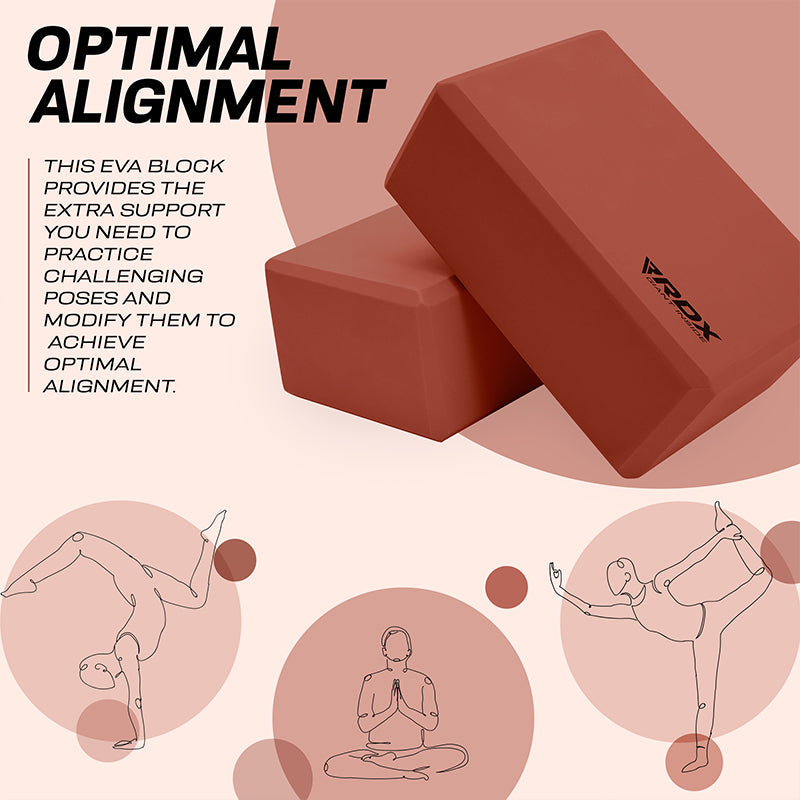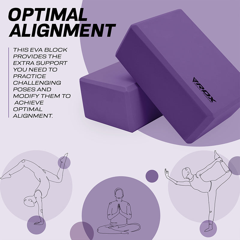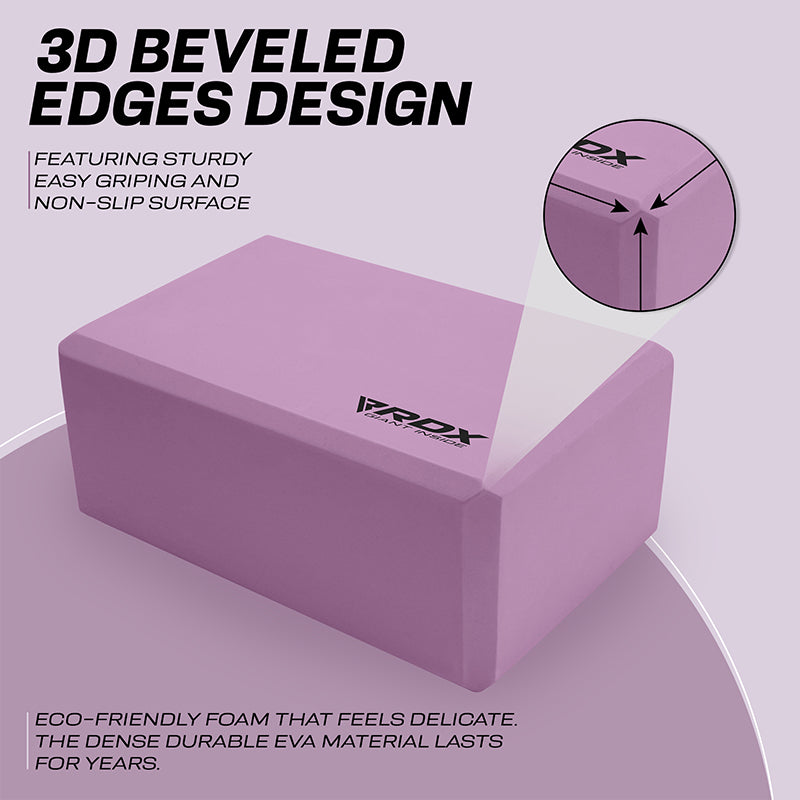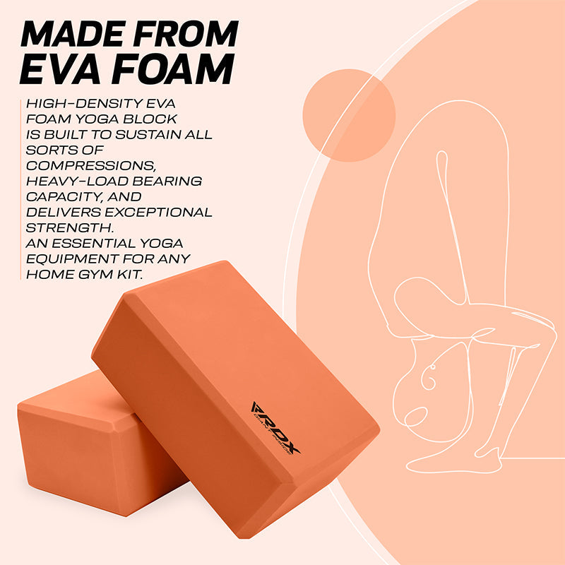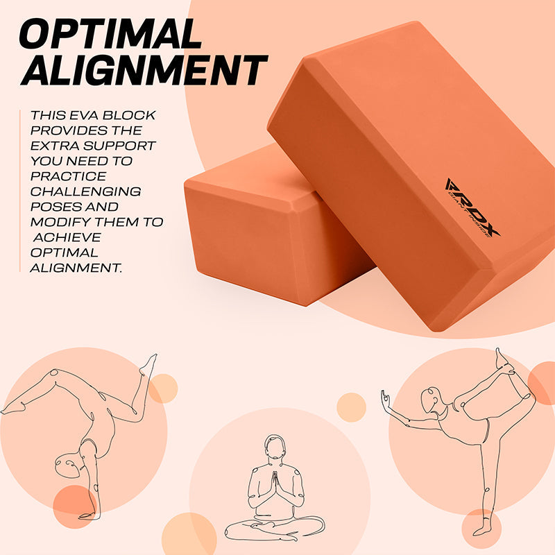 Cultivate healthy energy flow by bringing balance and alignment in your form and everyday life with the RDX EVA Foam yoga blocks. Add this optimally sized yoga block (23*15*9.8cm) to your home gym essential and yoga accessories for increased versatility in your practice. Made for beginner and intermediate yogis alike, this sturdy foam yoga block provides strong support for your bridge poses, and comfortable lift to perfect your alignment in the crescent moon stance.Lightweight and compact design facilitates block-assisted yoga practice anywhere whether it's in your room or under the shade of a giant oak tree. Sturdy, high-density foam yoga block delivers exceptional strength to help prolong your poses and holds its position even under considerable weight. It also retains shape after all sorts of compressions for long-lasting durability. Eva foam material offers a non-abrasive surface that increases comfort while you flex and stretch out during practice, or ease-into restorative poses. Use the yoga brick under your hands and feet to deepen stretches, improve flexibility and modify poses to match your difficulty level. It also serves as meditation cushion under your head and torso to relax and ensure proper alignment. The soft block is gentler on the joints and muscles during arm balances and backbends, which reduces the strain on muscles and the chances of injury. Non-slip textured surface offers superior traction for the stability and balance needed in your practice to maintain control of movement and improve alignment. Slightly bevelled edges provide a firm and easy-grip surface so you can confidently conquer even the more advanced yoga poses. Get additional help by looking up poses from the included exercise manual.Pick the colour that matches your style to energize your routine and turn functional yoga into art.