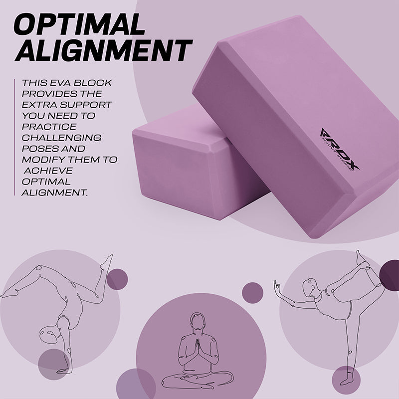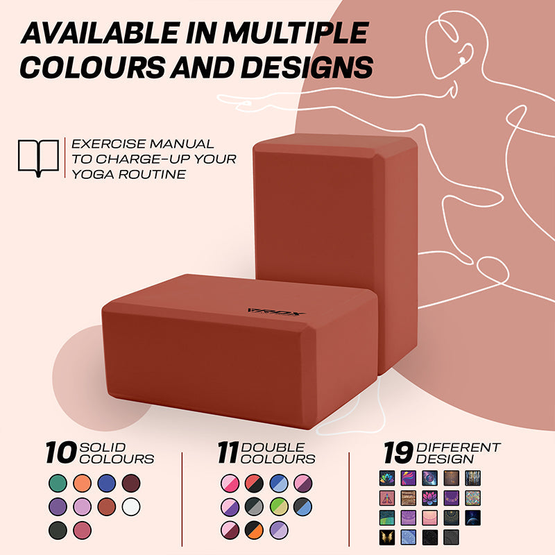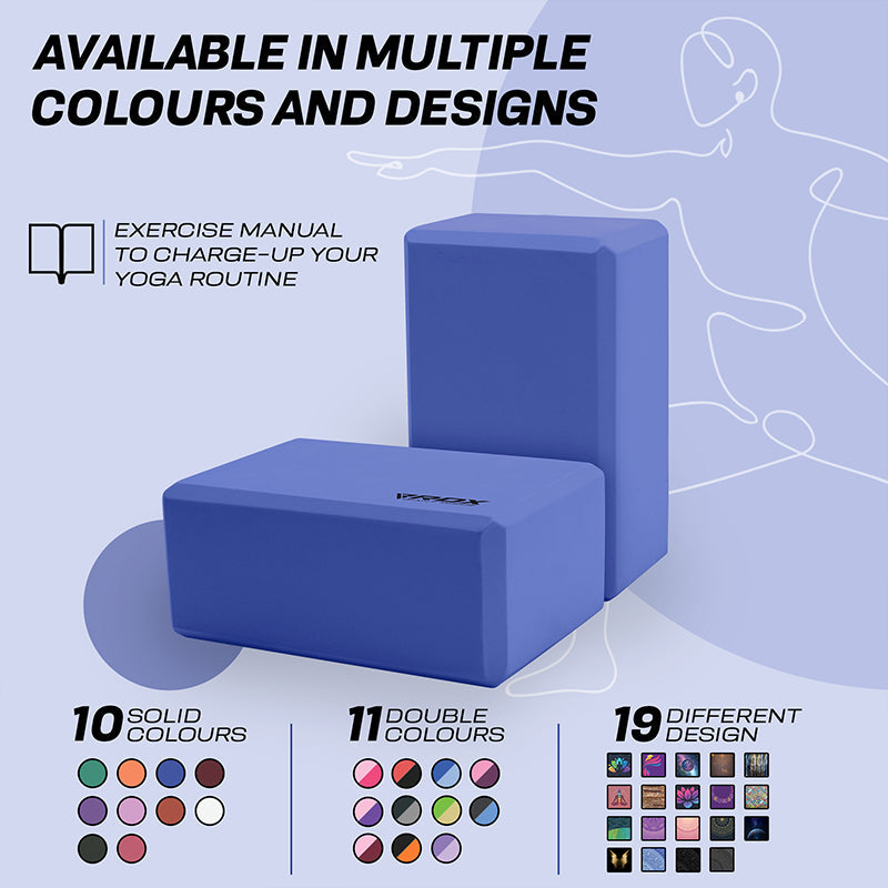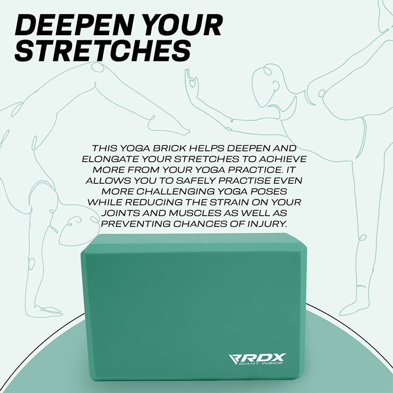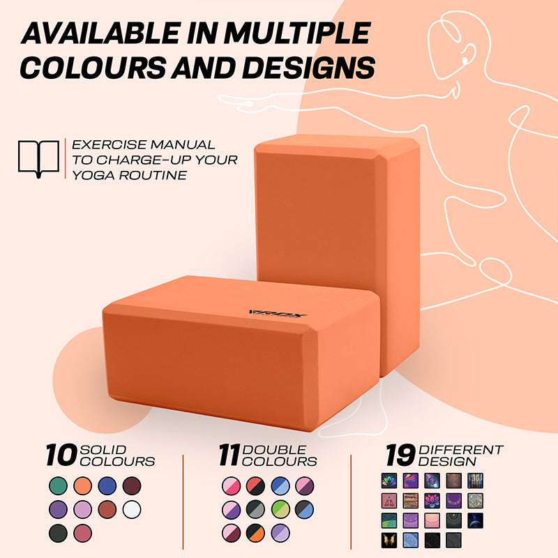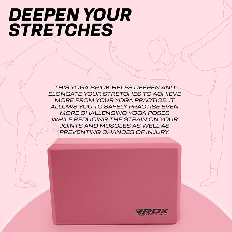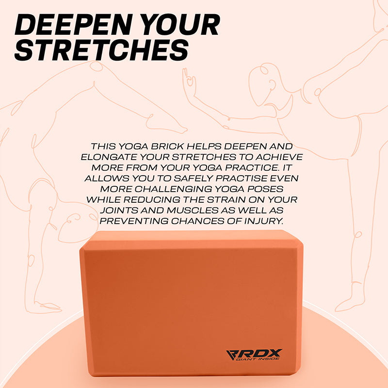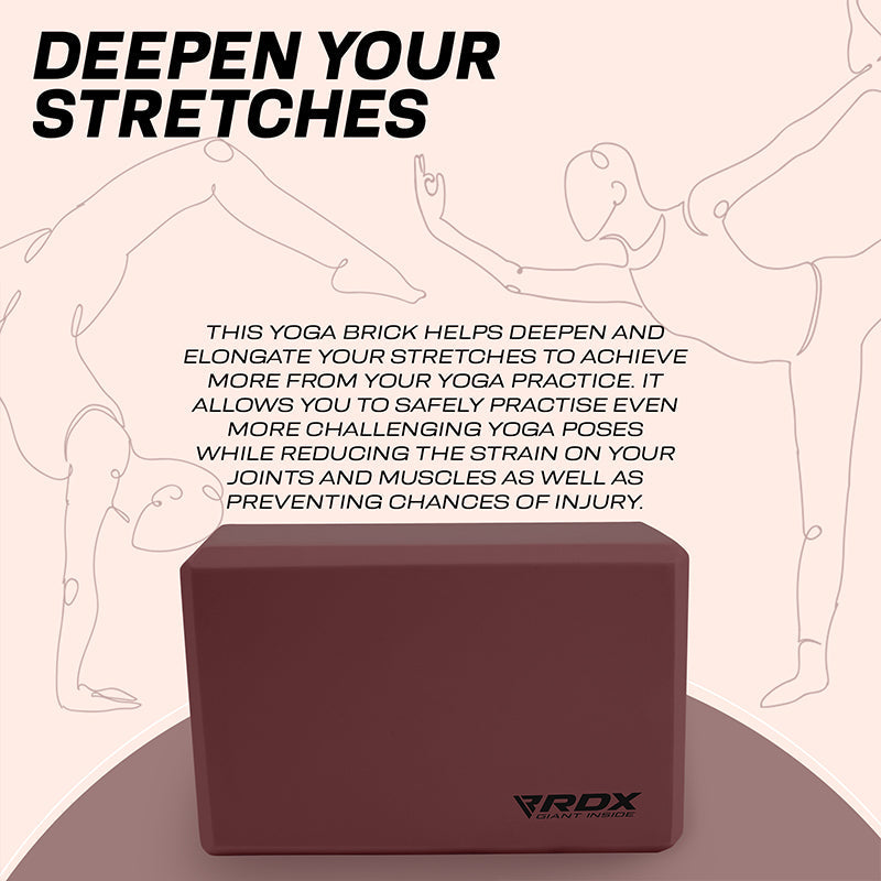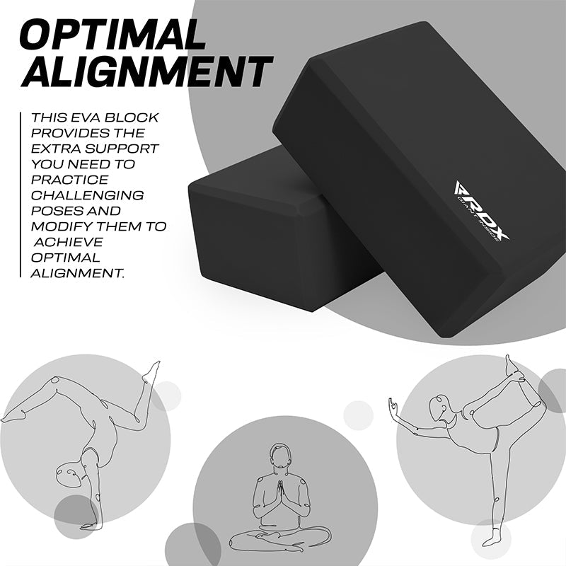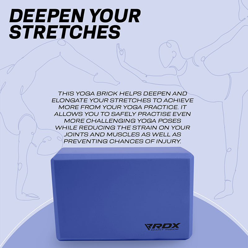 Cultivate healthy energy flow by bringing balance and alignment in your form and everyday life with the RDX EVA Foam yoga blocks. Add this optimally sized yoga block (23*15*9.8cm) to your home gym essential and yoga accessories for increased versatility in your practice. Made for beginner and intermediate yogis alike, this sturdy foam yoga block provides strong support for your bridge poses, and comfortable lift to perfect your alignment in the crescent moon stance.Lightweight and compact design facilitates block-assisted yoga practice anywhere whether it's in your room or under the shade of a giant oak tree. Sturdy, high-density foam yoga block delivers exceptional strength to help prolong your poses and holds its position even under considerable weight. It also retains shape after all sorts of compressions for long-lasting durability. Eva foam material offers a non-abrasive surface that increases comfort while you flex and stretch out during practice, or ease-into restorative poses. Use the yoga brick under your hands and feet to deepen stretches, improve flexibility and modify poses to match your difficulty level. It also serves as meditation cushion under your head and torso to relax and ensure proper alignment. The soft block is gentler on the joints and muscles during arm balances and backbends, which reduces the strain on muscles and the chances of injury. Non-slip textured surface offers superior traction for the stability and balance needed in your practice to maintain control of movement and improve alignment. Slightly bevelled edges provide a firm and easy-grip surface so you can confidently conquer even the more advanced yoga poses. Get additional help by looking up poses from the included exercise manual.Pick the colour that matches your style to energize your routine and turn functional yoga into art.