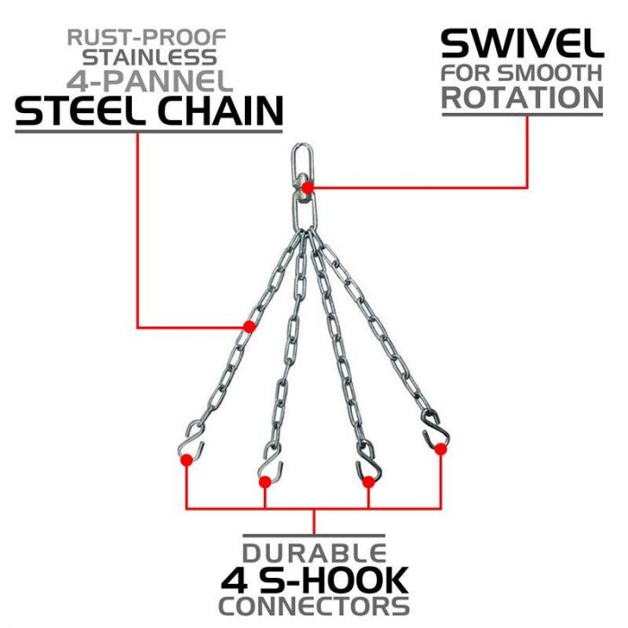 • 1 x Pair of Hand Wraps, 1 x Steel chains, 1 x Swivel, 1 x Jump rope, 1 x D-Shackle, 1 X Punch Bag Strap Hook,1 X Punching Bag Strap