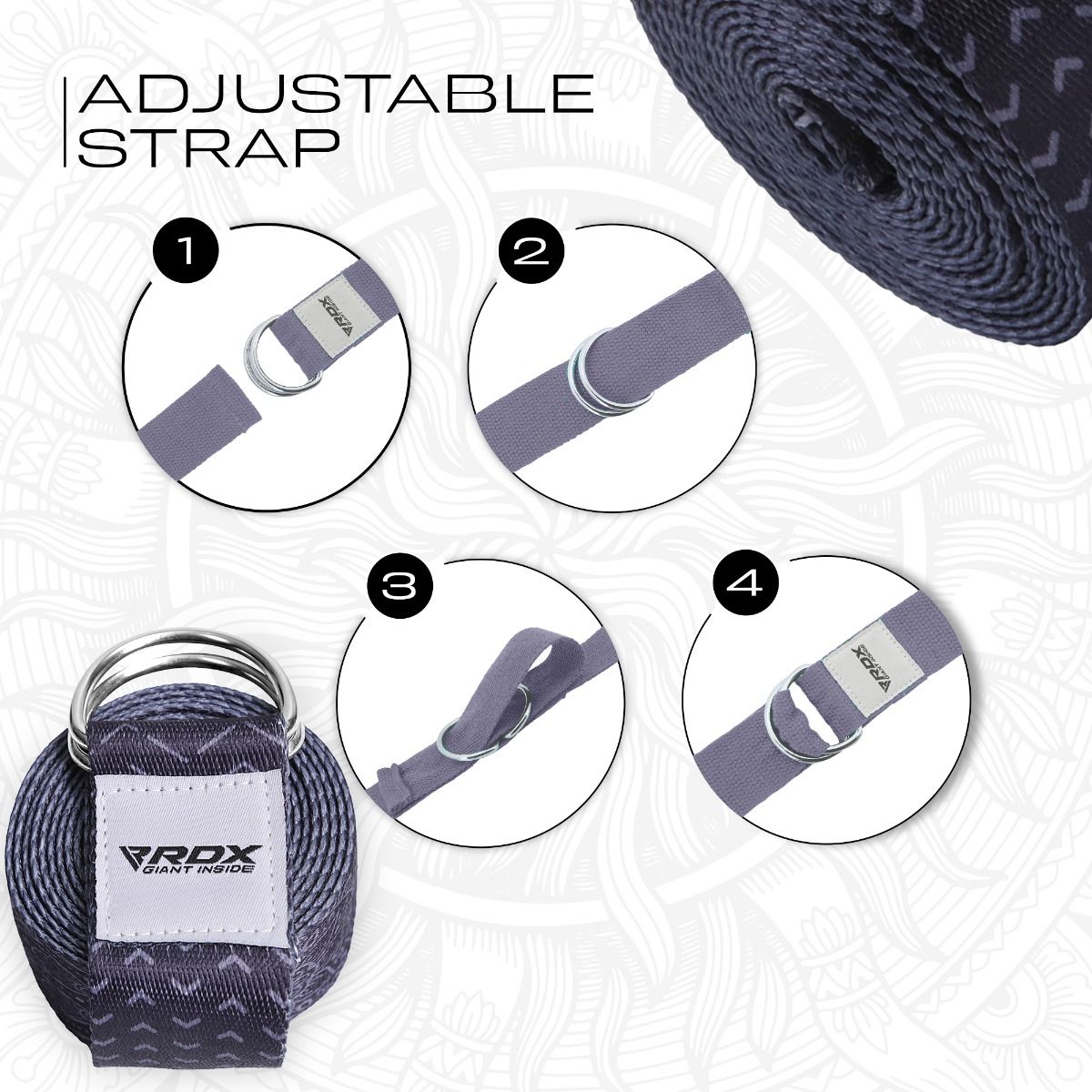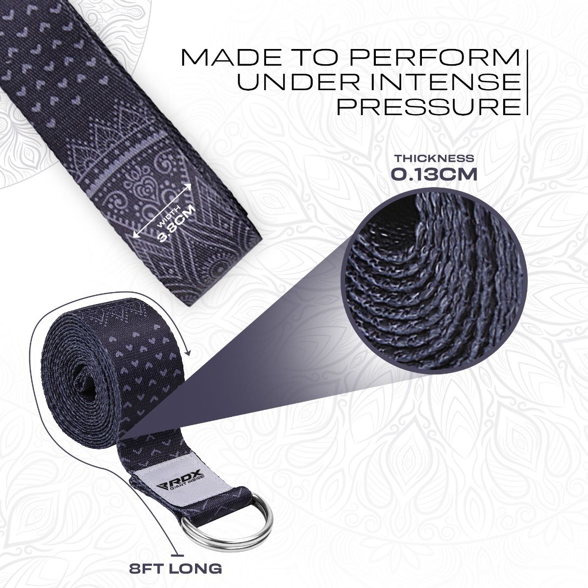 Bridge the gap between your current fitness workout and yoga goals with RDX's eco-friendly Yoga Straps. Deepen your yoga practice and maximize your performance by challenging flexibility, strength and endurance with this versatile yoga accessory. Made from thick and sturdy premium poly-cotton that is sustainably sourced and holds firm to give you confidence for extending reach and improving mobility in more challenging poses. Our stretching strap is easy to use and simple enough to tie up for your use, allowing you to grab limbs that would be otherwise challenging. Adjustable 8ft long loop strap conforms to perfect alignment of shoulders and back, or stretch out muscles of legs and arms for unlimited yoga poses. Ideally endorsed with 3.8cm width and 0.13cm thickness, our yoga strap is perfect for physical therapy and rehabilitation, yoga exercises at home, Pilates or athletic warm-ups at the gym. Made with soft materials with adjustable double D rings which are rust-proof and unbreakable. A must-have in your yoga kit for studio practice or working out at your home gym. Our easily machine washable yoga stretch strap offers convenience of use and non-slip grip for sweaty hands during intense workouts. Capable of withstanding wear-and-tear from daily, vigorous routines. Comes with a carry bag and exercise manual so you won't miss any workout day. Pick your favourite design to showcase your unique personality.