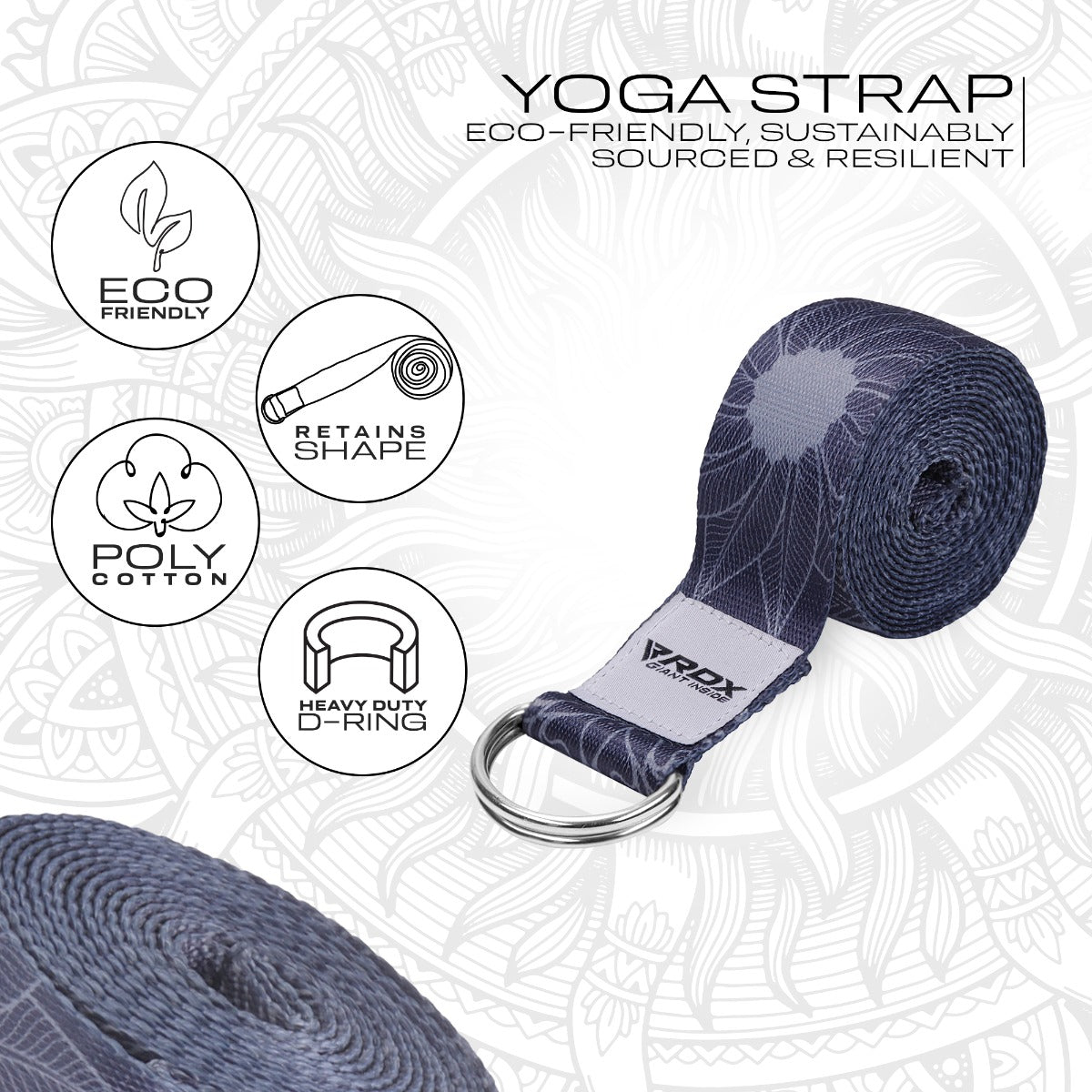 Bridge the gap between your current fitness workout and yoga goals with RDX's eco-friendly Yoga Straps. Deepen your yoga practice and maximize your performance by challenging flexibility, strength and endurance with this versatile yoga accessory. Made from thick and sturdy premium poly-cotton that is sustainably sourced and holds firm to give you confidence for extending reach and improving mobility in more challenging poses. Our stretching strap is easy to use and simple enough to tie up for your use, allowing you to grab limbs that would be otherwise challenging. Adjustable 8ft long loop strap conforms to perfect alignment of shoulders and back, or stretch out muscles of legs and arms for unlimited yoga poses. Ideally endorsed with 3.8cm width and 0.13cm thickness, our yoga strap is perfect for physical therapy and rehabilitation, yoga exercises at home, Pilates or athletic warm-ups at the gym. Made with soft materials with adjustable double D rings which are rust-proof and unbreakable. A must-have in your yoga kit for studio practice or working out at your home gym. Our easily machine washable yoga stretch strap offers convenience of use and non-slip grip for sweaty hands during intense workouts. Capable of withstanding wear-and-tear from daily, vigorous routines. Comes with a carry bag and exercise manual so you won't miss any workout day. Pick your favourite design to showcase your unique personality.