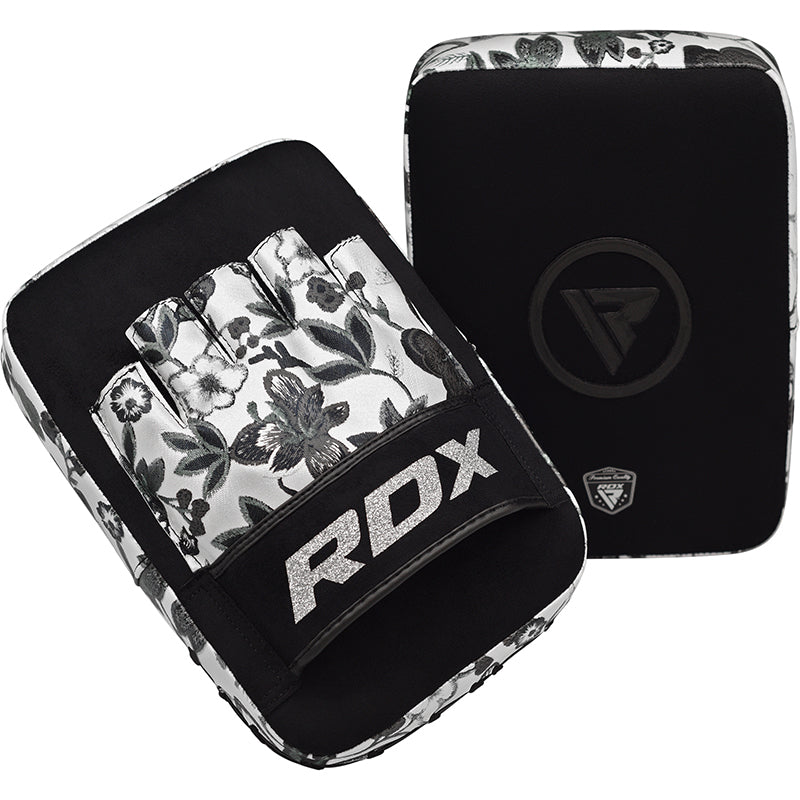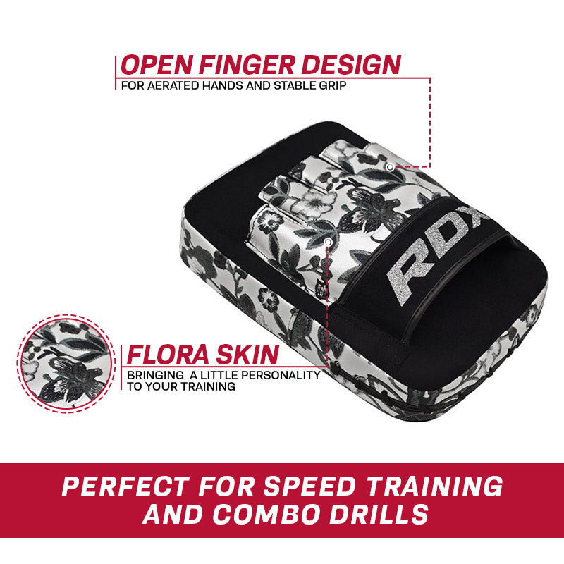 The RDX Sports ladies focus pads are a great way to bring a little personality to your training sessions. Ideal for speed training and combo drills, these focus mitts are made with a soft suede casing and synthetic fiber detailing called Flora Skin, which is unique to RDX Sports. The interior is double-stitched to encourage tear resilience and the thick EVA-LUTION foam padding ensures max shock resistance. The cut finger design gives the wearer a better grip and encourages proper air flow to the hands that keeps them cool and sweat-free. Handcrafted, these boxing pads will soon become a staple feature of your training routine.