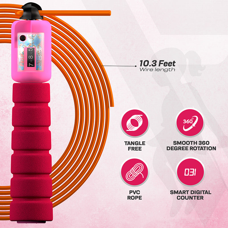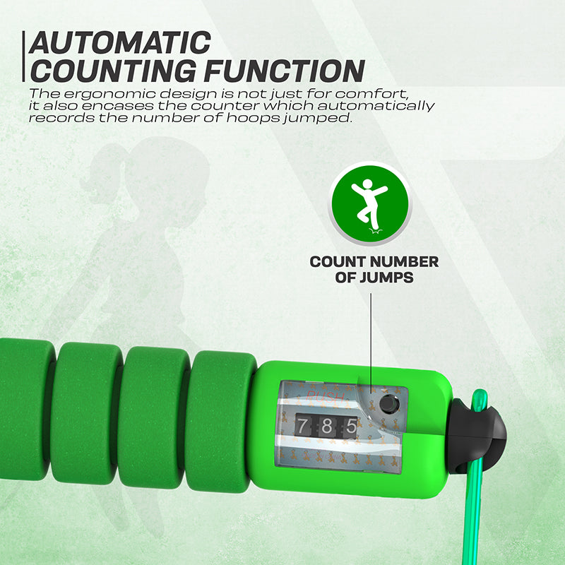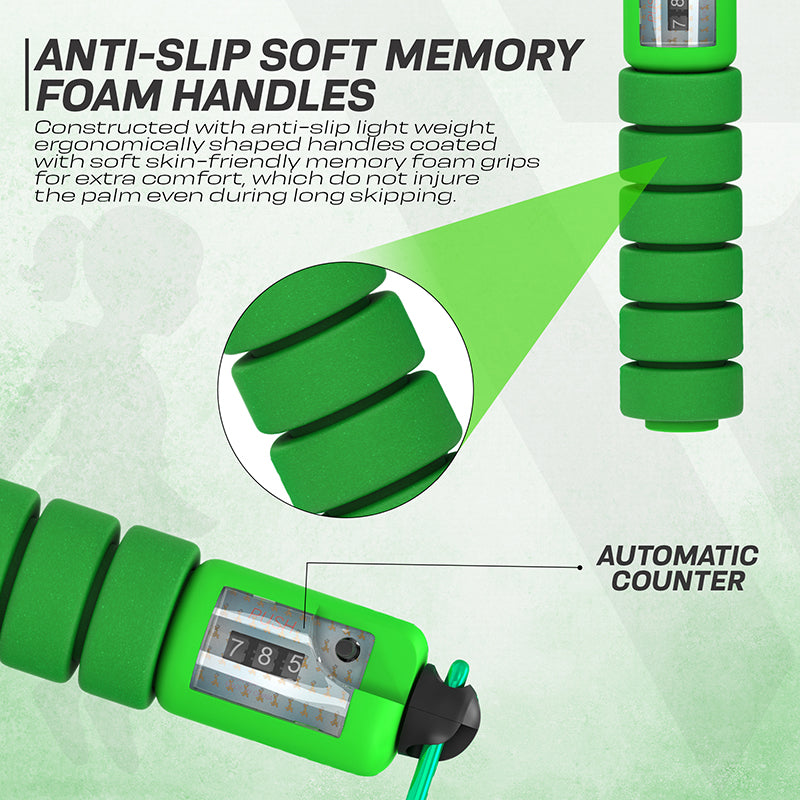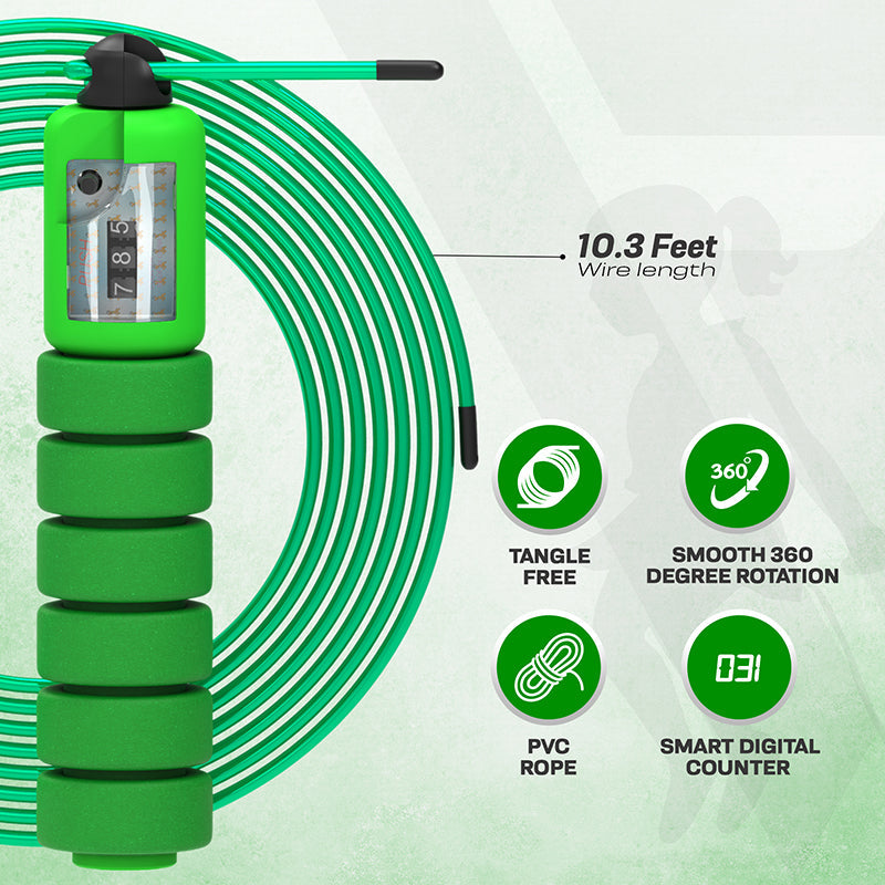 Promote a healthy mindset from the get-go by giving children the right tools from a young age to improve their overall health and fitness. The user-friendly design of RDX Kids Counter Jump Rope helps address the needs of kids who are starting to learn skipping rope. Simple yet functional counting skipping rope is a must-have for active kids and can be kept in home gyms for a fun adult skipping workout anytime.The soft cable is extremely forgiving on impact with little legs or heads, and yet durable enough to survive wear & tear against any kind of surface. Great for playgrounds and rope games in the backyard. The lightweight non-slip ABS plastic and memory foam coated handles sit comfortably in young hands without slipping and reduces resistance during rotations. So, now kids can have all the fun of skipping without pushing their bodies too hard and exhausting all of their energy. The integrated counter keeps track of each jump, encouraging healthy competition among young children. Let your kids build precious childhood memories and develop unbreakable bonds with friends as they challenge and cheer on each other to break the new skipping record. All the materials used in the making of our skipping rope for kids are eco-friendly making it safe to use even for children of young ages. Simply adjust the length of the 10.3 ft. jump rope according to the child's height without having to cut off excess PVC cable. Available in blue, green, red and black colour, with its own antimicrobial pouch for safekeeping and carrying anywhere along with a skipping rope style manual. The ideal gift for any active boy or girl.