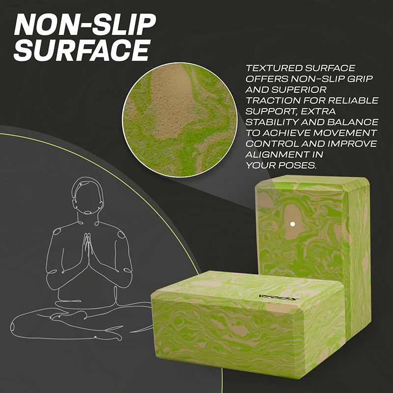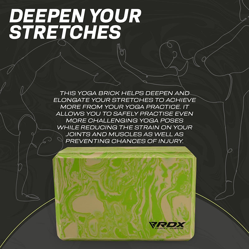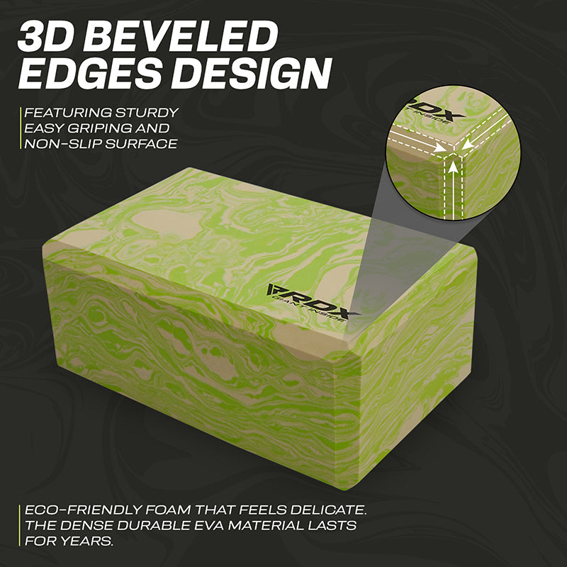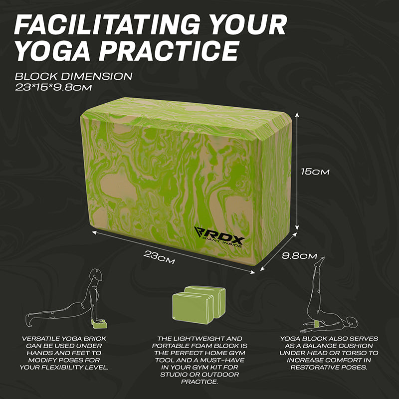 Add this optimally sized yoga block (23*15*9.8cm) to your home gym essential and yoga accessories for increased versatility in your practice. Made for beginner and intermediate yogis alike, this sturdy foam yoga block provides strong support for your bridge poses, and comfortable lift to perfect your alignment in the crescent moon stance. Add this optimally sized yoga block (23*15*9.8cm) to your home gym essential and yoga accessories for increased versatility in your practice. Cultivate healthy energy flow by bringing balance and alignment in your form and everyday life with the RDX EVA Foam' Green/White yoga blocks.Sturdy, high-density foam yoga block delivers exceptional strength to help prolong your poses and holds its position even under considerable weight. Eva foam material offers a non-abrasive surface that increases comfort while you flex and stretch out during practice, or ease-into restorative poses. Use the yoga brick under your hands and feet to deepen stretches, improve flexibility and modify poses to match your difficulty level. It also serves as meditation cushion under your head and torso to relax and ensure proper alignment. The soft block is gentler on the joints and muscles during arm balances and backbends, which reduces the strain on muscles and the chances of injury. Non-slip textured surface offers superior traction for the stability and balance needed in your practice to maintain control of movement and improve alignment. Slightly bevelled edges provide a firm and easy-grip surface so you can confidently conquer even the more advanced yoga poses. Get additional help by looking up poses from the included exercise manual. Lightweight and compact design facilitates block-assisted yoga practice anywhere whether it's in your room or under the shade of a giant oak tree. It also retains shape after all sorts of compressions for long-lasting durability.Choose the double colour yoga brick that matches your style to energize your routine and turn functional yoga into art.