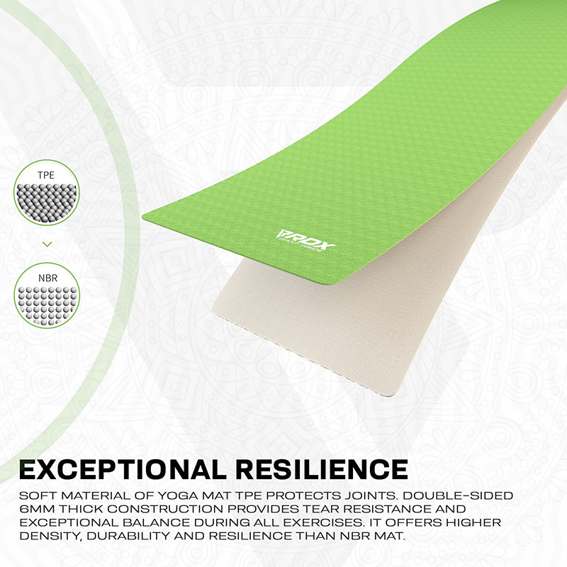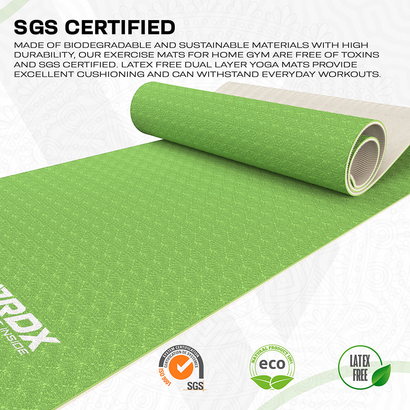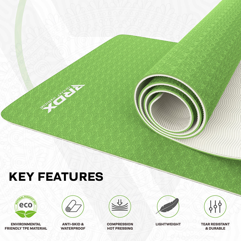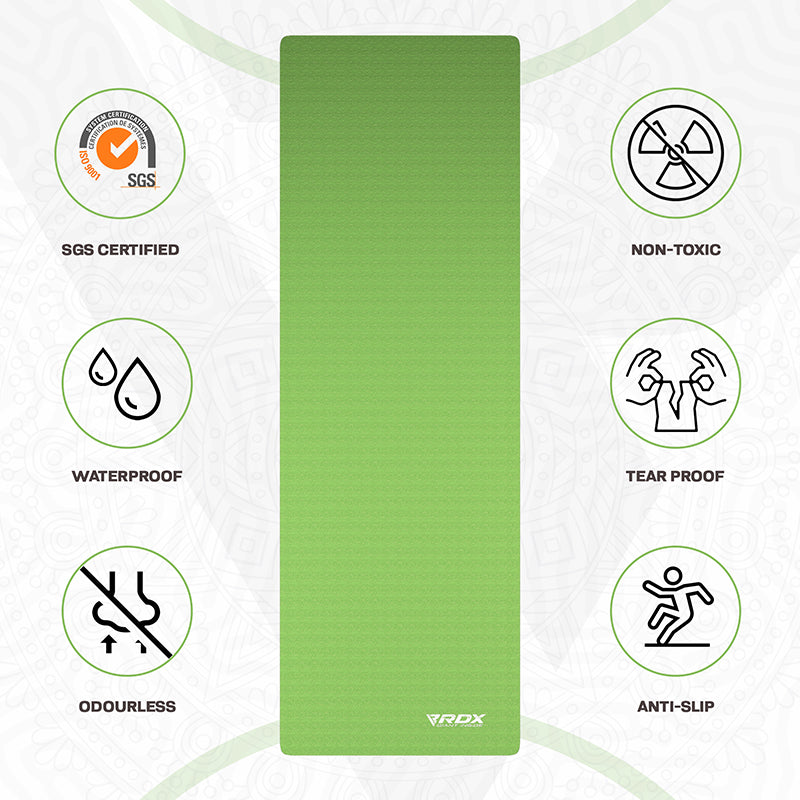 Begin your yogic journey by developing a sense of abundance and aligning your divine energy to discover perfect balance of mind, soul and body. RDX's extremely soft, non-slip texture, biodegradable TPE yoga mats offer comfort and security at an affordable, budget price. Our TPE Yoga Mats are SGS certified and free of toxins. High density, fine-textured foam top surface of 6mm thickness provides higher rebound resilience to these mats to protect joints and facilitate all types of workouts yoga, Pilates, physio or toning exercises.