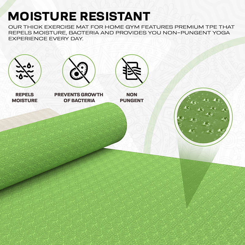 • MOISTURE RESISTANT- Our thick exercise mat for home gym features premium TPE that repels moisture, bacteria and provides you non-pungent yoga experience every day.