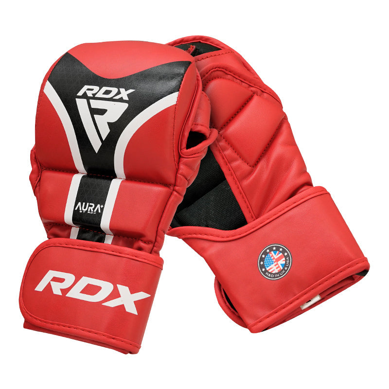 Experience ultimate durability and protection during intense grappling sessions with RDX's Grappling Gloves Shooter Aura Plus T-17. Crafted with Maya Hide leather Kalix Skin, these gloves feature highly absorbent 'IMF' technology moulded foam, EVA-Lution sheet, and REACH compliant Dazzle Fabric inner lining for breathability. The thumb is padded with EVA-Lution sheet for impact absorption, and the gloves have easy wearability and adjustability with the Quick-EZ hook and loop closure. Industrial grade stitching ensures longevity, and they are available in various sizes from S to XL.