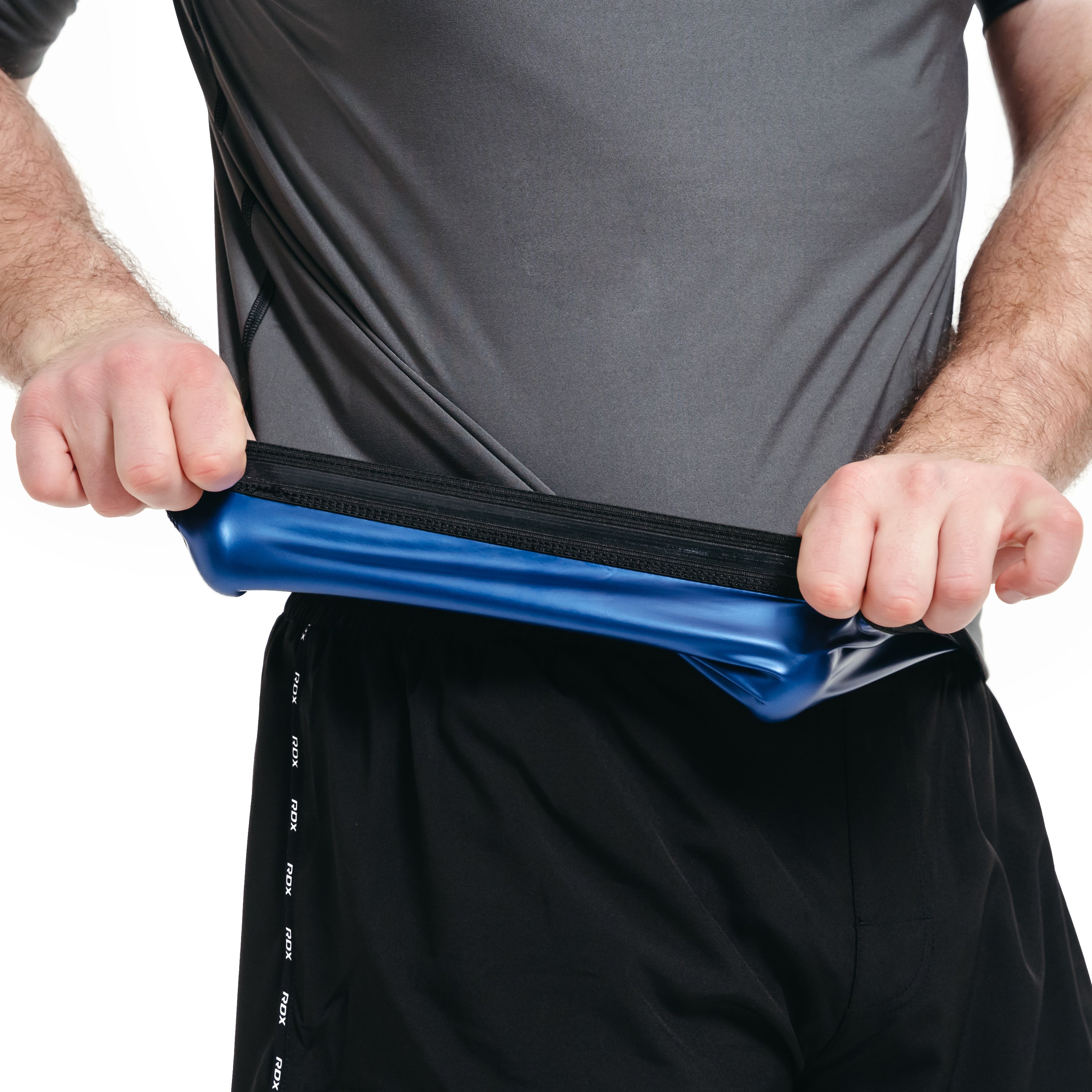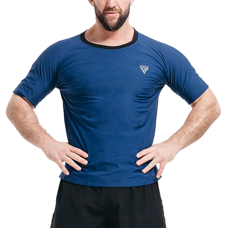 Unlock 5x sweat power with the RDXs latest sweat T shirt for men (REACH & OEKO-TEX 100 compliant). Heat Suit Tech's blue lining expedites your workout efficiency, sculpting your body along the way. Hugging fabric moves freely, reflective bits keep you seen, and anti-slip grip stays put. From walks to sprints, conquer it all in comfort.