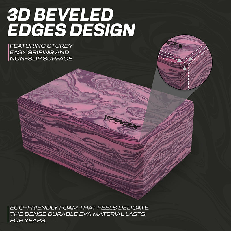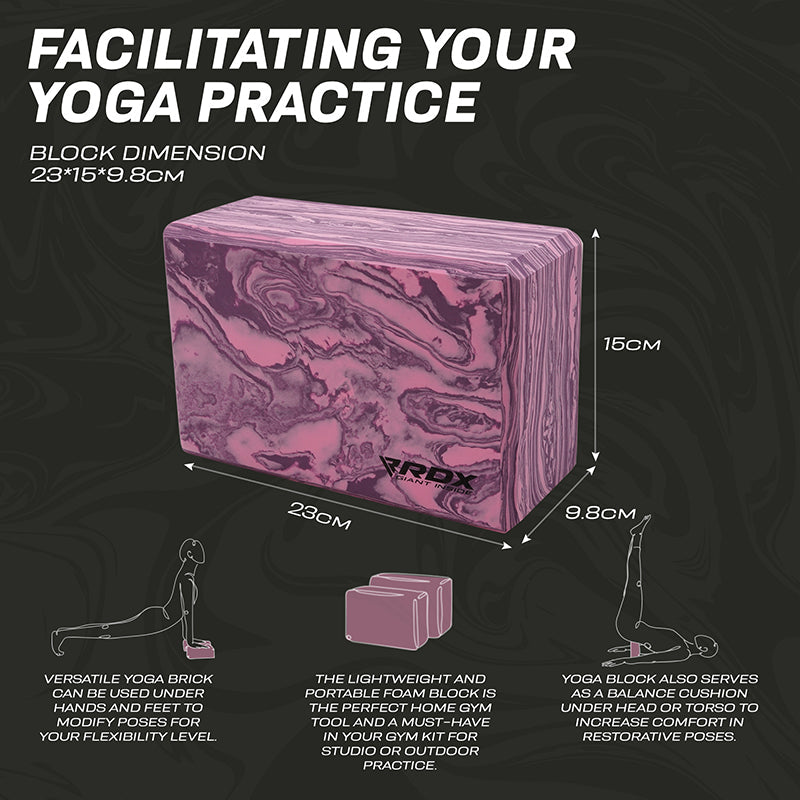 Add this optimally sized yoga block (23*15*9.8cm) to your home gym essential and yoga accessories for increased versatility in your practice. Made for beginner and intermediate yogis alike, this sturdy foam yoga block provides strong support for your bridge poses, and comfortable lift to perfect your alignment in the crescent moon stance. Add this optimally sized yoga block (23*15*9.8cm) to your home gym essential and yoga accessories for increased versatility in your practice. Cultivate healthy energy flow by bringing balance and alignment in your form and everyday life with the RDX EVA Foam Maroon/pink yoga blocks.Sturdy, high-density foam yoga block delivers exceptional strength to help prolong your poses and holds its position even under considerable weight. Eva foam material offers a non-abrasive surface that increases comfort while you flex and stretch out during practice, or ease-into restorative poses. Use the yoga brick under your hands and feet to deepen stretches, improve flexibility and modify poses to match your difficulty level. It also serves as meditation cushion under your head and torso to relax and ensure proper alignment. The soft block is gentler on the joints and muscles during arm balances and backbends, which reduces the strain on muscles and the chances of injury. Non-slip textured surface offers superior traction for the stability and balance needed in your practice to maintain control of movement and improve alignment. Slightly bevelled edges provide a firm and easy-grip surface so you can confidently conquer even the more advanced yoga poses. Get additional help by looking up poses from the included exercise manual. Lightweight and compact design facilitates block-assisted yoga practice anywhere whether it's in your room or under the shade of a giant oak tree. It also retains shape after all sorts of compressions for long-lasting durability.Choose the double colour yoga brick that matches your style to energize your routine and turn functional yoga into art.
