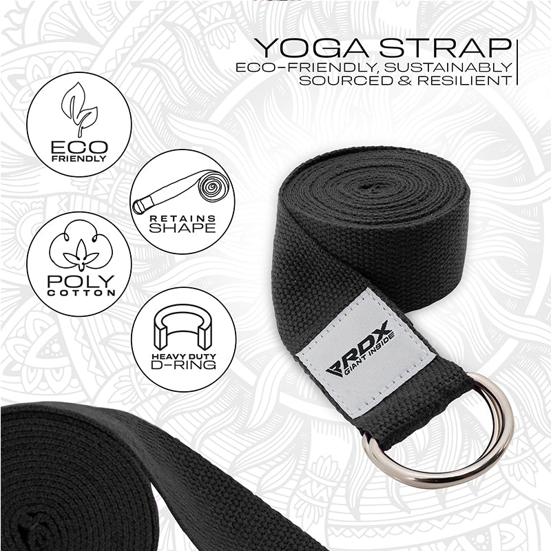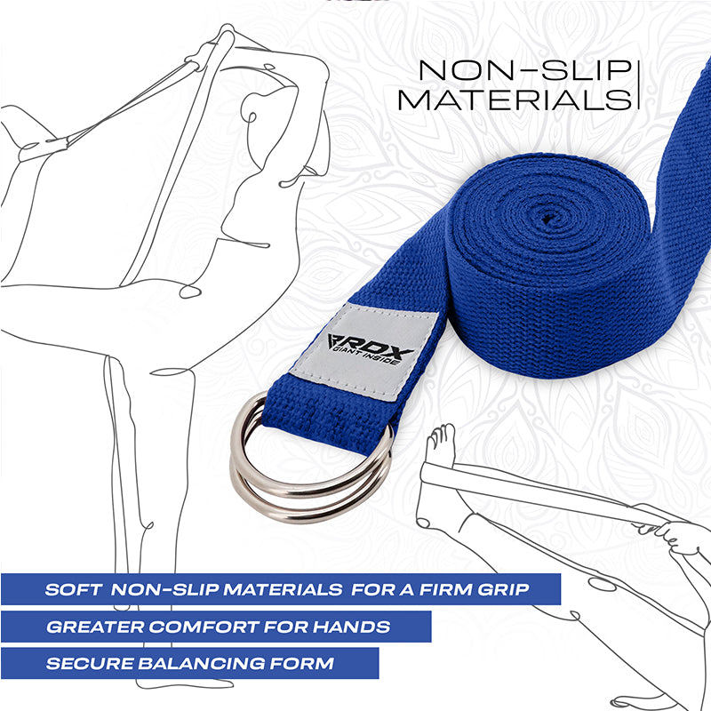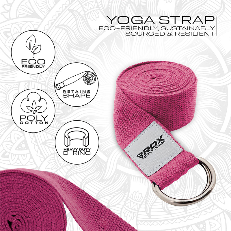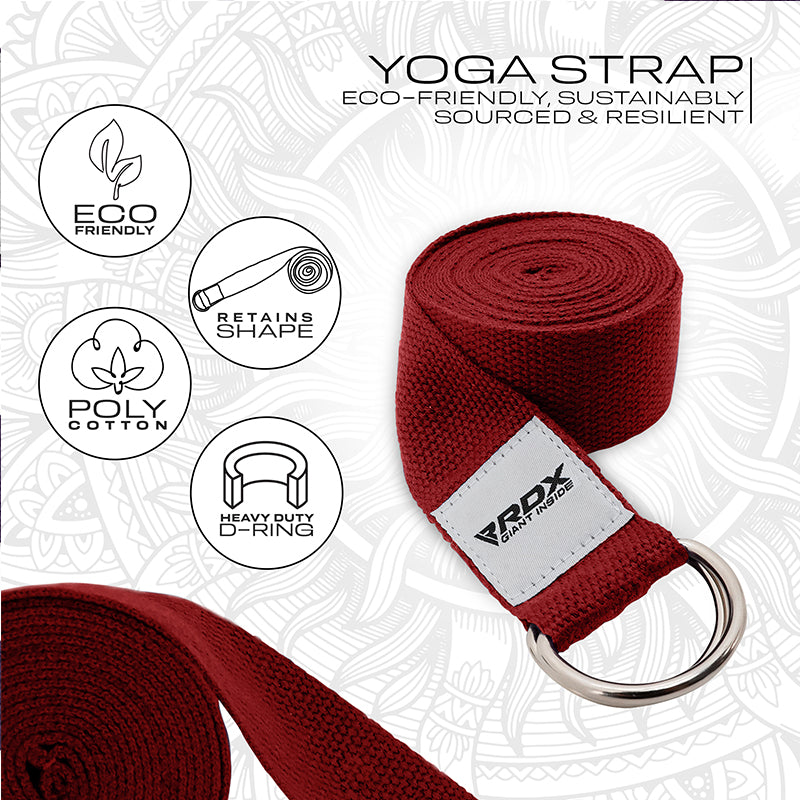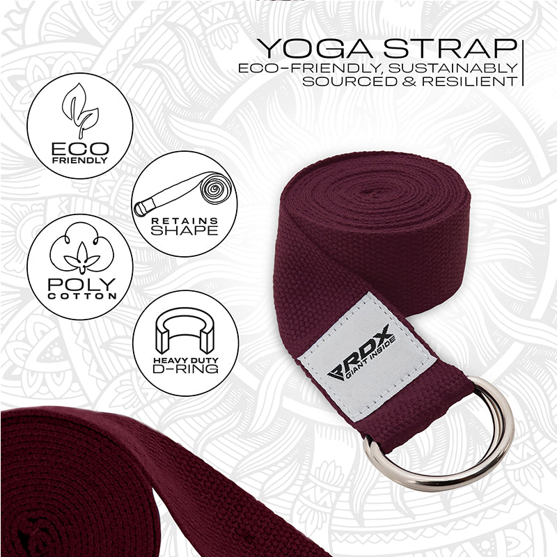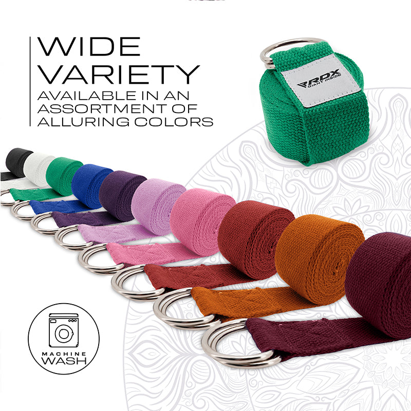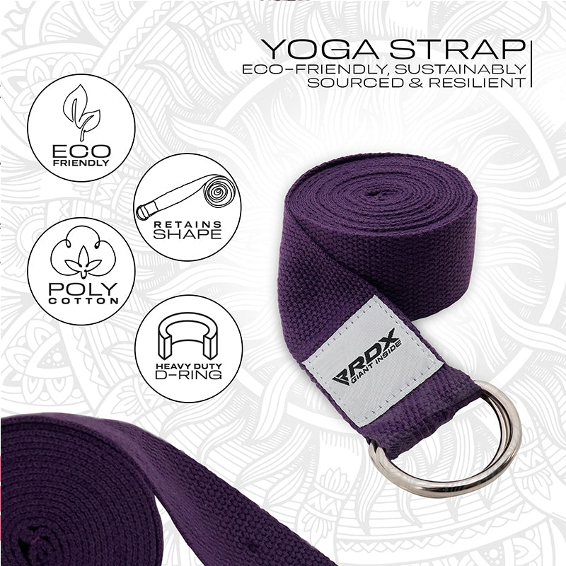Bridge the gap between your current fitness workout and yoga goals with RDX's eco-friendly Yoga Straps. Deepen your yoga practice and maximize your performance by challenging flexibility, strength and endurance with this versatile yoga accessory.Made from thick and sturdy premium poly-cotton that is sustainably sourced and holds firm to give you confidence for extending reach and improving mobility in more challenging poses. Our stretching strap is easy to use and simple enough to tie up for your use, allowing you to grab limbs that would be otherwise challenging. Adjustable 8ft long loop strap conforms to perfect alignment of shoulders and back, or stretch out muscles of legs and arms for unlimited yoga poses. Ideally endorsed with 3.8cm width and 0.13cm thickness, our yoga strap is perfect for physical therapy and rehabilitation, yoga exercises at home, Pilates or athletic warm-ups at the gym. Made with soft materials with adjustable double D rings which are rust-proof and unbreakable. A must-have in your yoga kit for studio practice or working out at your home gym. Our easily machine washable yoga stretch strap offers convenience of use and non-slip grip for sweaty hands during intense workouts. Capable of withstanding wear-and-tear from daily, vigorous routines. Comes with a carry bag and exercise manual so you won't miss any workout day. Pick the colour that matches your style.