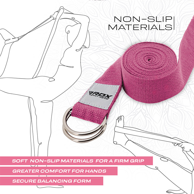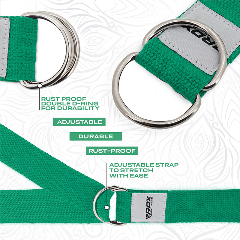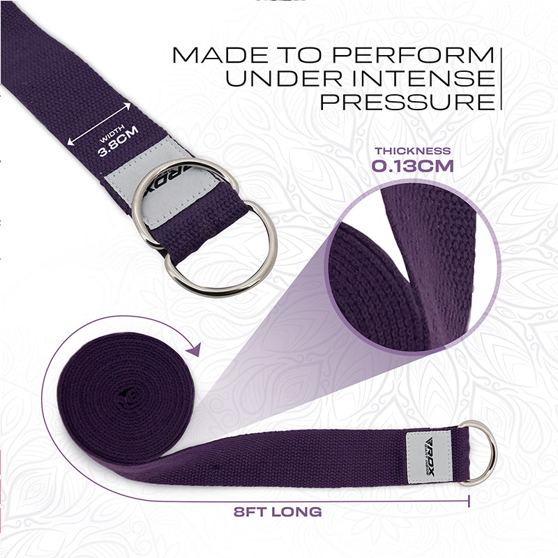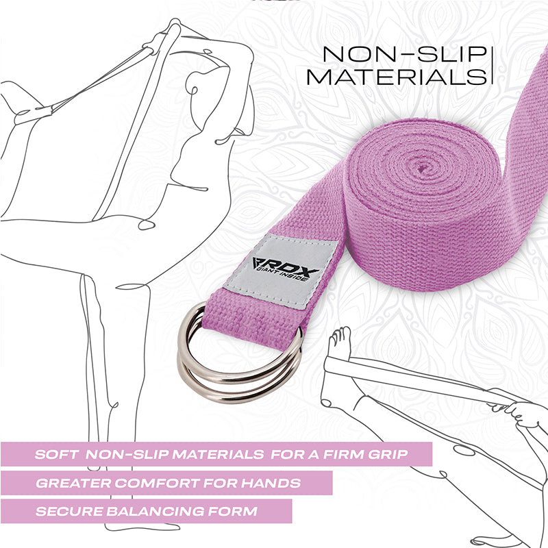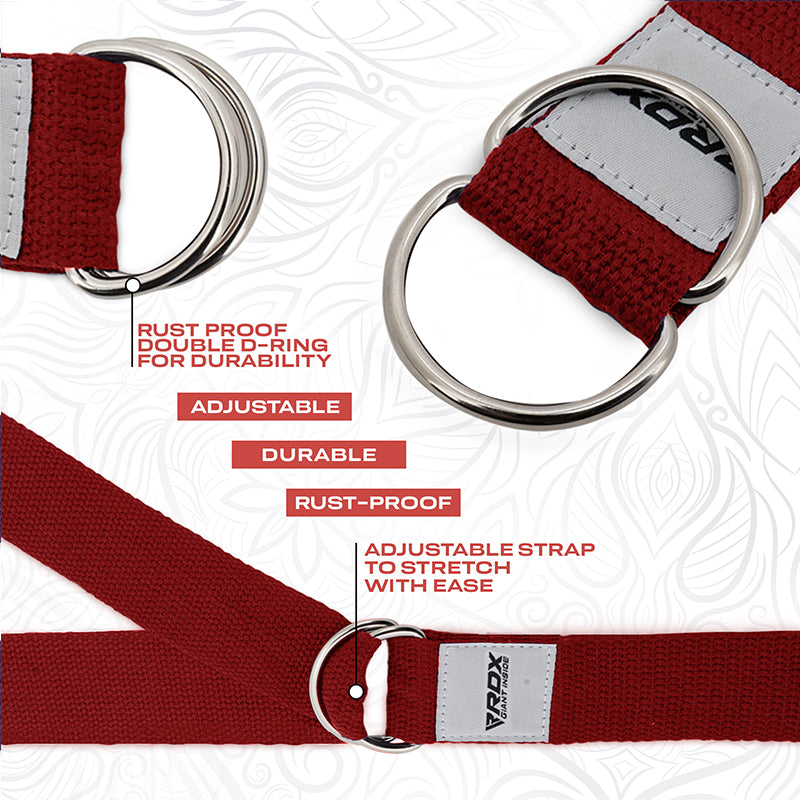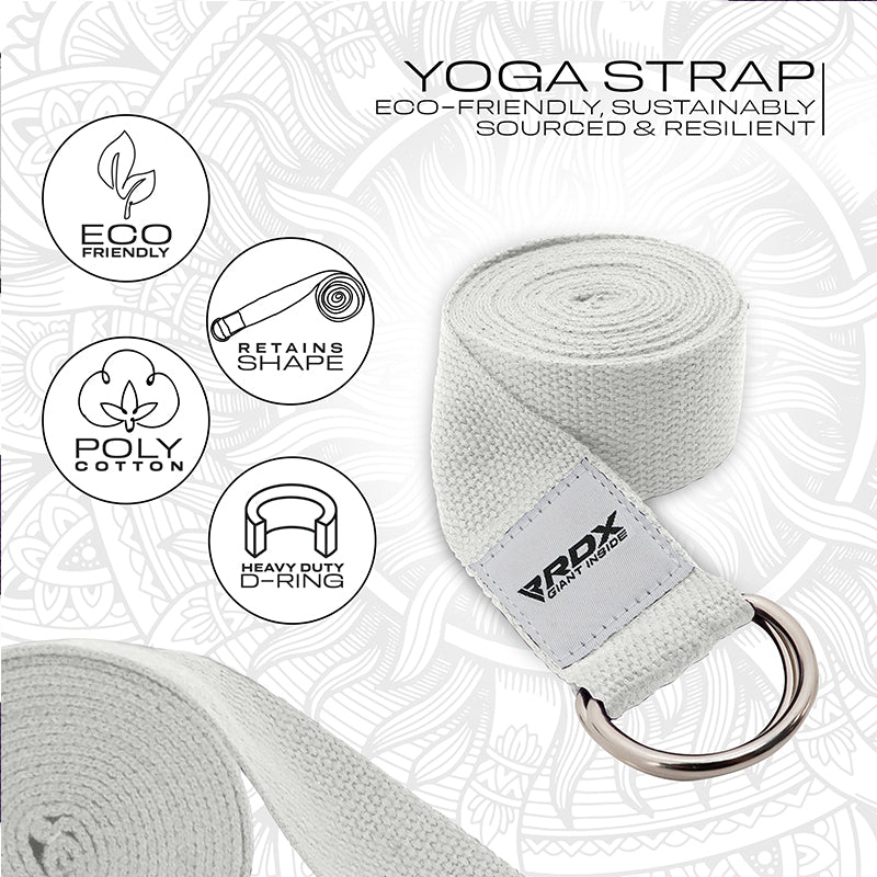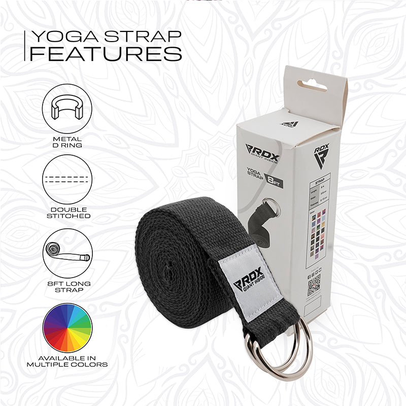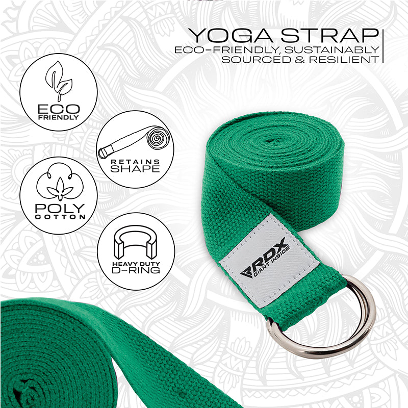 Bridge the gap between your current fitness workout and yoga goals with RDX's eco-friendly Yoga Straps. Deepen your yoga practice and maximize your performance by challenging flexibility, strength and endurance with this versatile yoga accessory.Made from thick and sturdy premium poly-cotton that is sustainably sourced and holds firm to give you confidence for extending reach and improving mobility in more challenging poses. Our stretching strap is easy to use and simple enough to tie up for your use, allowing you to grab limbs that would be otherwise challenging. Adjustable 8ft long loop strap conforms to perfect alignment of shoulders and back, or stretch out muscles of legs and arms for unlimited yoga poses. Ideally endorsed with 3.8cm width and 0.13cm thickness, our yoga strap is perfect for physical therapy and rehabilitation, yoga exercises at home, Pilates or athletic warm-ups at the gym. Made with soft materials with adjustable double D rings which are rust-proof and unbreakable. A must-have in your yoga kit for studio practice or working out at your home gym. Our easily machine washable yoga stretch strap offers convenience of use and non-slip grip for sweaty hands during intense workouts. Capable of withstanding wear-and-tear from daily, vigorous routines. Comes with a carry bag and exercise manual so you won't miss any workout day. Pick the colour that matches your style.