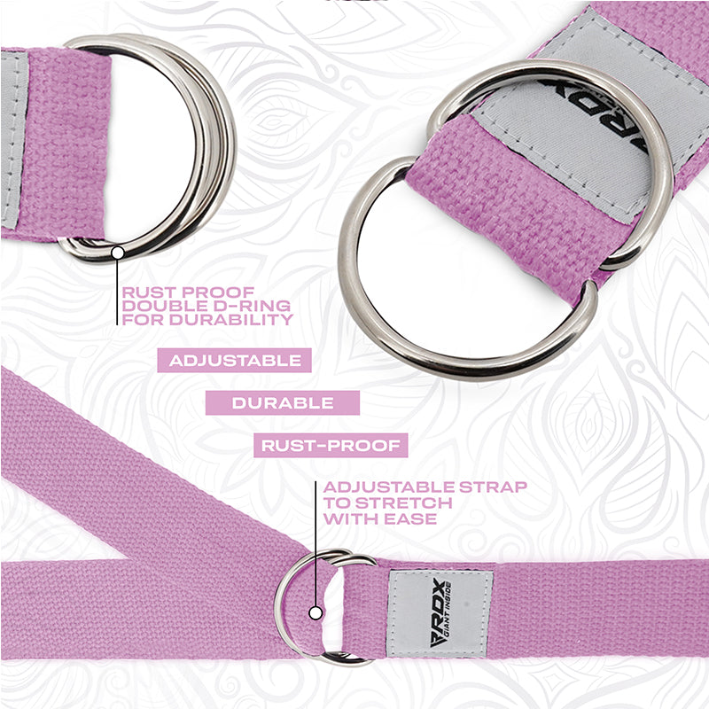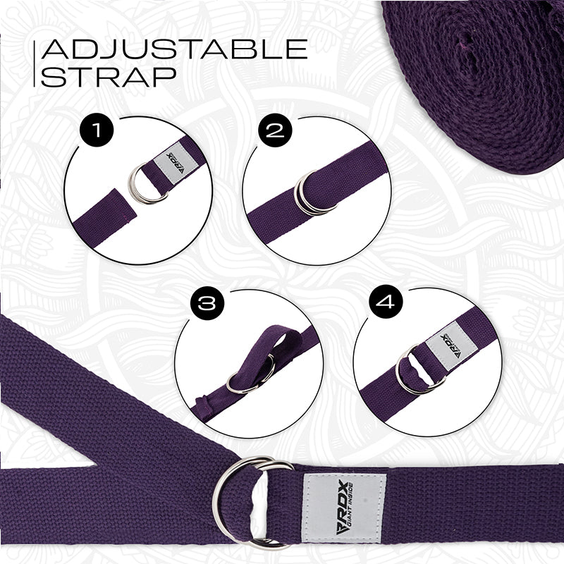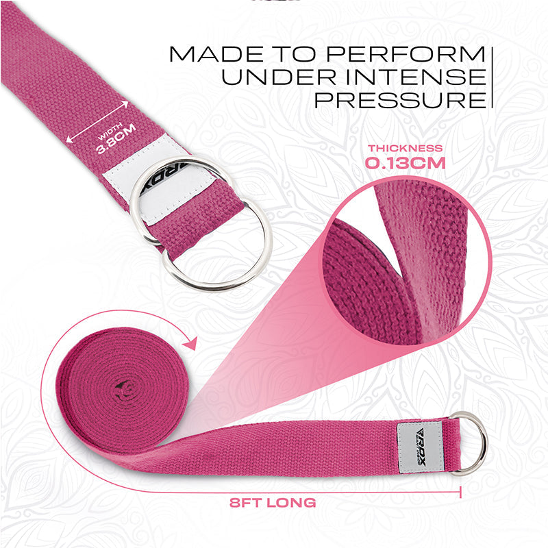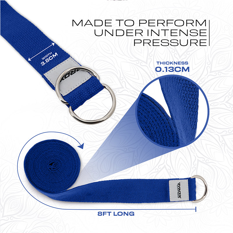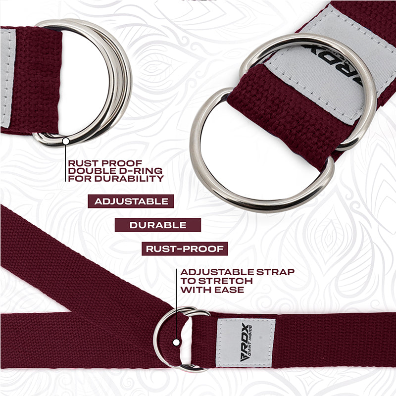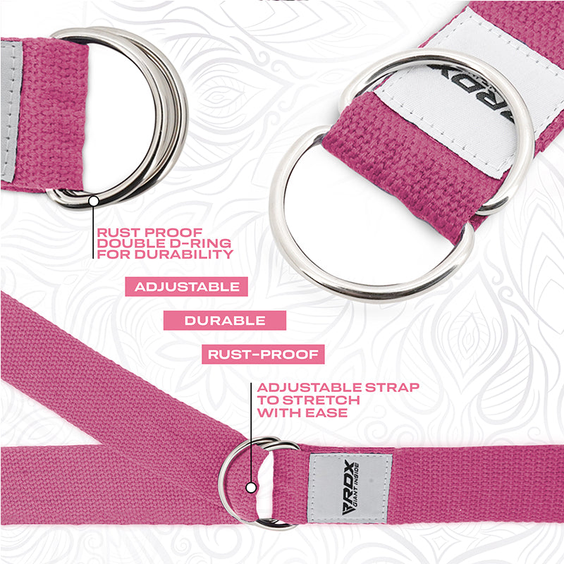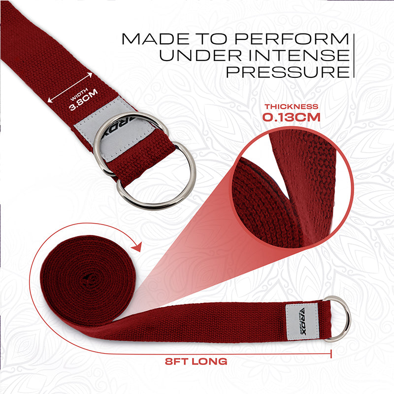Bridge the gap between your current fitness workout and yoga goals with RDX's eco-friendly Yoga Straps. Deepen your yoga practice and maximize your performance by challenging flexibility, strength and endurance with this versatile yoga accessory.Made from thick and sturdy premium poly-cotton that is sustainably sourced and holds firm to give you confidence for extending reach and improving mobility in more challenging poses. Our stretching strap is easy to use and simple enough to tie up for your use, allowing you to grab limbs that would be otherwise challenging. Adjustable 8ft long loop strap conforms to perfect alignment of shoulders and back, or stretch out muscles of legs and arms for unlimited yoga poses. Ideally endorsed with 3.8cm width and 0.13cm thickness, our yoga strap is perfect for physical therapy and rehabilitation, yoga exercises at home, Pilates or athletic warm-ups at the gym. Made with soft materials with adjustable double D rings which are rust-proof and unbreakable. A must-have in your yoga kit for studio practice or working out at your home gym. Our easily machine washable yoga stretch strap offers convenience of use and non-slip grip for sweaty hands during intense workouts. Capable of withstanding wear-and-tear from daily, vigorous routines. Comes with a carry bag and exercise manual so you won't miss any workout day. Pick the colour that matches your style.