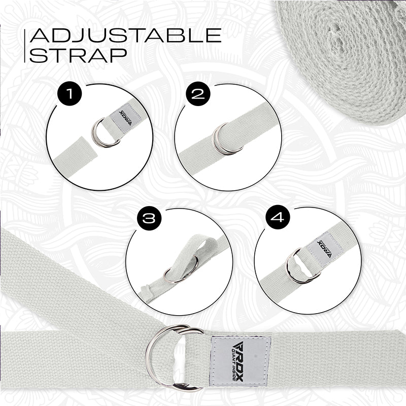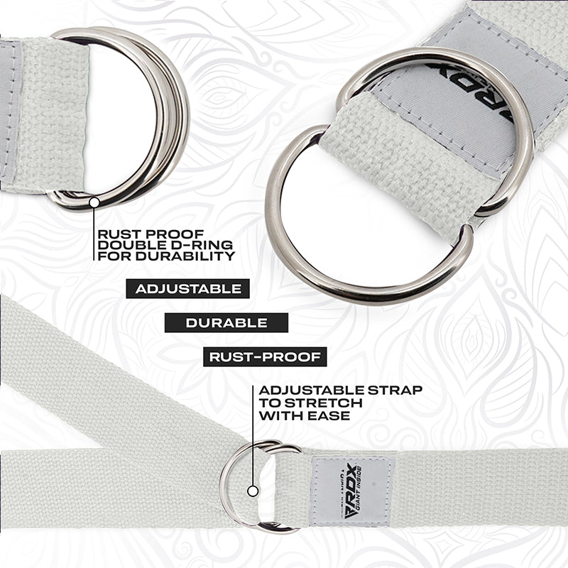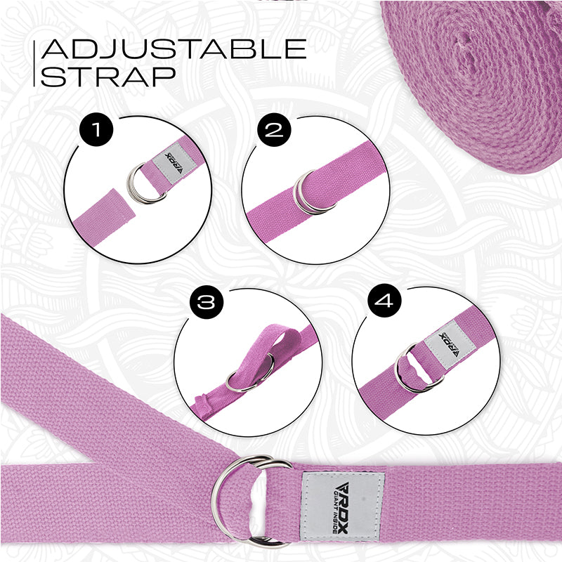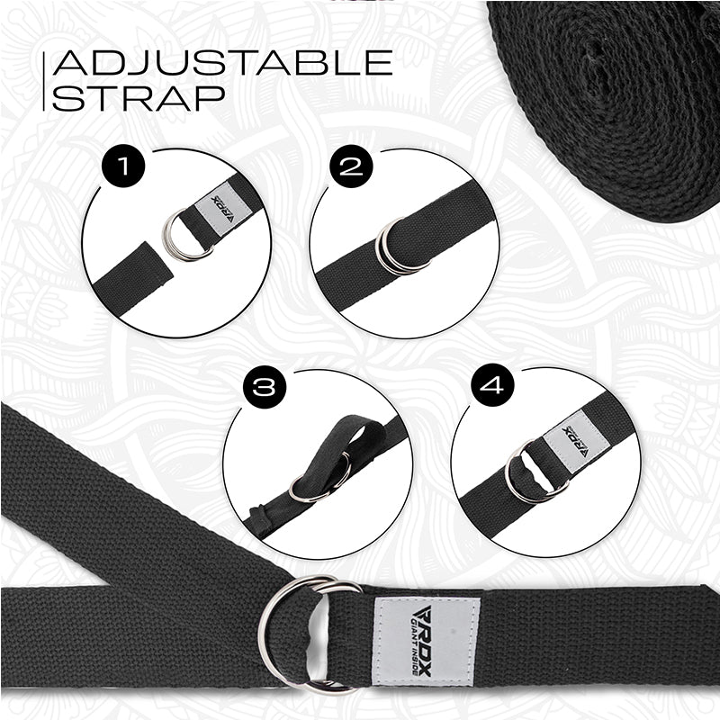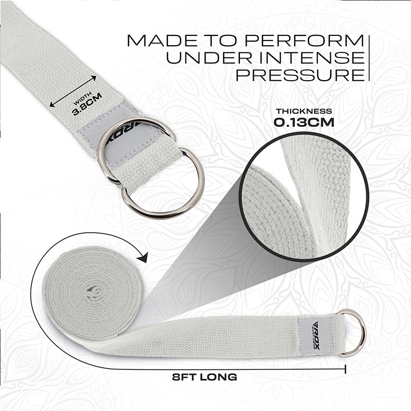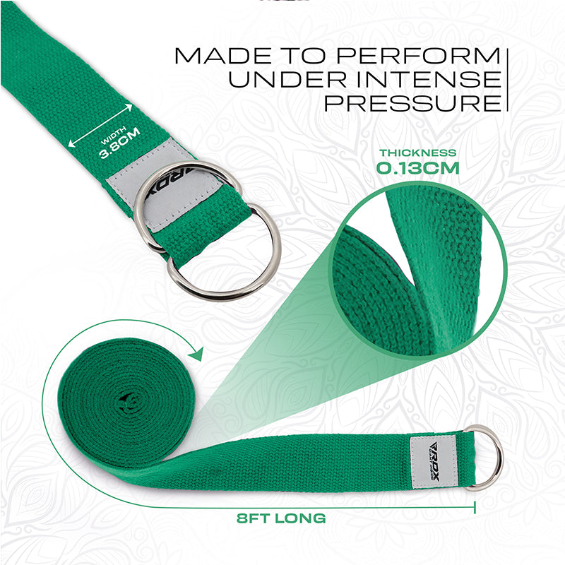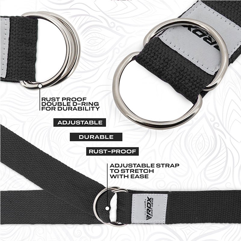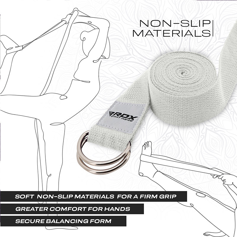 Bridge the gap between your current fitness workout and yoga goals with RDX's eco-friendly Yoga Straps. Deepen your yoga practice and maximize your performance by challenging flexibility, strength and endurance with this versatile yoga accessory.Made from thick and sturdy premium poly-cotton that is sustainably sourced and holds firm to give you confidence for extending reach and improving mobility in more challenging poses. Our stretching strap is easy to use and simple enough to tie up for your use, allowing you to grab limbs that would be otherwise challenging. Adjustable 8ft long loop strap conforms to perfect alignment of shoulders and back, or stretch out muscles of legs and arms for unlimited yoga poses. Ideally endorsed with 3.8cm width and 0.13cm thickness, our yoga strap is perfect for physical therapy and rehabilitation, yoga exercises at home, Pilates or athletic warm-ups at the gym. Made with soft materials with adjustable double D rings which are rust-proof and unbreakable. A must-have in your yoga kit for studio practice or working out at your home gym. Our easily machine washable yoga stretch strap offers convenience of use and non-slip grip for sweaty hands during intense workouts. Capable of withstanding wear-and-tear from daily, vigorous routines. Comes with a carry bag and exercise manual so you won't miss any workout day. Pick the colour that matches your style.