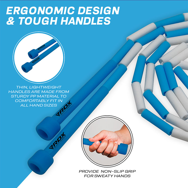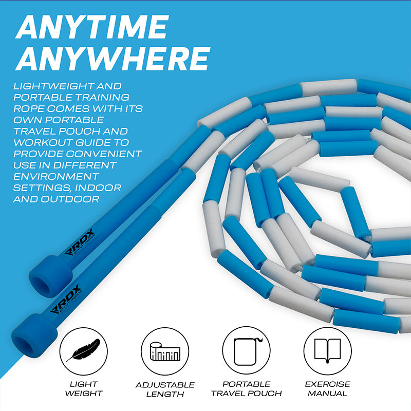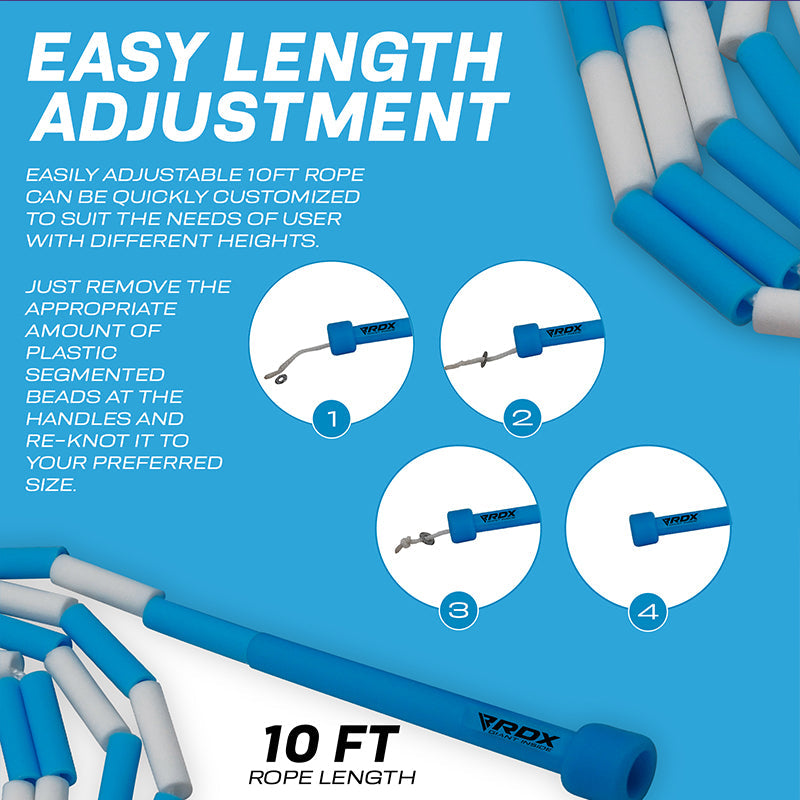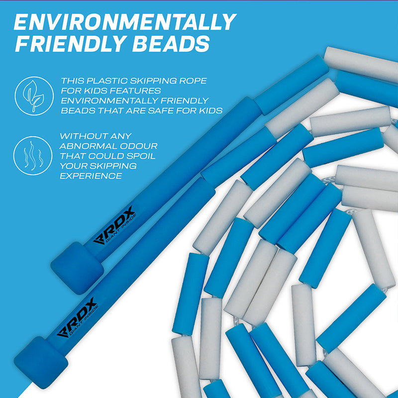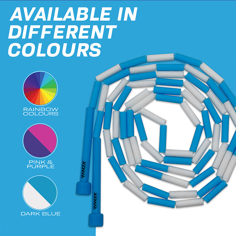 Give your kid the opportunity to make new childhood memories, enjoying an endless amount of outdoors fun with this quirky skipping rope. Our segmented Kids Jump Rope is creatively shaped with colourful plastic segments to inspire imaginative play and help kids create fun, new recreational jump rope routines.Made from premium quality materials and environmentally friendly plastic segments that are safe for kids use, free from any obtrusive odour and soft on the skin. Shatterproof plastic segmented rope is built to survive rough use and adds weight to the durable, braided-nylon, tangle-free cable to help achieve smooth rotation at high speeds. Ergonomic handles provide comfortable, non-slip grip for all hand sizes. Lightweight segmented rope construction effectively reduces resistance for easy skipping and is made portable for convenient use anywhere indoors or to carry outdoors in its own antimicrobial bag with included workout guide. Easily adjustable, 10ft segmented skipping rope can be shortened at the handle by taking out segmented pieces and re-knotting to modify size for your preferred height, which makes it suitable for all ages including children, teenagers, adults and elders.The user-friendly design encourages a lively outlook to physical education and promotes mass participation in schools and by junior sports teams. Perfect as a sports skipping rope, school jump rope, fun home gym equipment or hard-wearing plastic playground skipping rope for kids. Colourful jump rope options (in pink and purple, blue and white, and rainbow combinations) maximize the fun of kids' jump rope games, and are suitable for both boys and girls.