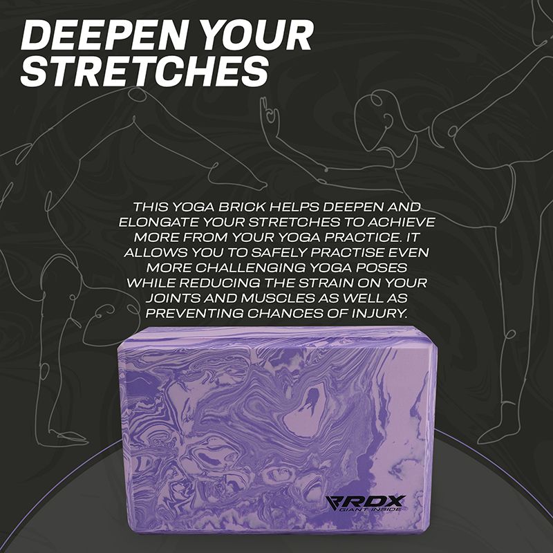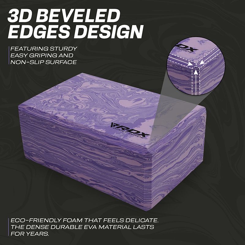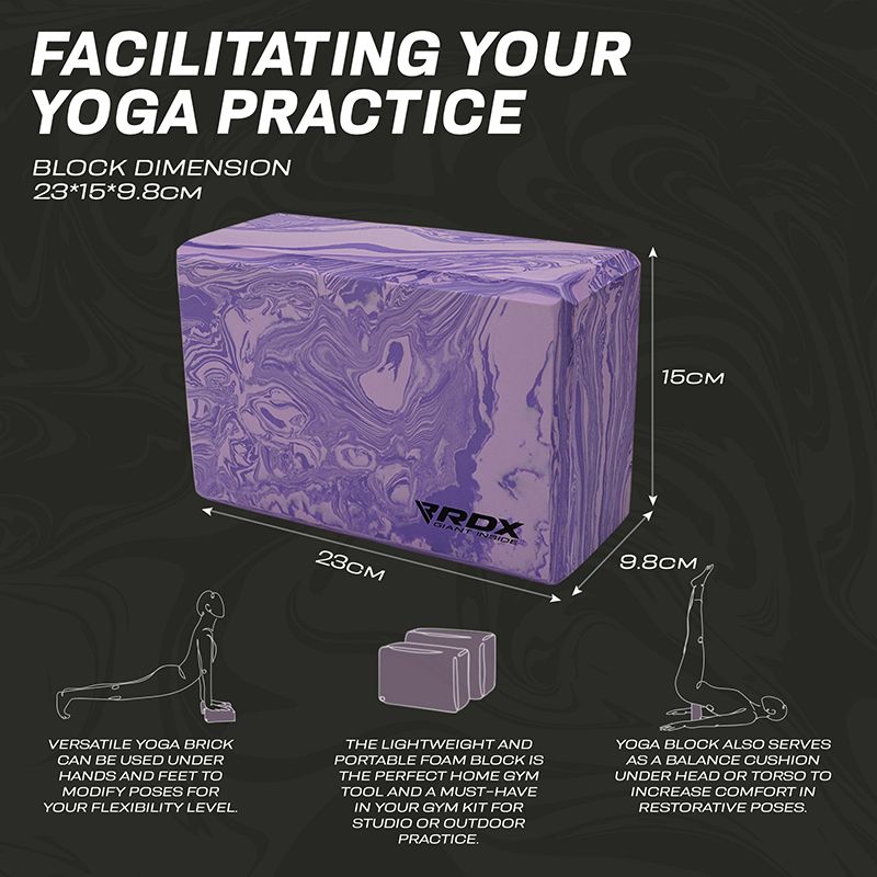 Add this optimally sized yoga block (23*15*9.8cm) to your home gym essential and yoga accessories for increased versatility in your practice. Made for beginner and intermediate yogis alike, this sturdy foam yoga block provides strong support for your bridge poses, and comfortable lift to perfect your alignment in the crescent moon stance. Add this optimally sized yoga block (23*15*9.8cm) to your home gym essential and yoga accessories for increased versatility in your practice. Cultivate healthy energy flow by bringing balance and alignment in your form and everyday life with the RDX EVA Foam Purple/Grey yoga blocks.Sturdy, high-density foam yoga block delivers exceptional strength to help prolong your poses and holds its position even under considerable weight. Eva foam material offers a non-abrasive surface that increases comfort while you flex and stretch out during practice, or ease-into restorative poses. Use the yoga brick under your hands and feet to deepen stretches, improve flexibility and modify poses to match your difficulty level. It also serves as meditation cushion under your head and torso to relax and ensure proper alignment. The soft block is gentler on the joints and muscles during arm balances and backbends, which reduces the strain on muscles and the chances of injury. Non-slip textured surface offers superior traction for the stability and balance needed in your practice to maintain control of movement and improve alignment. Slightly bevelled edges provide a firm and easy-grip surface so you can confidently conquer even the more advanced yoga poses. Get additional help by looking up poses from the included exercise manual. Lightweight and compact design facilitates block-assisted yoga practice anywhere whether it's in your room or under the shade of a giant oak tree. It also retains shape after all sorts of compressions for long-lasting durability.