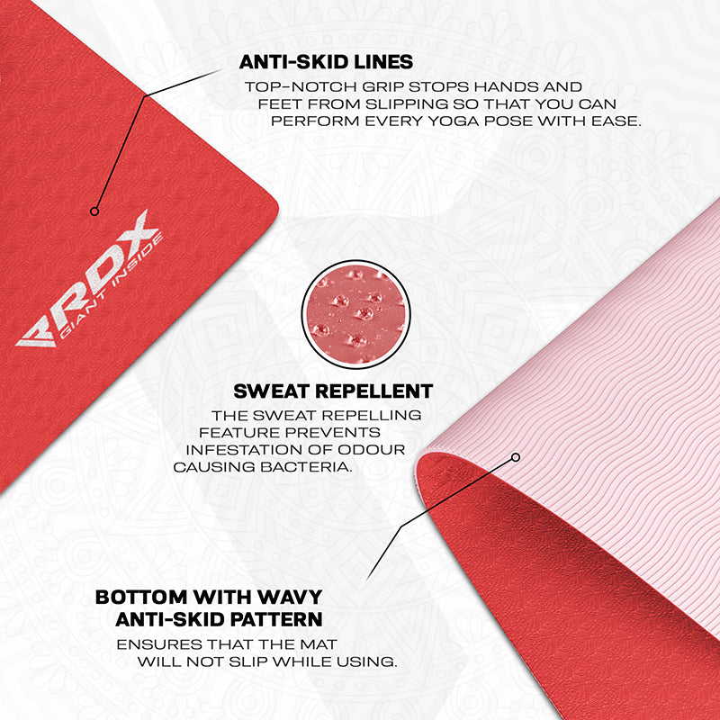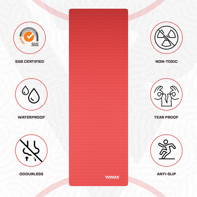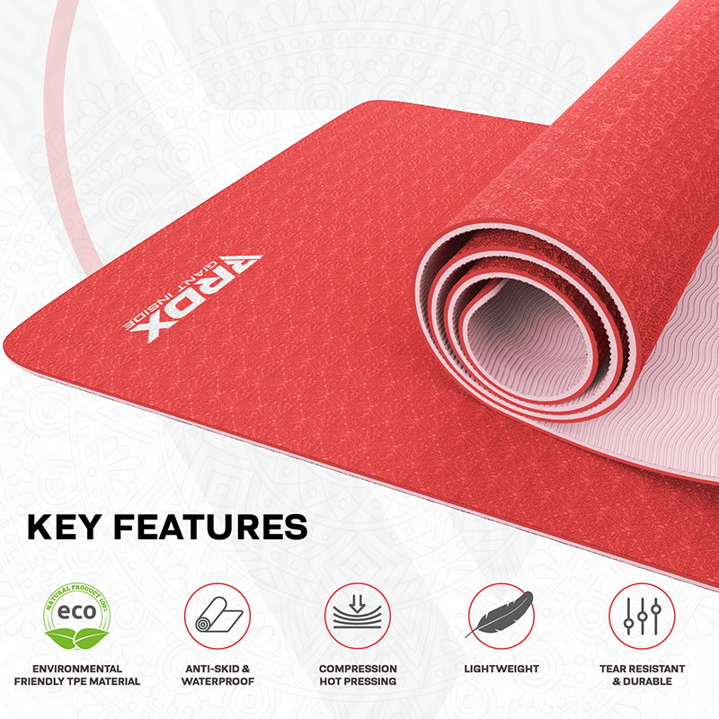 Begin your yogic journey by developing a sense of abundance and aligning your divine energy to discover perfect balance of mind, soul and body. RDX's extremely soft, non-slip texture, biodegradable TPE yoga mats offer comfort and security at an affordable, budget price. Our TPE Yoga Mats are SGS certified and free of toxins. High density, fine-textured foam top surface of 6mm thickness provides higher rebound resilience to these mats to protect joints and facilitate all types of workouts yoga, Pilates, physio or toning exercises.