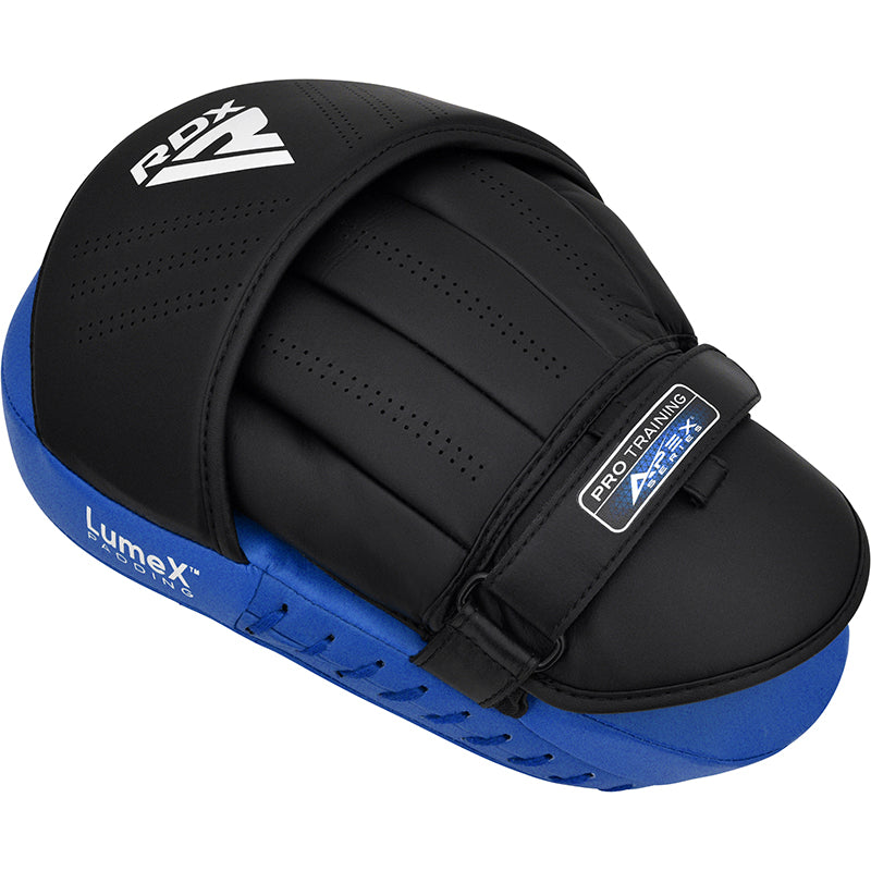 Train to give your best performance with the APEX focus pads by RDX. Designed with LumeXTM padding technology to handle intense punching during grueling practice sessions. Super skin engineered leather used on the outer surface makes these pads for boxing wear and tear resistant and helps to retain the original shape. The ergonomic palm dome design with grip ball assists in handling heavy strikes during MMA and boxing training.Suede leather lining on top of the grip ball corrects the hand positioning and allows a firm grip during focus pad training. Spongy Blacktop Fabric at knuckles creates a comfortable environment for the hand. Compressed EVA-LUTIONTM SHEET in the front and infused shock dispersion sheet at the back provide shock resistance and adequate protection to the palm and hand. Sides covered with SpongeX padding leave no room for hand fatigue and injuries in the RDX focus mitts.