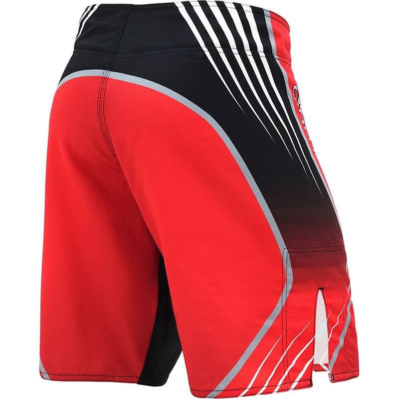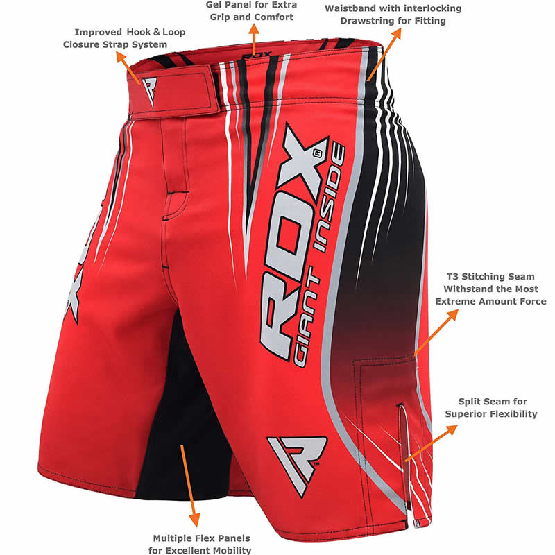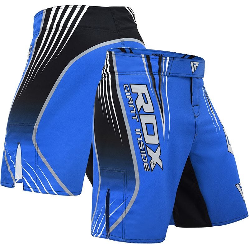 Train like a beast in the new RDX MMA shorts with a spandex flex panel thats designed for maximum flexibility. Coupled with side slits, these fighting shorts are perfect for agile fighters wanting to practice their high kicks. T-3 stitching fortifies the seams with tear-resistant durability while the premium polyester material feels comfortable against the skin and keeps moisture at bay. The shorts also feature a small inner pocket to stow away your mouth guard or other items between rounds. Secure the shorts in place with the help of the dual hook-and-loop closure and interlocking drawstring for a perfect fit.